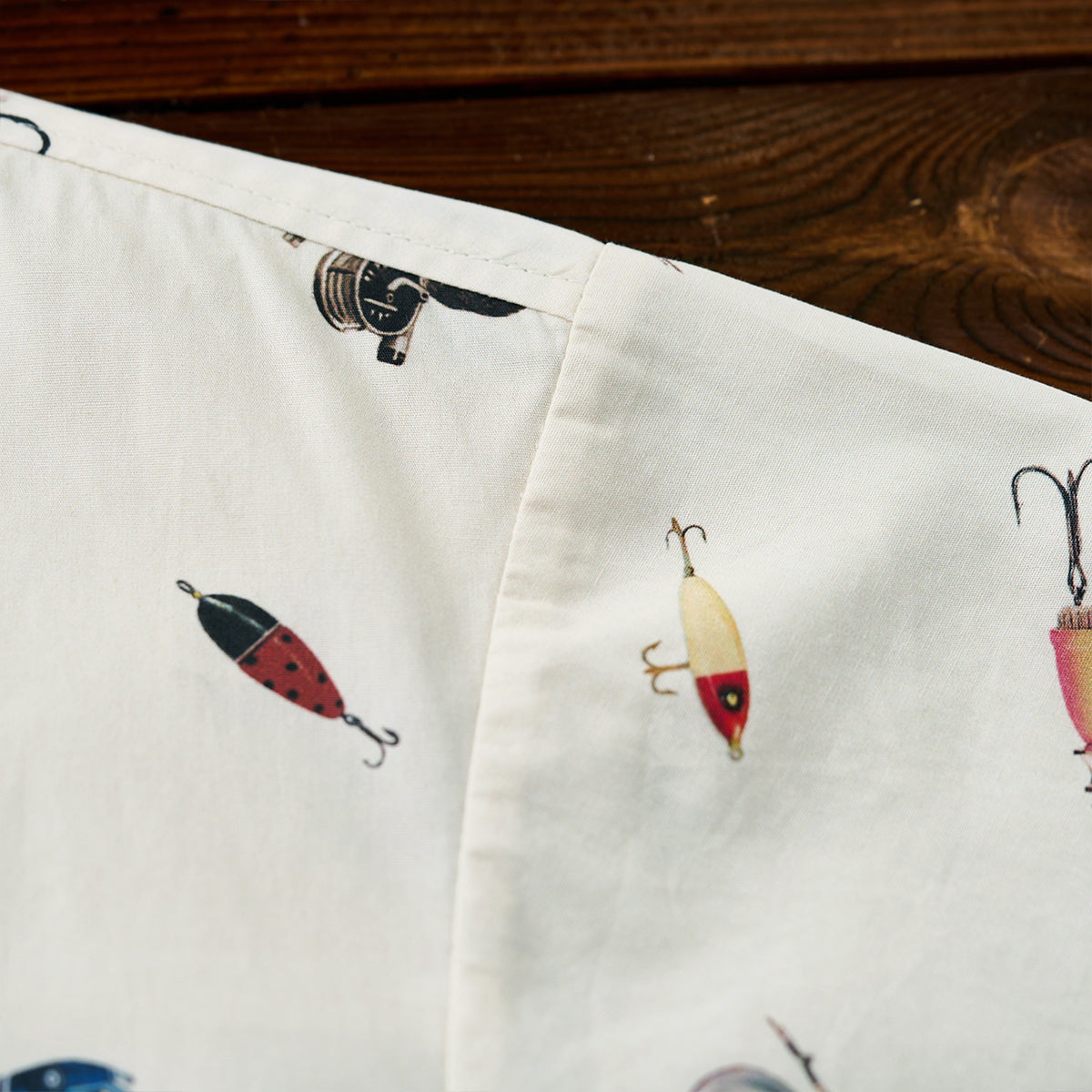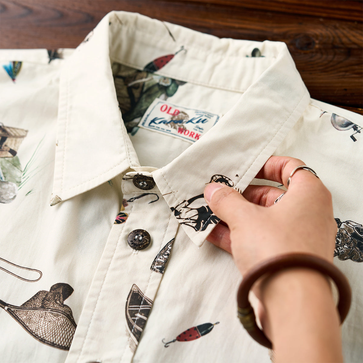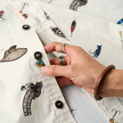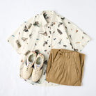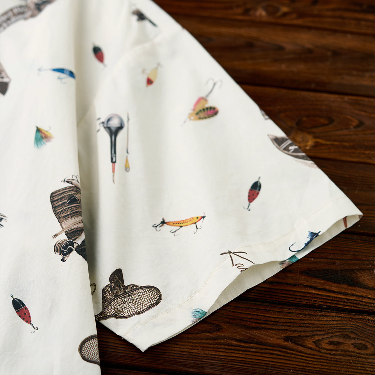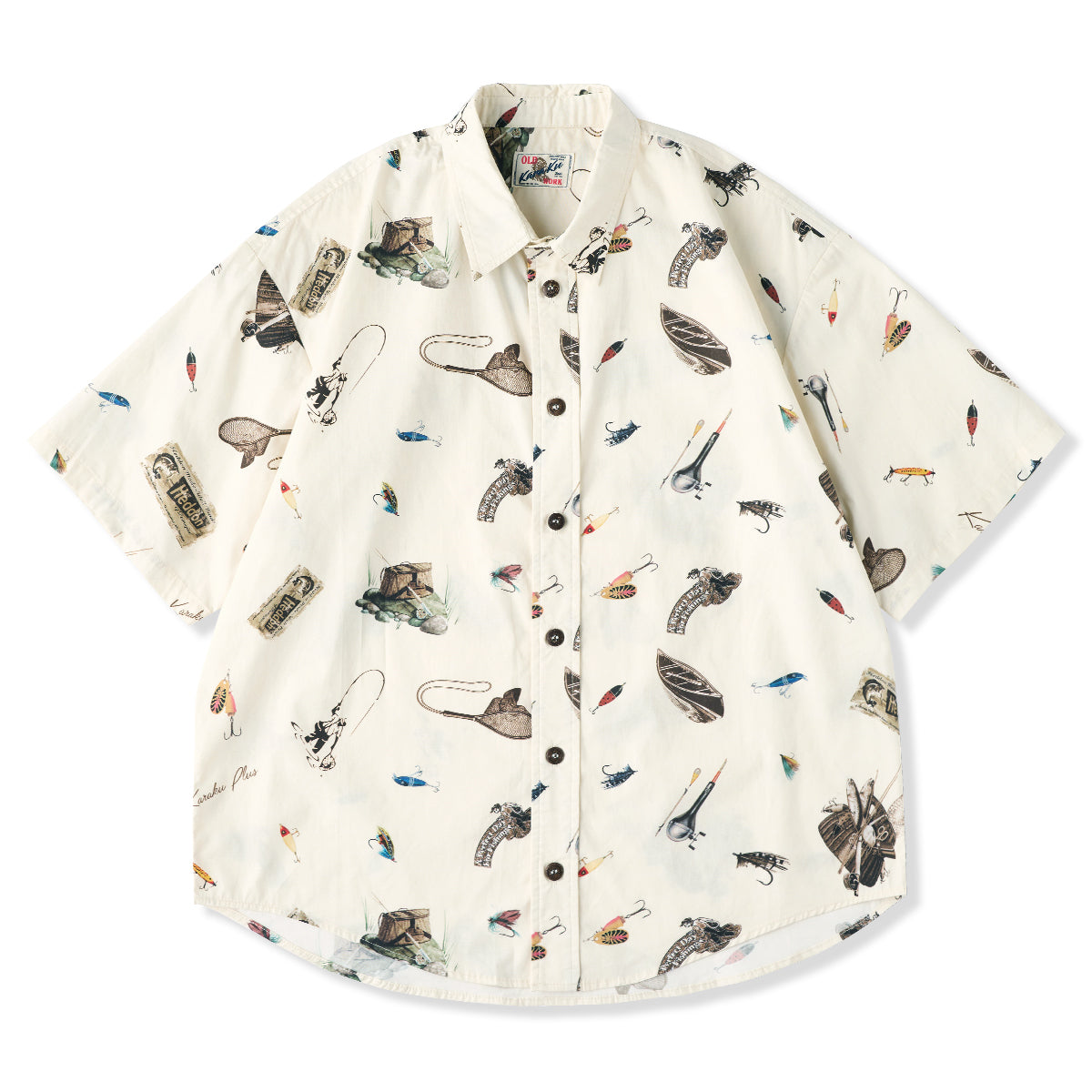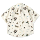 手描き風タッチで描かれたルアーやリール、フィッシングロッドなど、釣り好きにはたまらないモチーフを全面にあしらった半袖シャツ。どこか懐かしさを感じさせるレトロな色合いと、遊び心あふれるデザインが魅力の1枚です。1枚で着ても、Tシャツの上に羽織っても様になる、夏の主役アイテムです。アウトドア好きや釣り愛好家にはもちろん、ユニークな柄を楽しみたい方にもおすすめ。