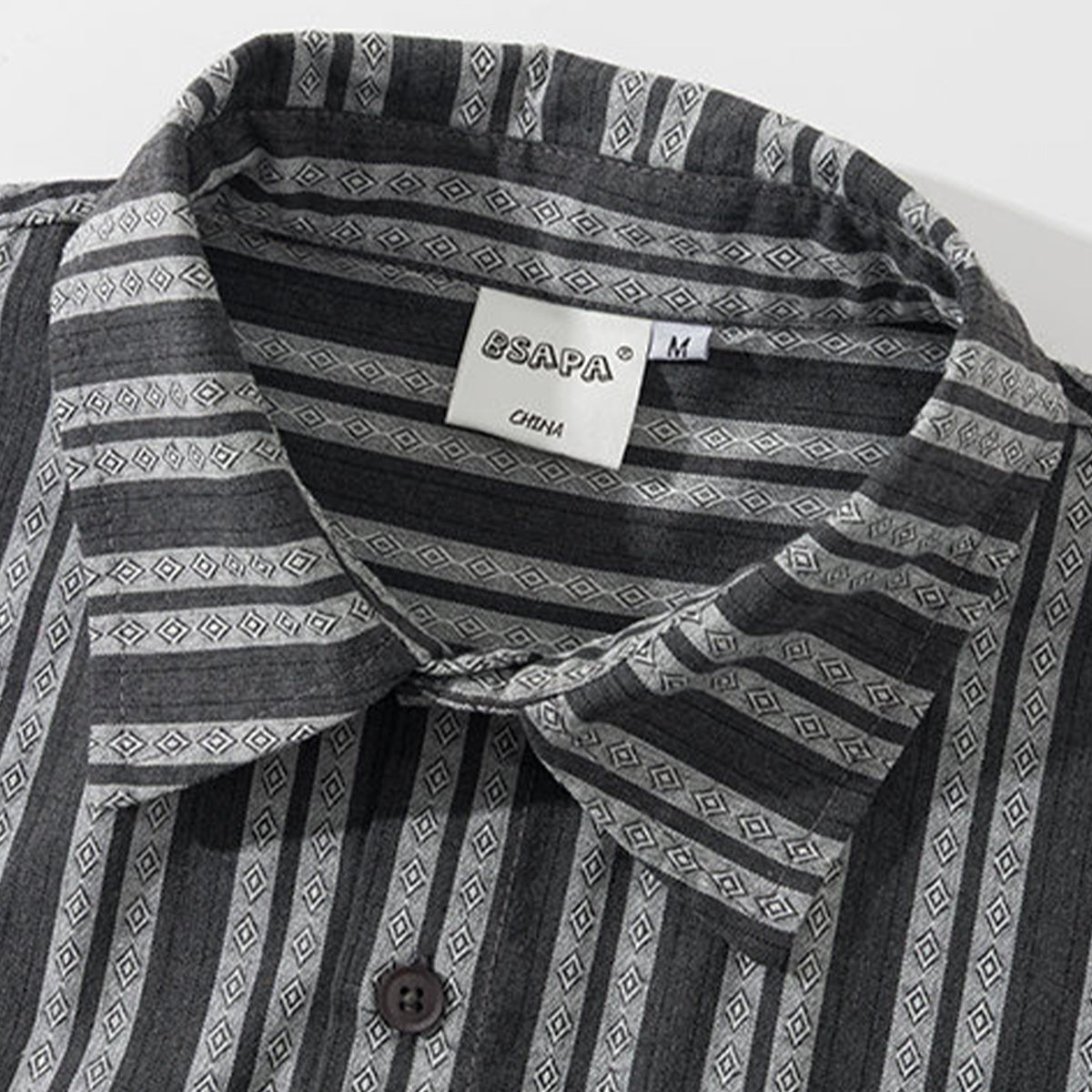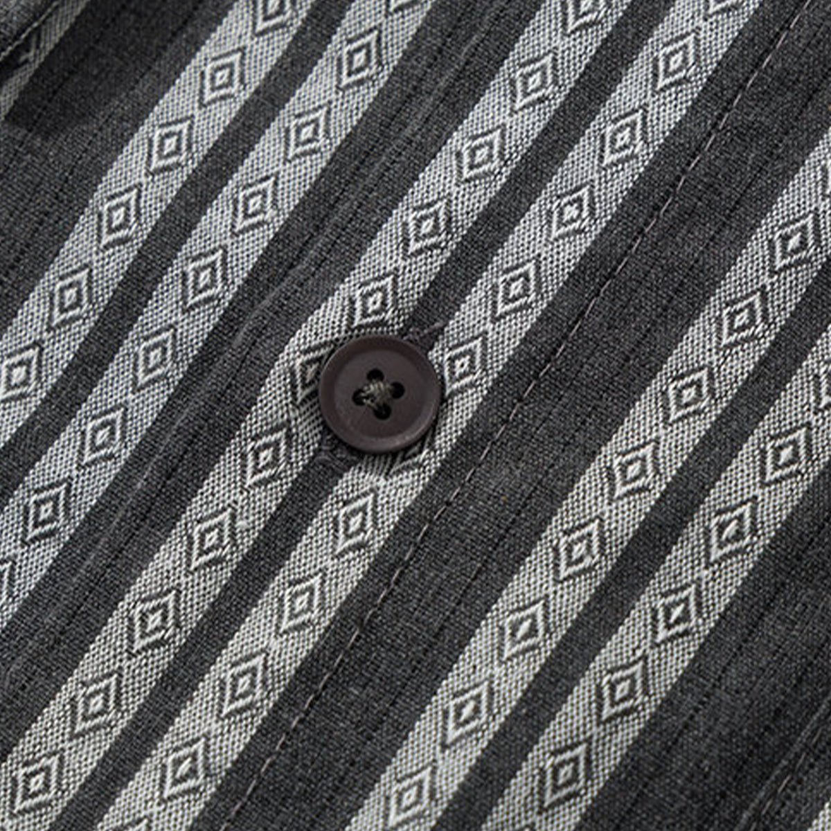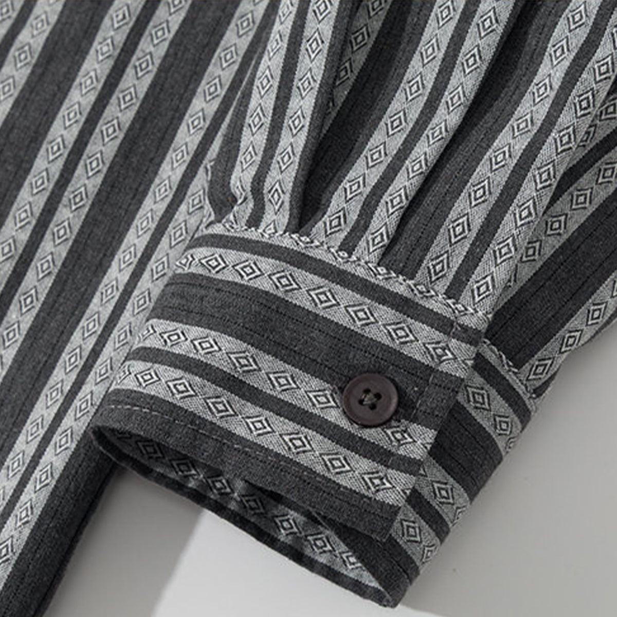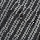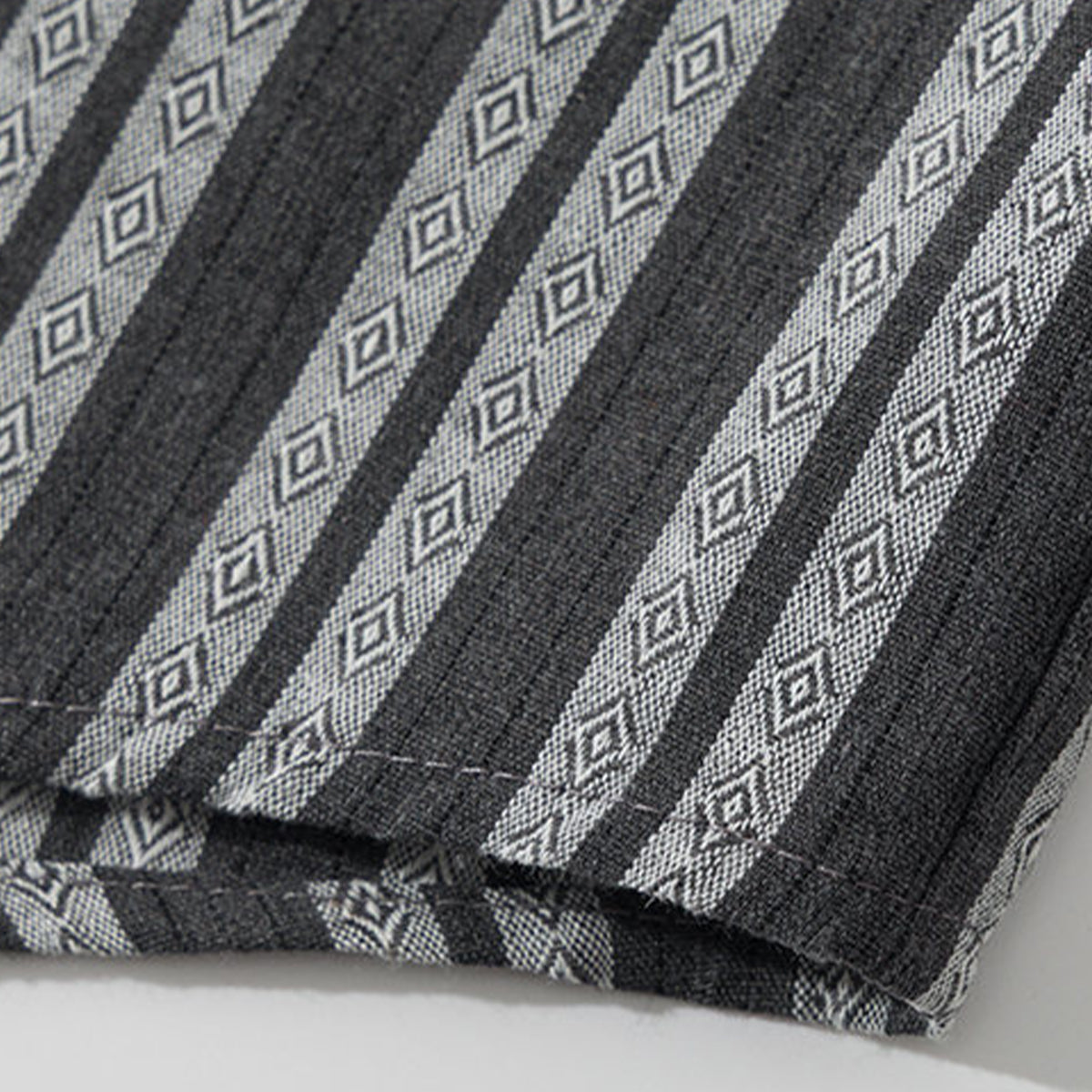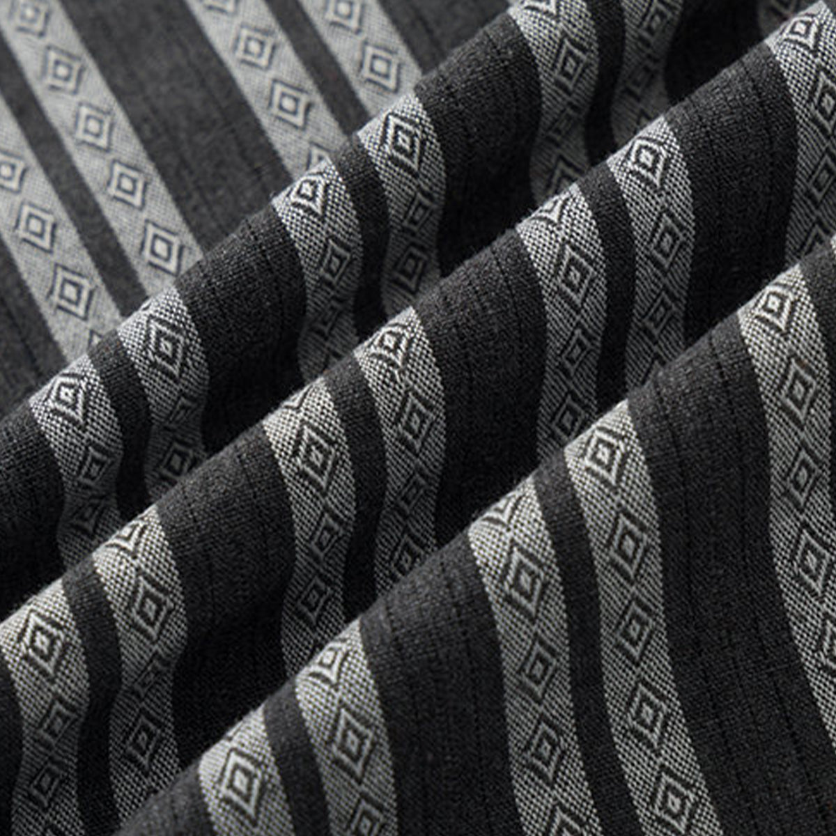 ストライプ柄が視覚的に背を高く見せる効果を持って、モノトーンを基調として、落ち着いた雰囲気を演出しています。ジャガード織りによる立体感のある模様が特徴で、ストライプ柄の中にダイヤ型のエスニック調のパターンが織り込まれています。これにより、シンプルでありながら洗練された印象を与えています。