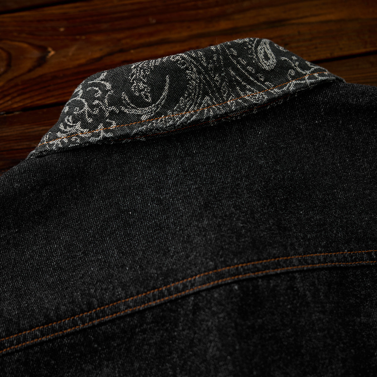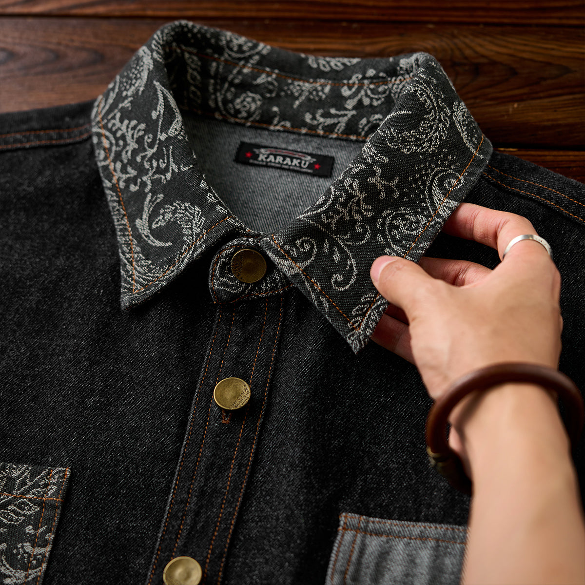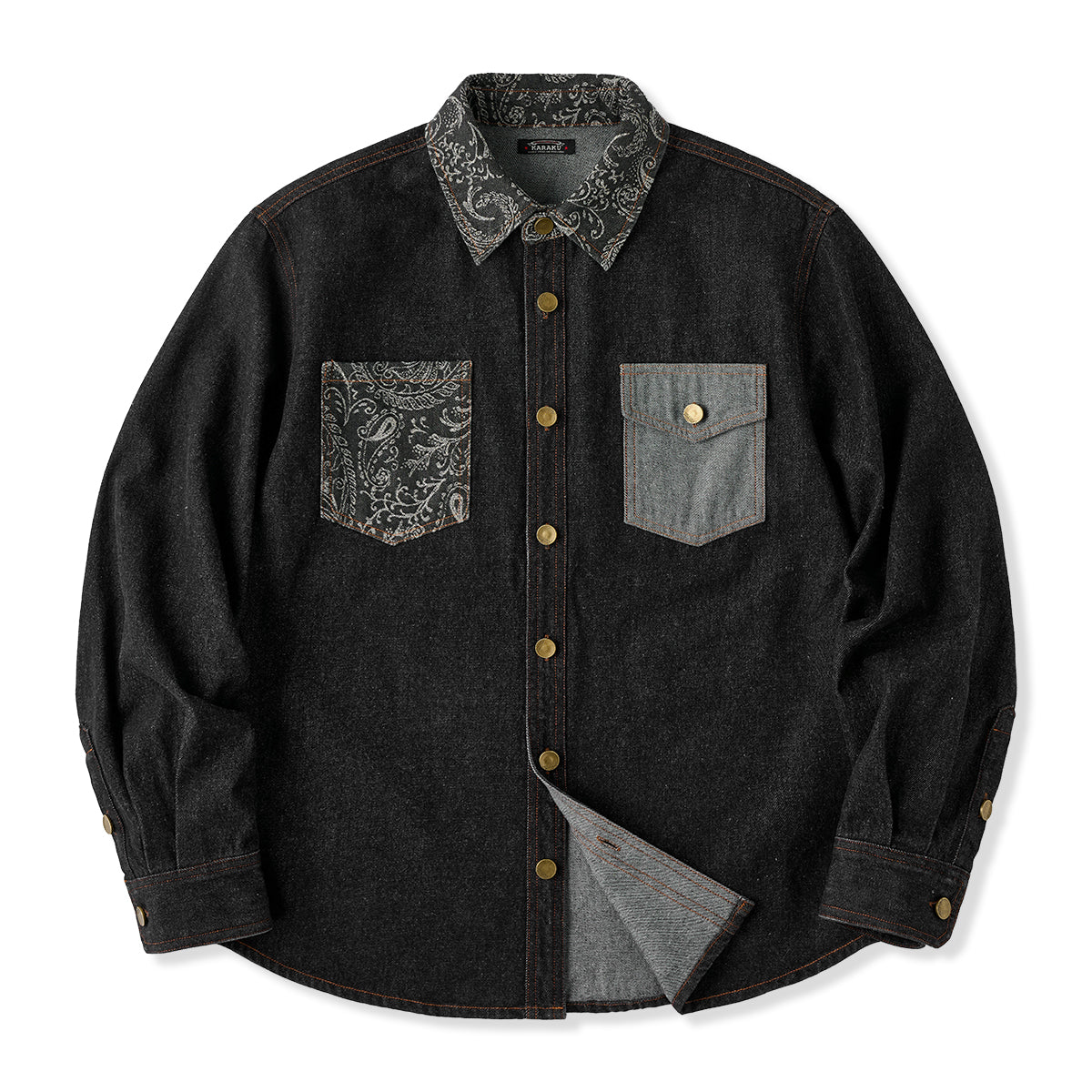 襟・胸ポケジャガード織ペイズリーコンビ ウォッシュ加工デニムシャツ