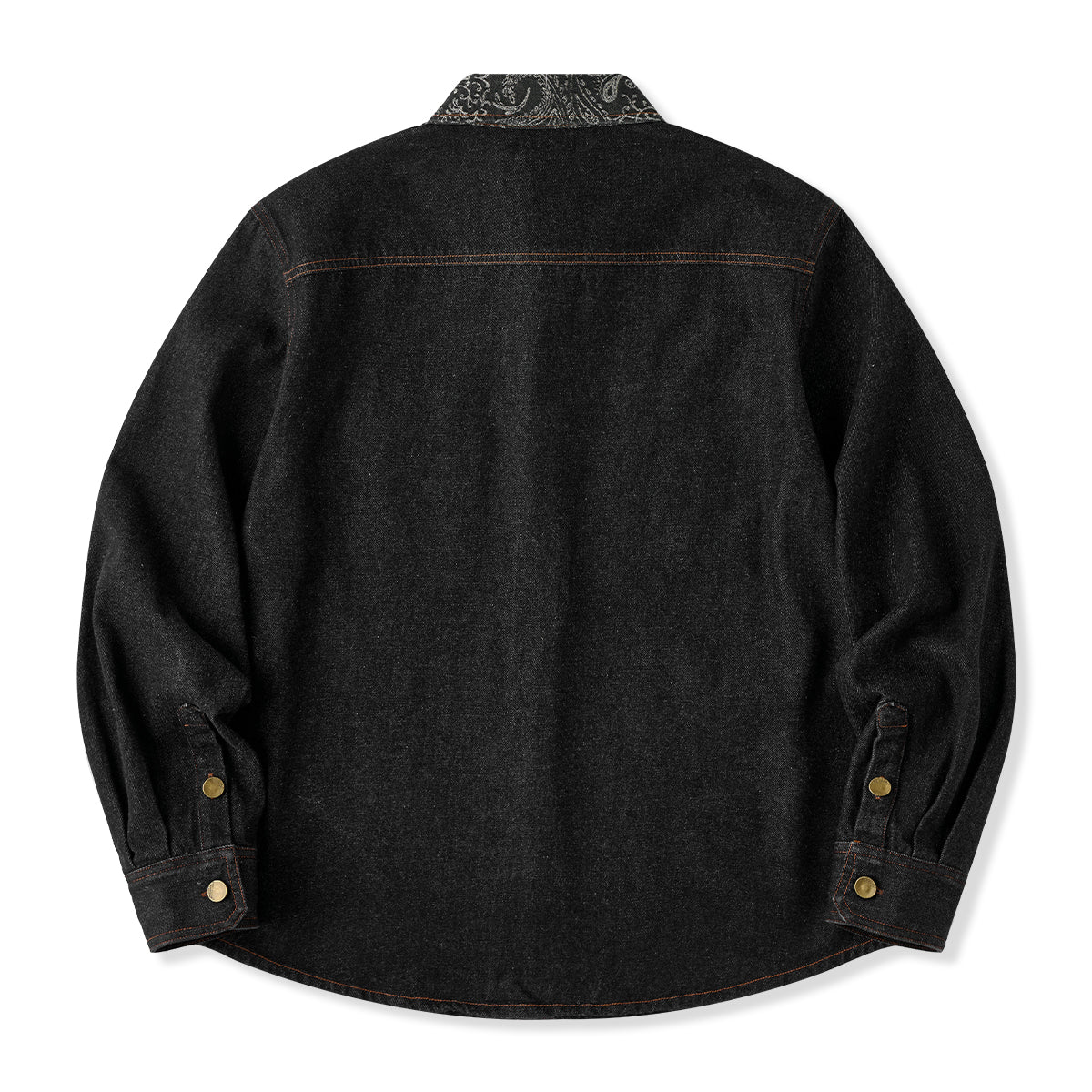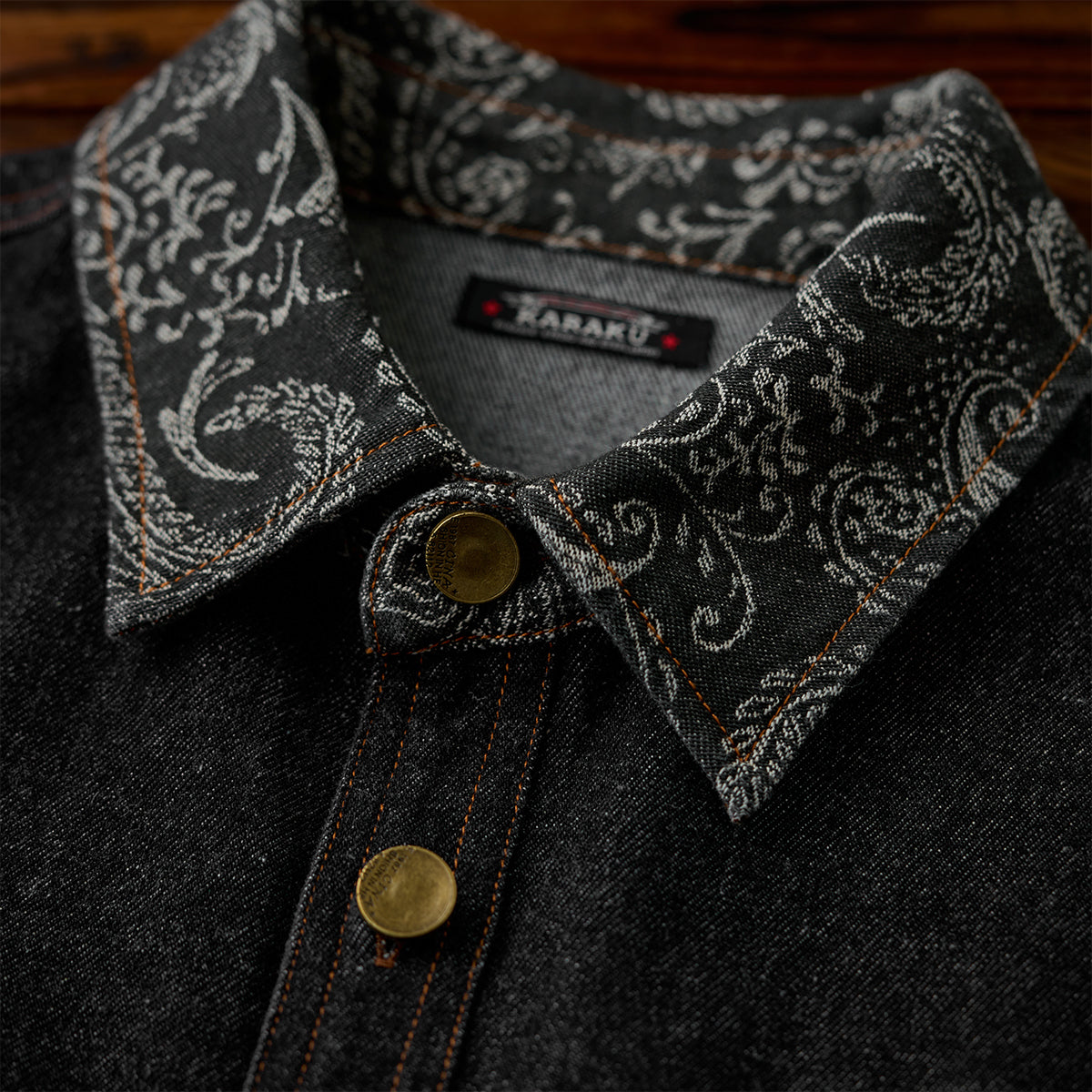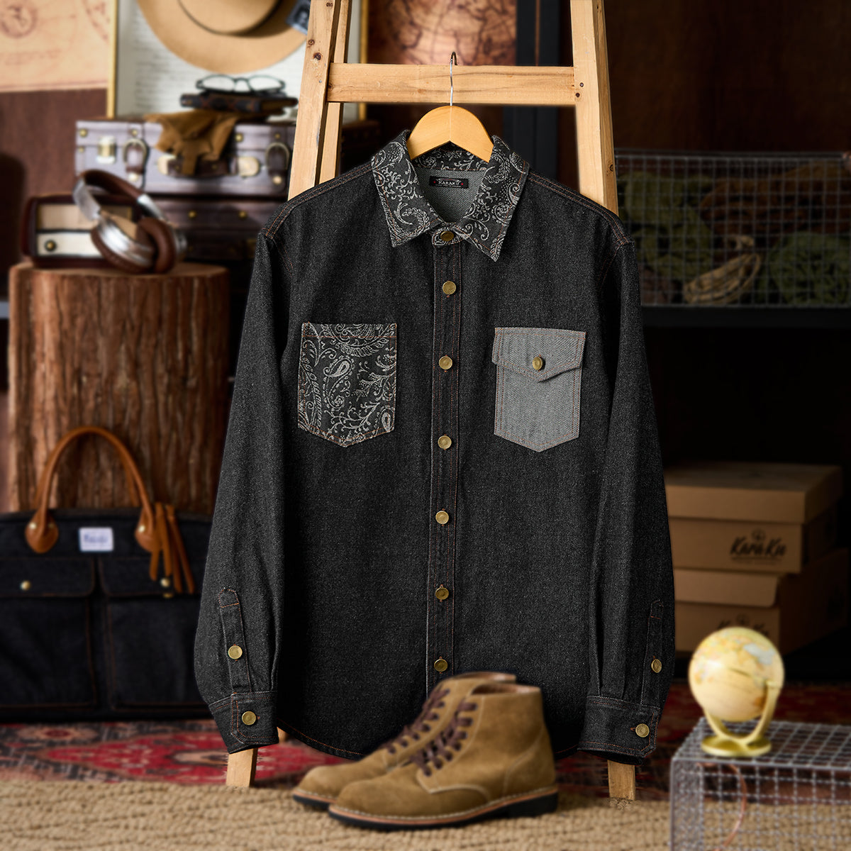 襟・胸ポケジャガード織ペイズリーコンビ ウォッシュ加工デニムシャツ