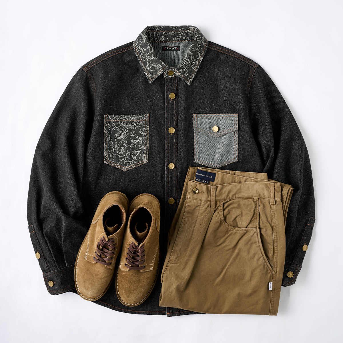 ペイズリー柄を活かし、細身のブラックパンツやブーツと合わせることで洗練された印象に。中にタートルネックやスウェットを合わせると、季節感を取り入れたレイヤードが可能。