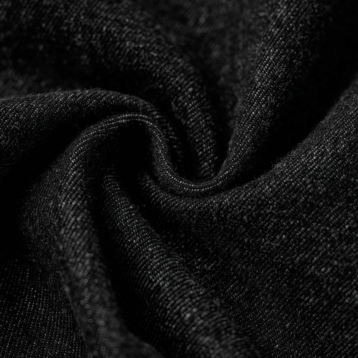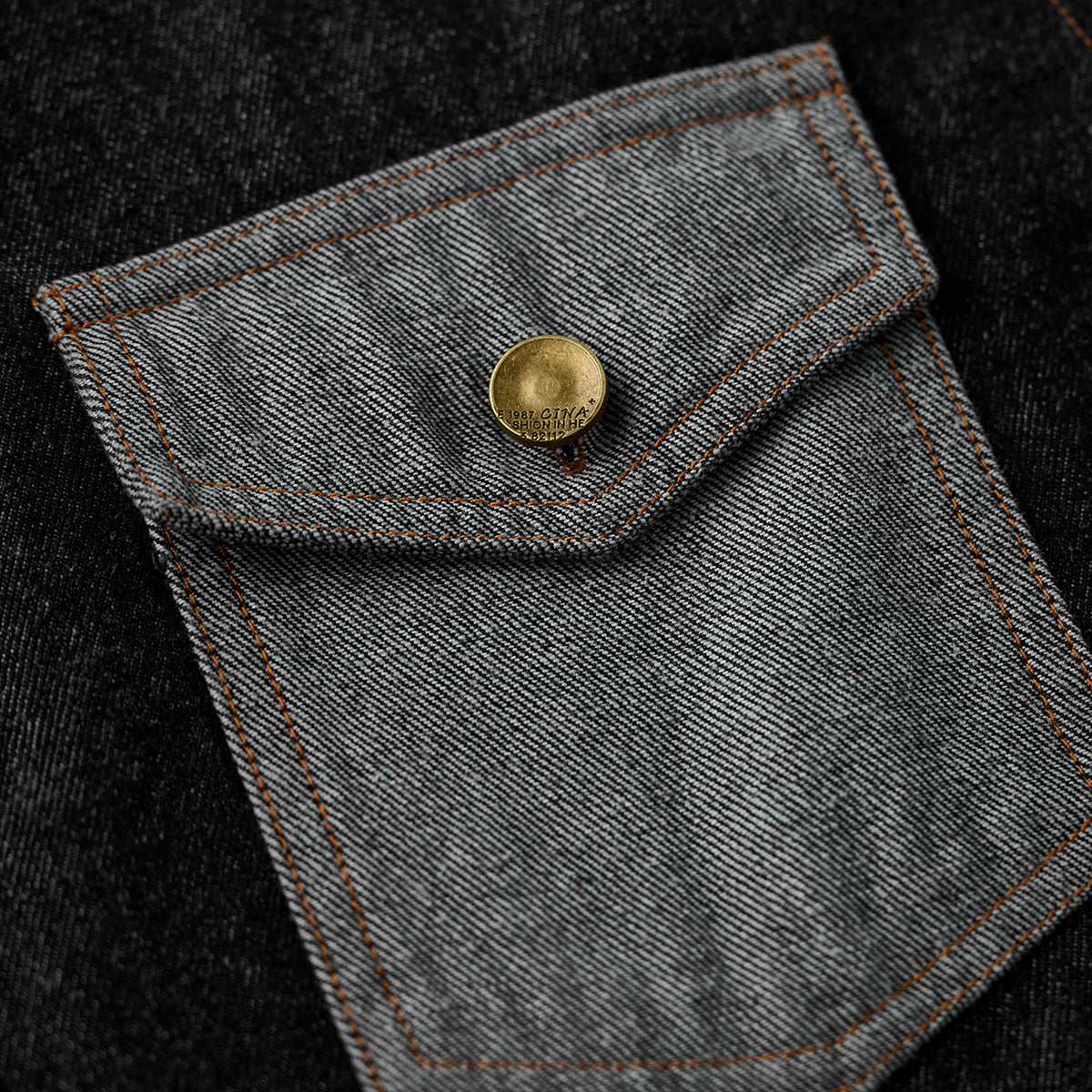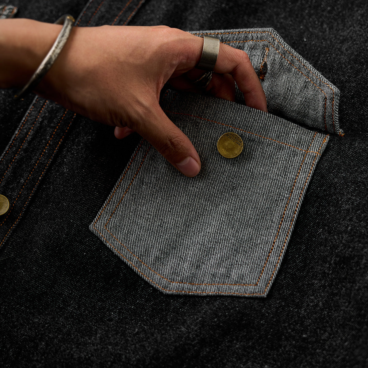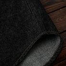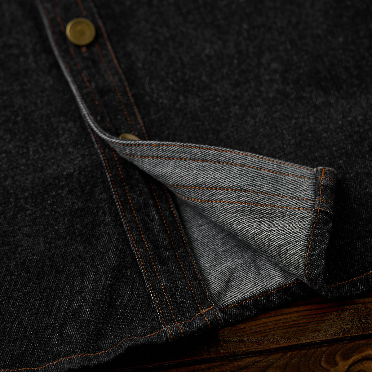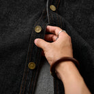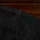 ステッチは明るいブラウン系で、ブラックデニムとのコントラストが目立ちます。ボタン部分は金属製で、無骨なアクセントをプラスしています。