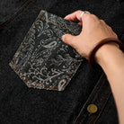 襟と左胸ポケット部分にジャガード織りのペイズリー柄が施されて、シャツ全体に華やかさをプラス。左胸ポケットはペイズリー柄、右胸ポケットは無地のデニム生地で非対称デザイン。ポケットの形状も異なり、デザイン性を強調しています。