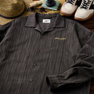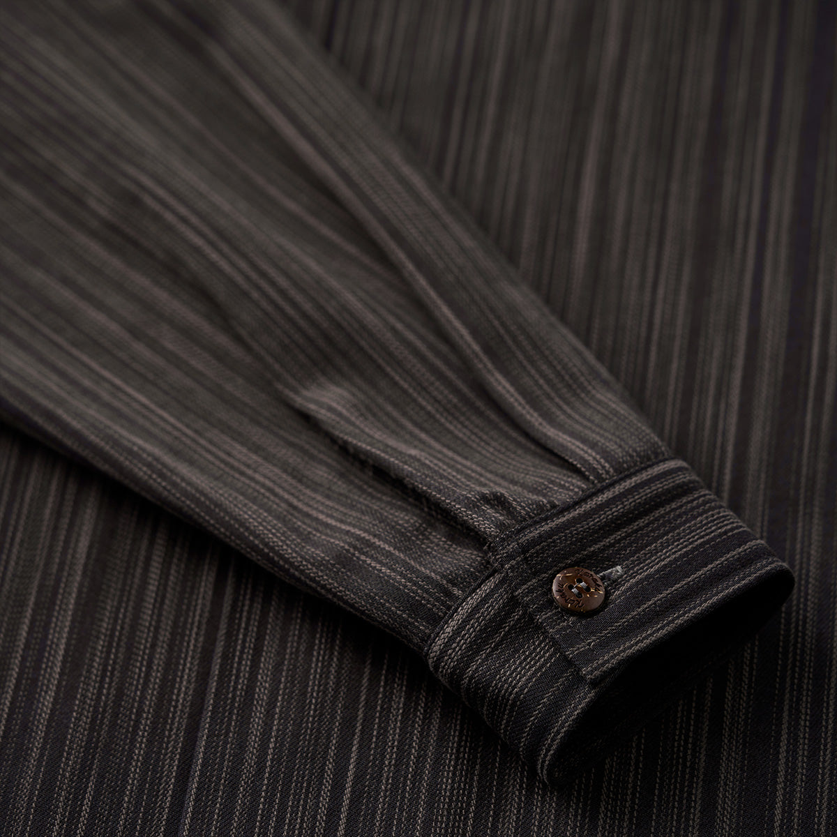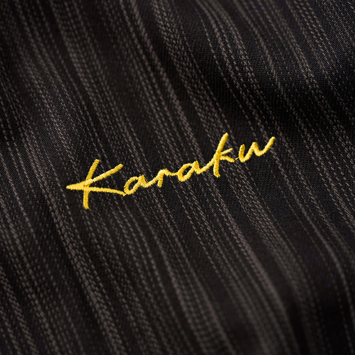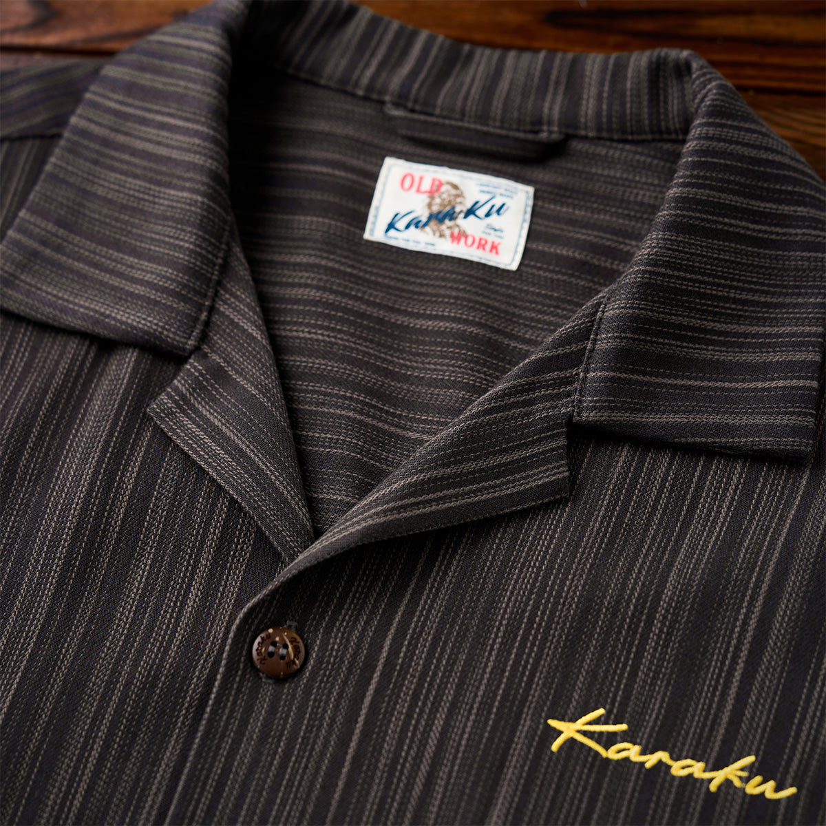 「Karaku」刺繍入り ストライプジャカード織りオープンカラーシャツ