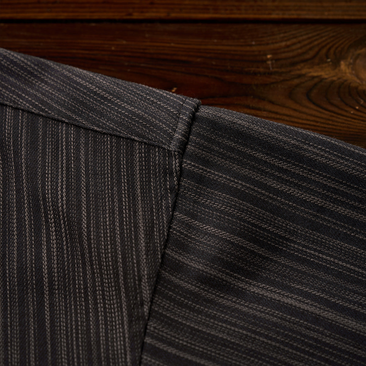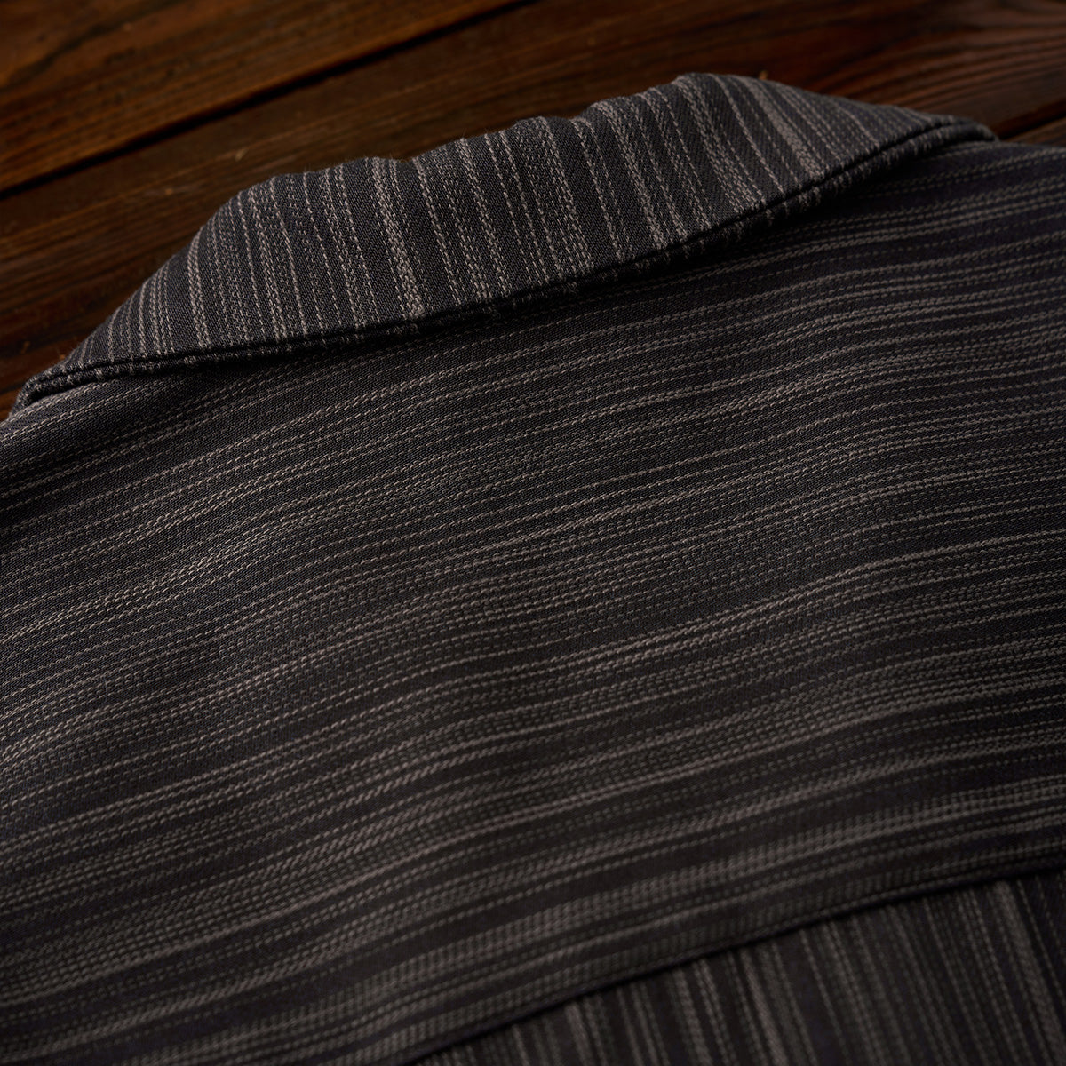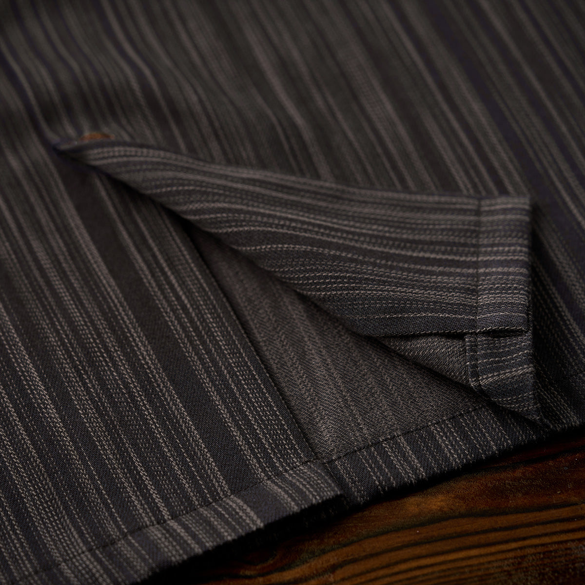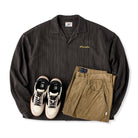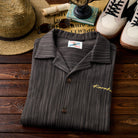 「Karaku」刺繍入り ストライプジャカード織りオープンカラーシャツ