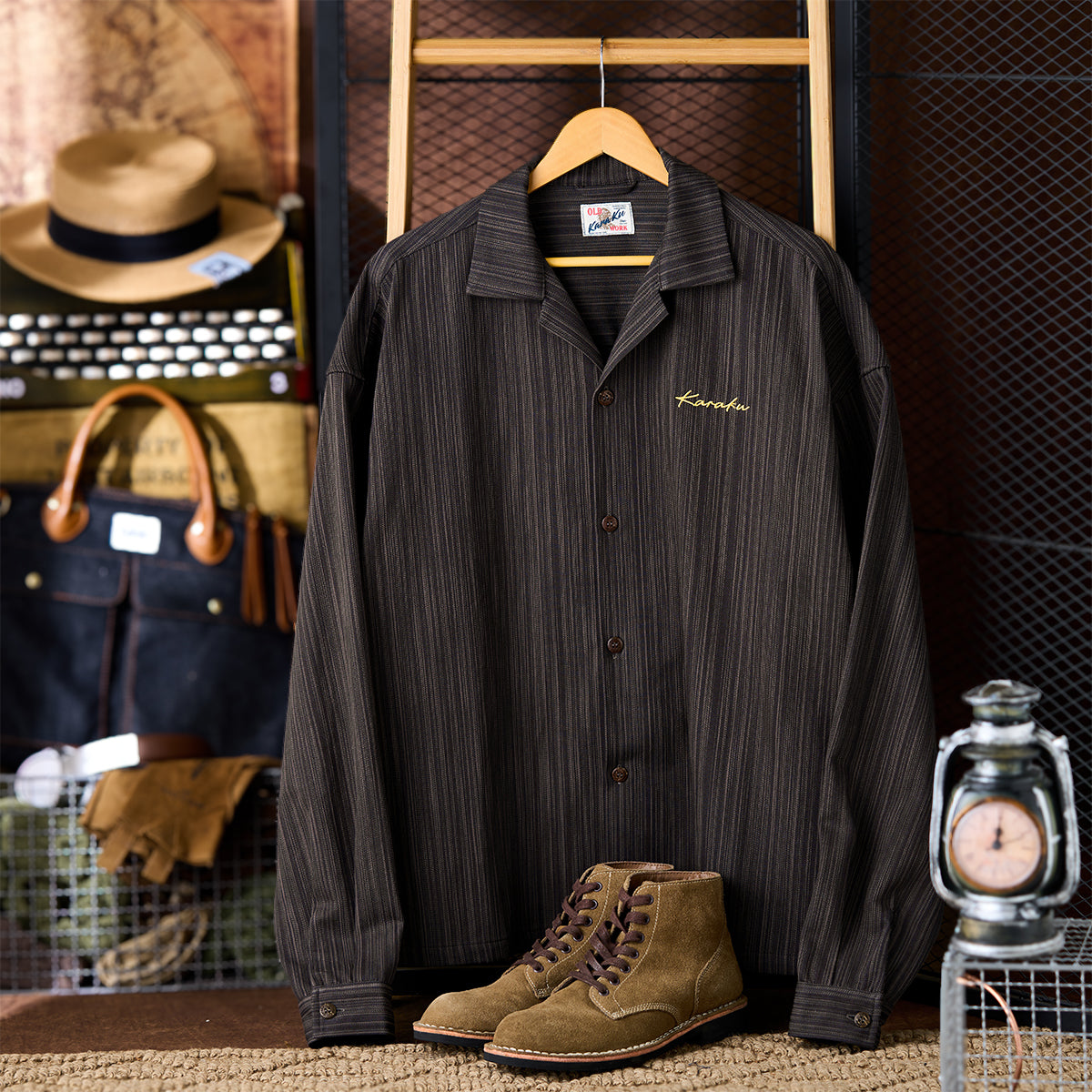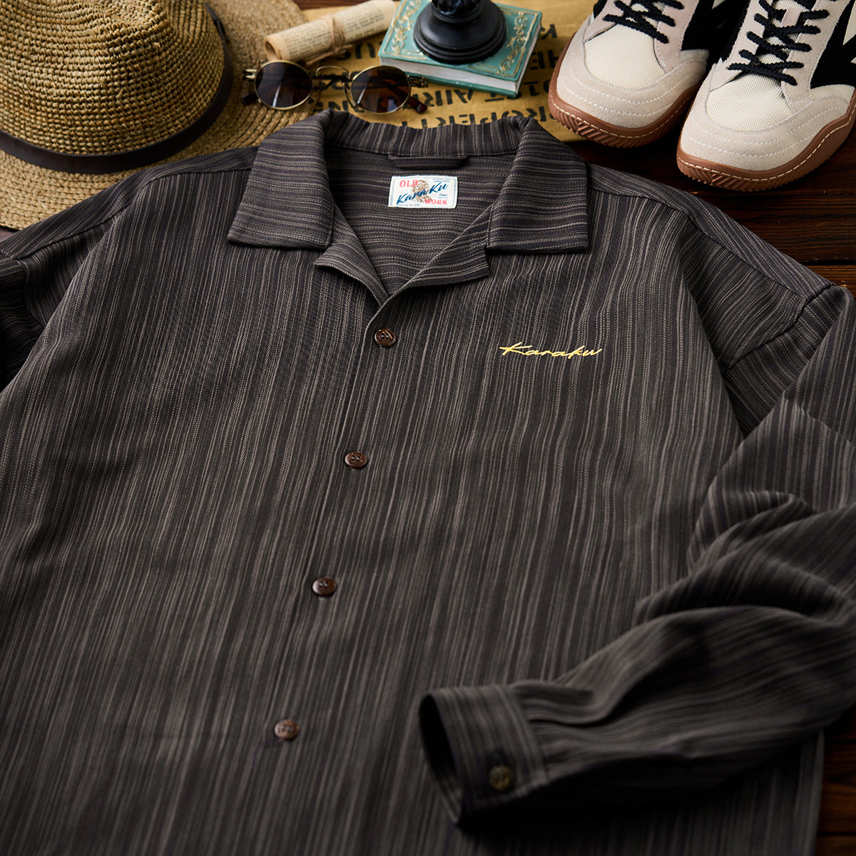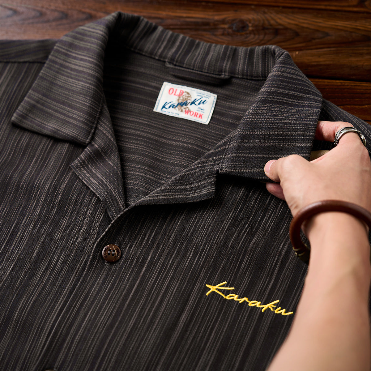 表情豊かなストライプジャカード織りを採用したオープンカラーシャツ。立体感のある織り柄がさりげない高級感を漂わせ、着るだけでスタイルを引き立てます。胸元には「Karaku」刺繍をあしらい、ブランドらしい遊び心と個性をプラス。程よくリラックス感のあるオープンカラー仕様で、1枚での着用はもちろん、羽織りとしても活躍します。カジュアルからきれいめまで幅広いコーディネートに取り入れやすい一着です。