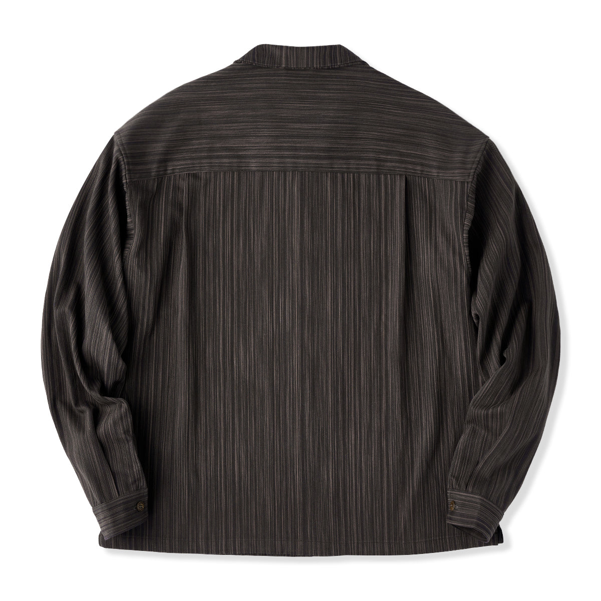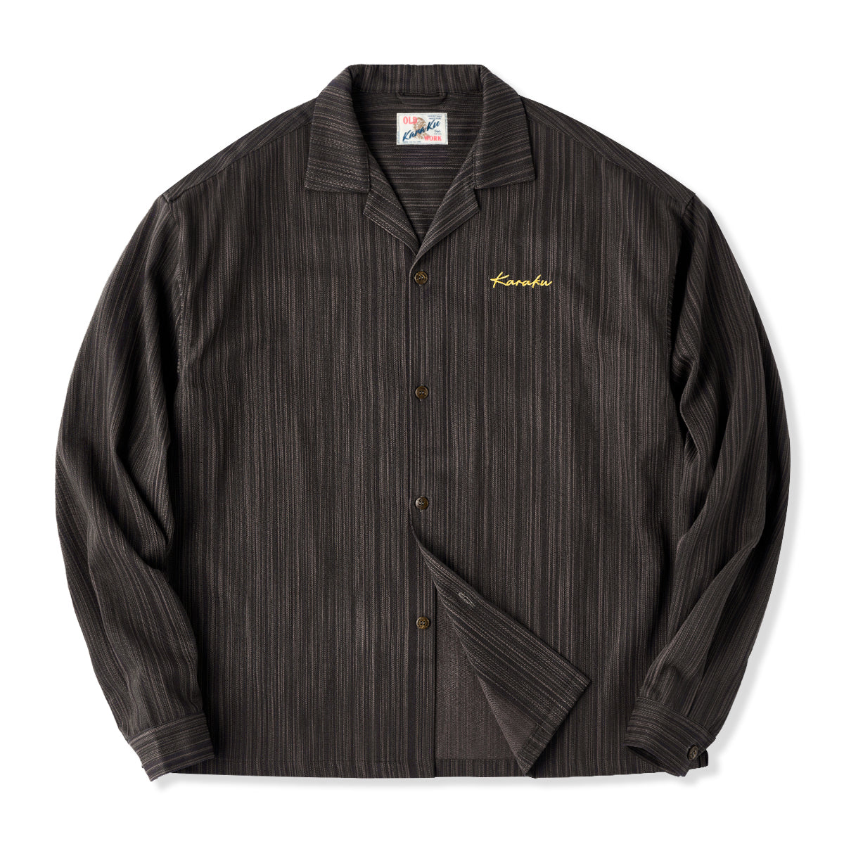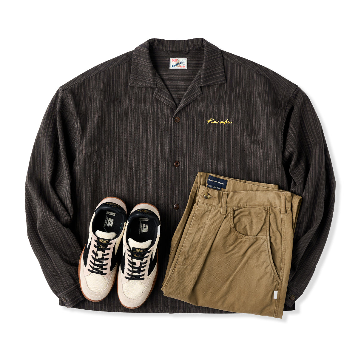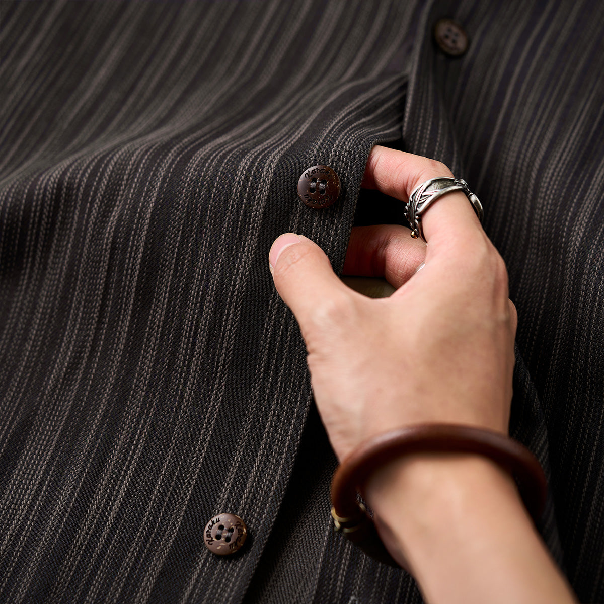 表情豊かなストライプジャカード織りを採用したオープンカラーシャツ。立体感のある織り柄がさりげない高級感を漂わせ、着るだけでスタイルを引き立てます。胸元には「Karaku」刺繍をあしらい、ブランドらしい遊び心と個性をプラス。程よくリラックス感のあるオープンカラー仕様で、1枚での着用はもちろん、羽織りとしても活躍します。カジュアルからきれいめまで幅広いコーディネートに取り入れやすい一着です。