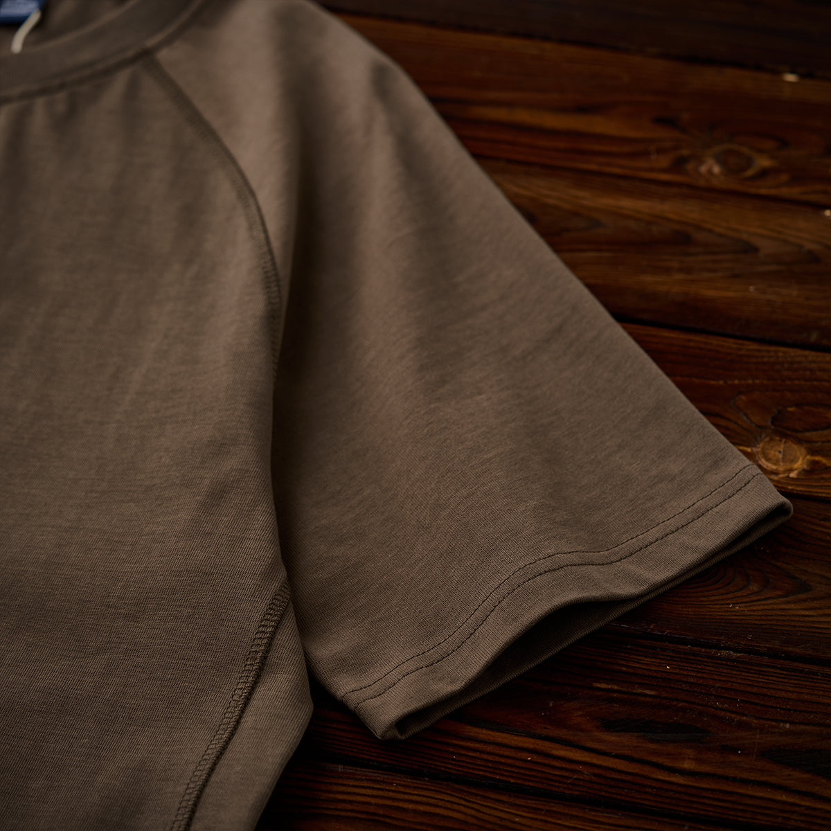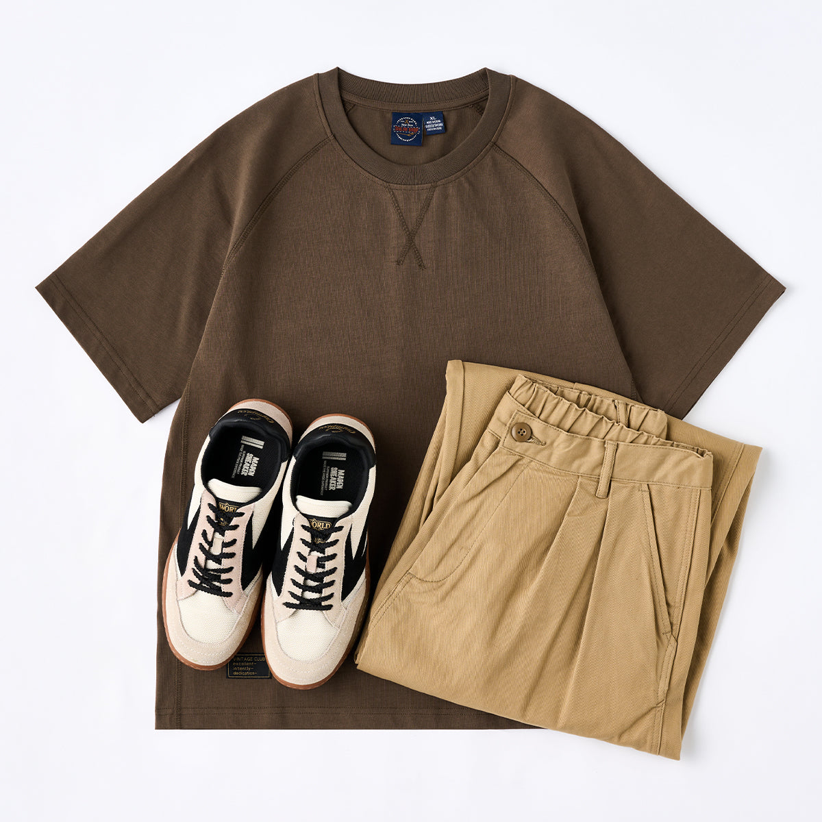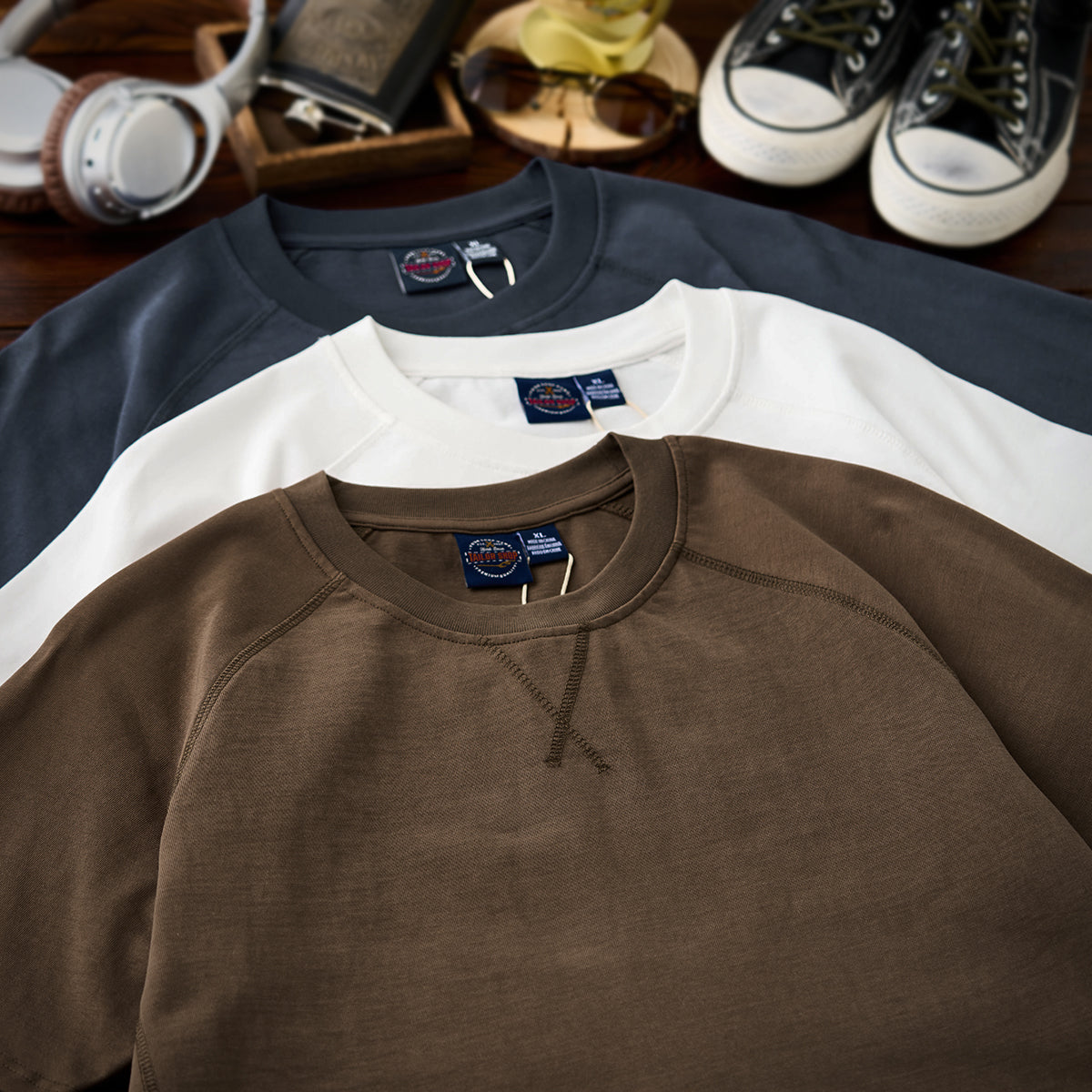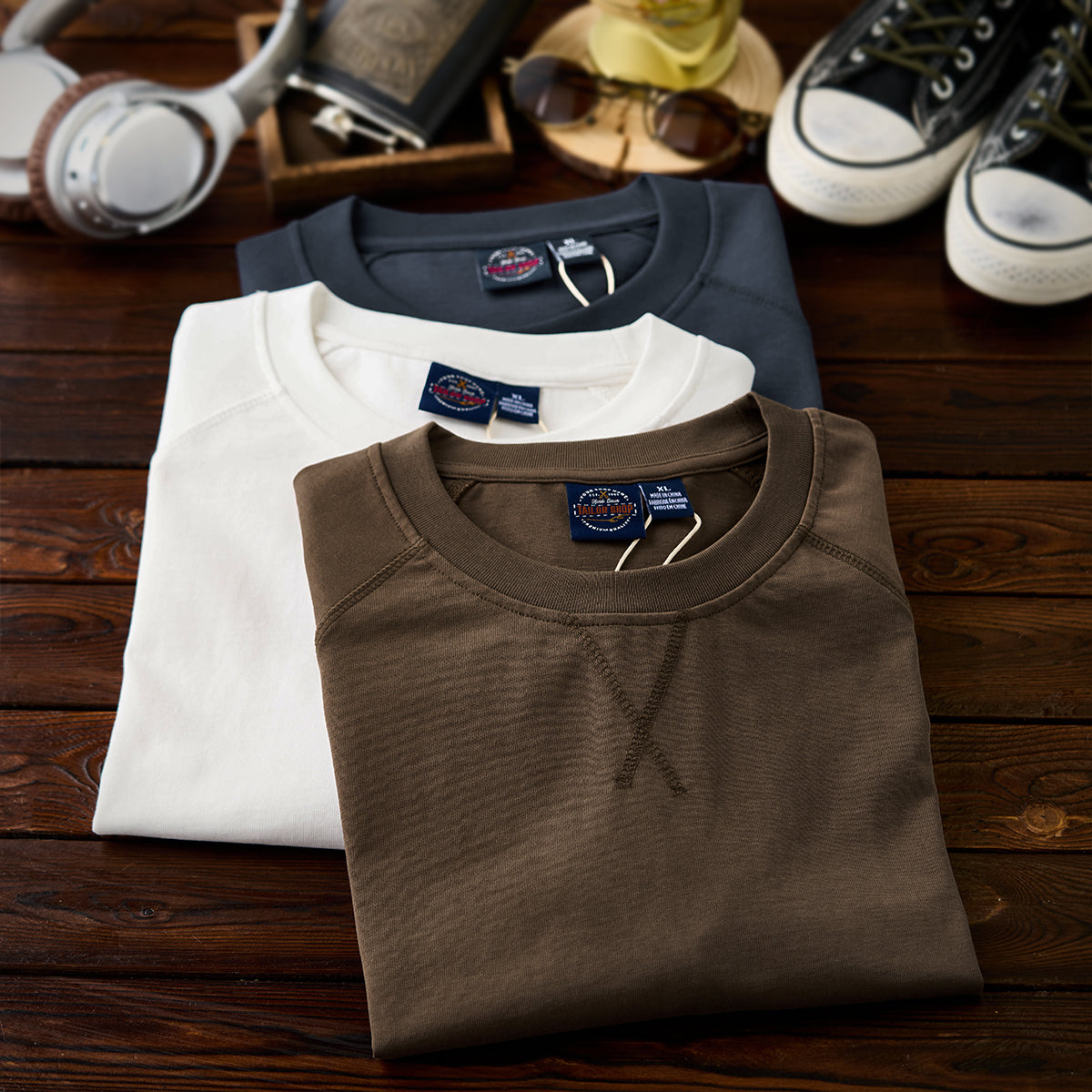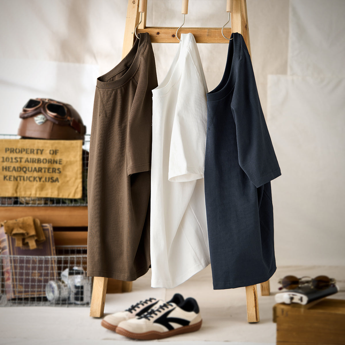 フロントに施されたステッチ入りの三角形が印象的な一枚。これは、1930年代のアメリカ海軍のトレーナーに由来するディテールで、ヴィンテージ感をさりげなく演出します。首元はクルーネック仕様で、シンプルかつ清潔感のある仕上がりに。リブ編みが施されており、ほどよくフィットしながらもシャープな印象を与えます。ラグランスリーブ仕様で肩回りが動かしやすく、リラックスした着心地を実現。シルエットは適度なゆとりを持たせつつ、快適な着心地と美しいラインを両立。