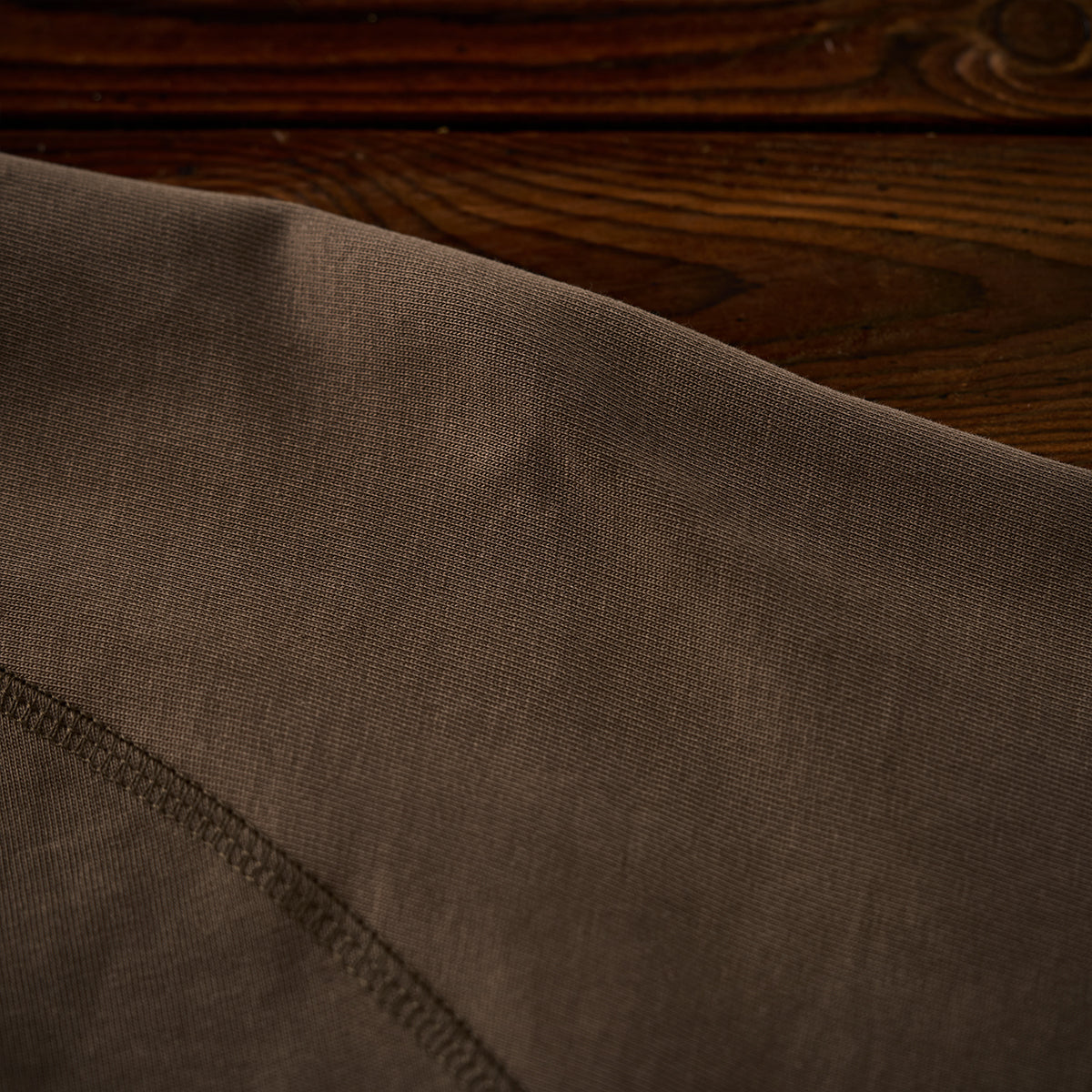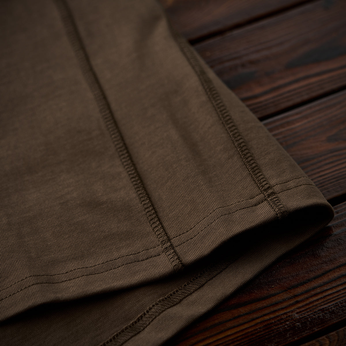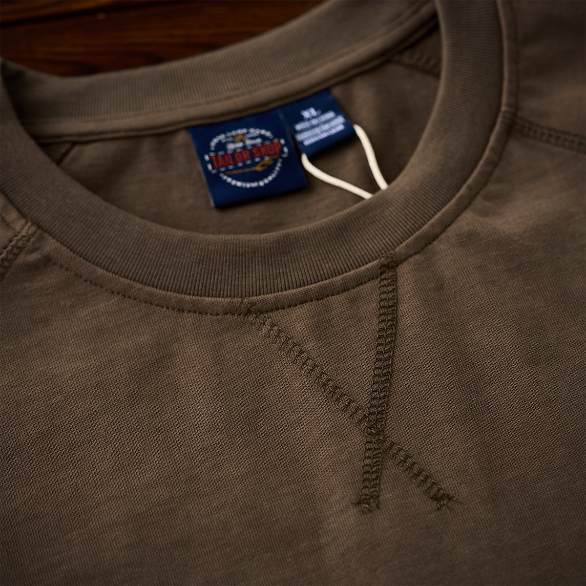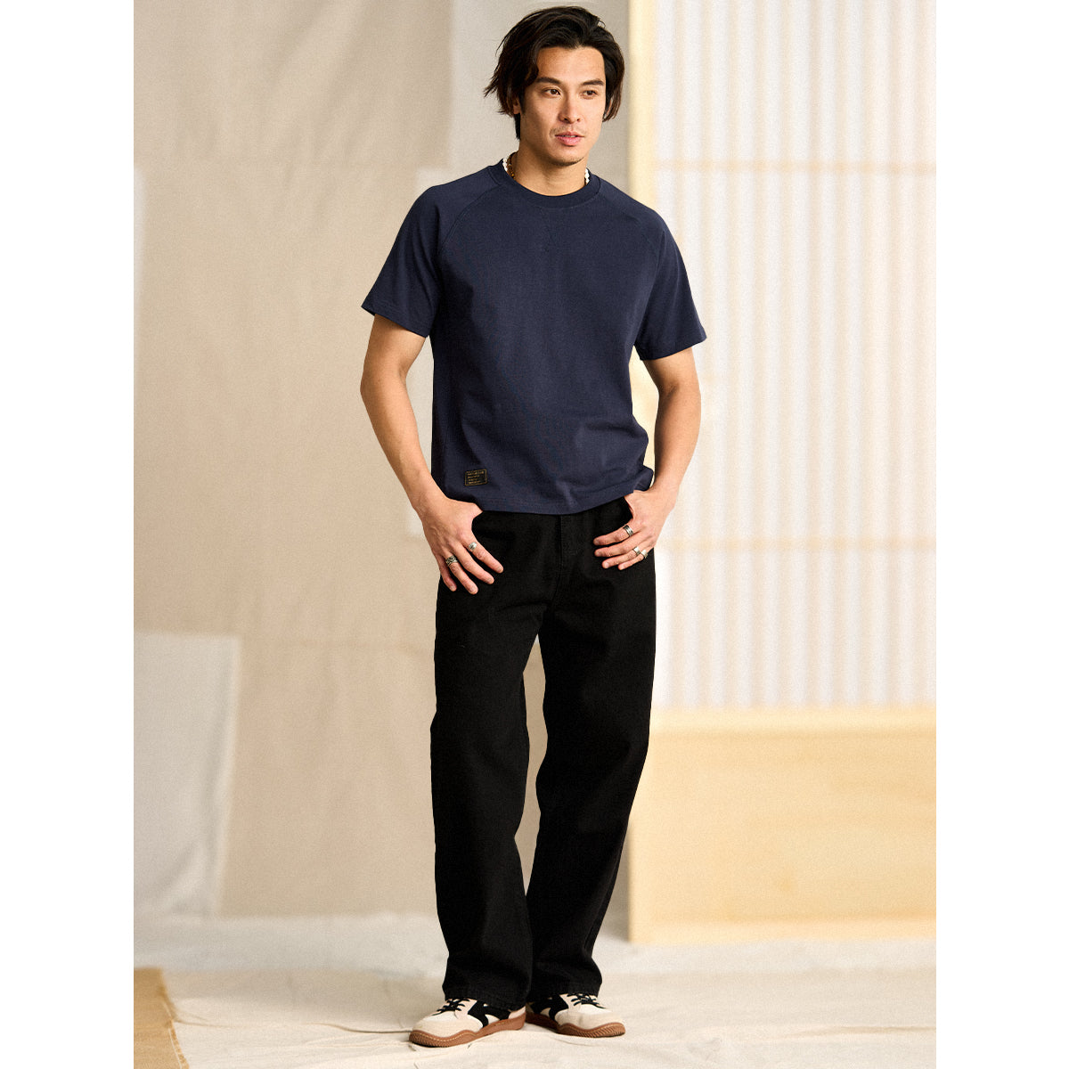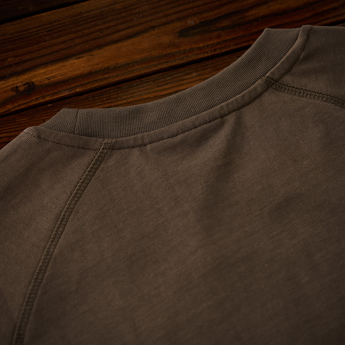 フロントに施されたステッチ入りの三角形が印象的な一枚。これは、1930年代のアメリカ海軍のトレーナーに由来するディテールで、ヴィンテージ感をさりげなく演出します。首元はクルーネック仕様で、シンプルかつ清潔感のある仕上がりに。リブ編みが施されており、ほどよくフィットしながらもシャープな印象を与えます。ラグランスリーブ仕様で肩回りが動かしやすく、リラックスした着心地を実現。シルエットは適度なゆとりを持たせつつ、快適な着心地と美しいラインを両立。