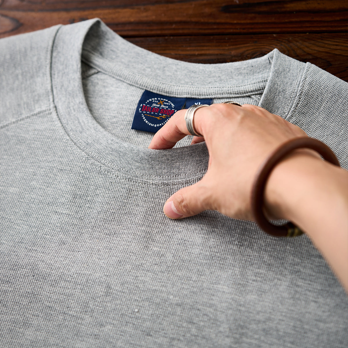 袖が首元から直接伸びるラグランスリーブを採用して、肩の可動域を広げ、動きやすさを向上させる効果がある。また、肩のラインを自然に見せることで、リラックスした雰囲気を演出。