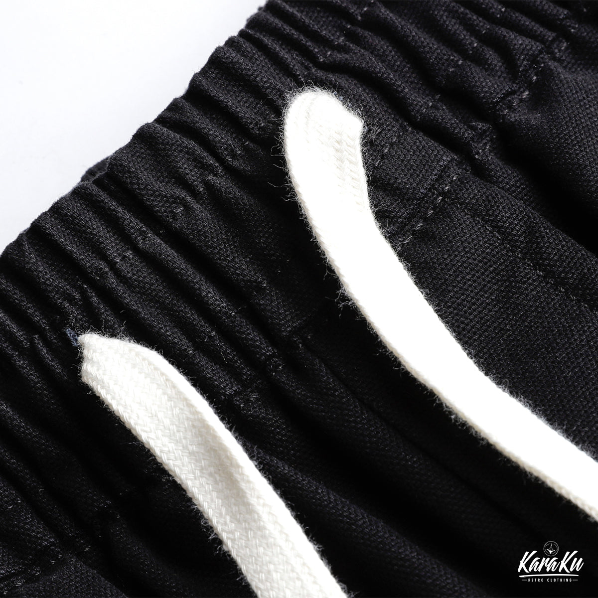 ウエストはゴム仕様になって、ドローコードが付いているため、ベルトなしでも快適に着用可能。紐は長めで白色のため、デザインのアクセントになっている。