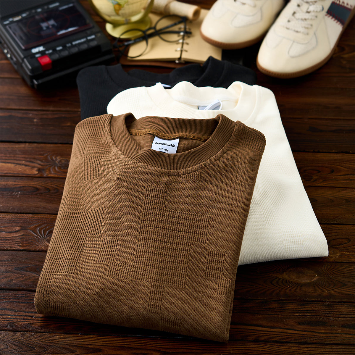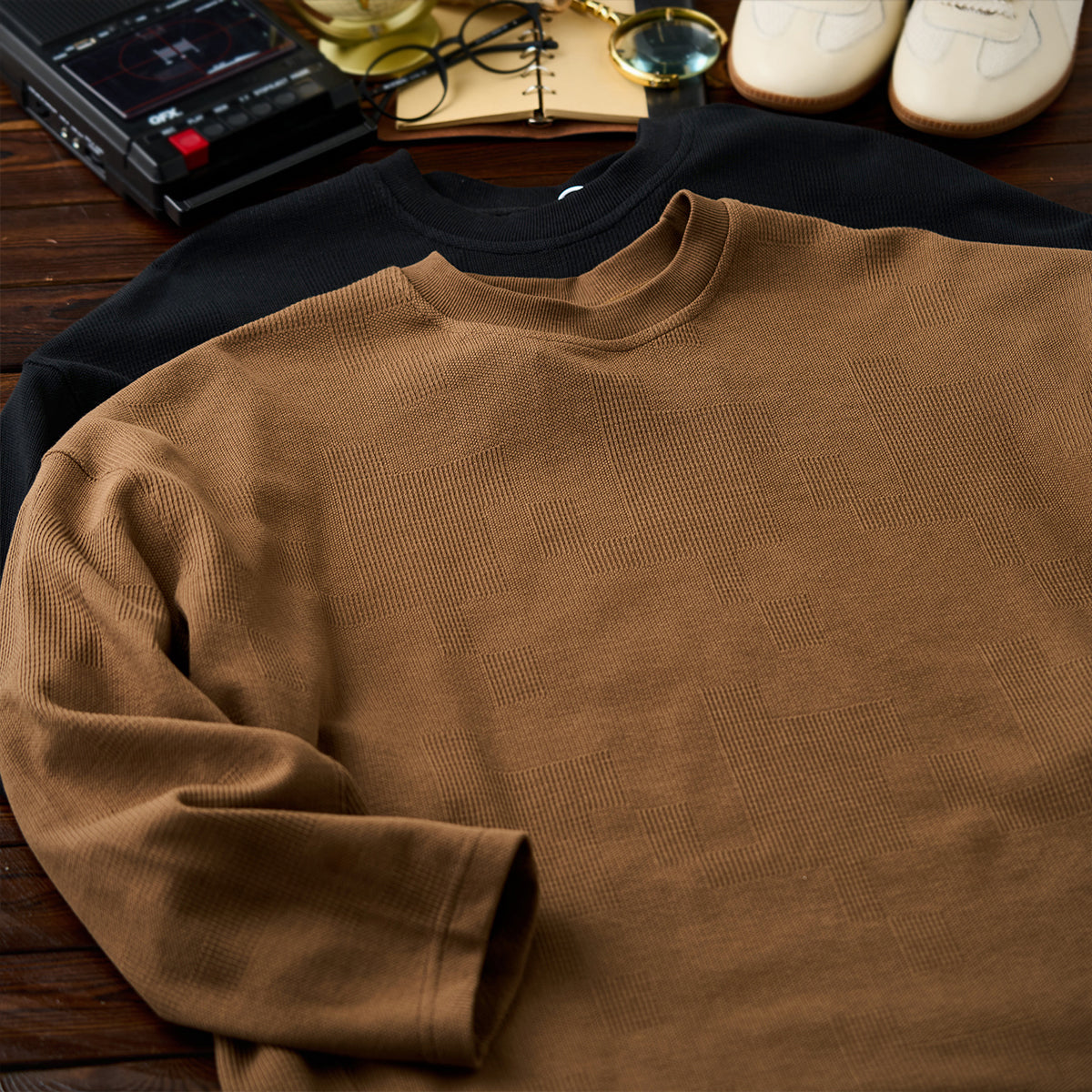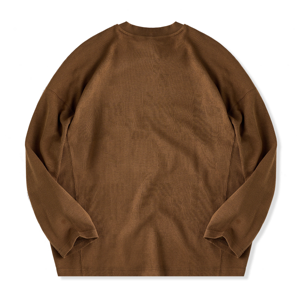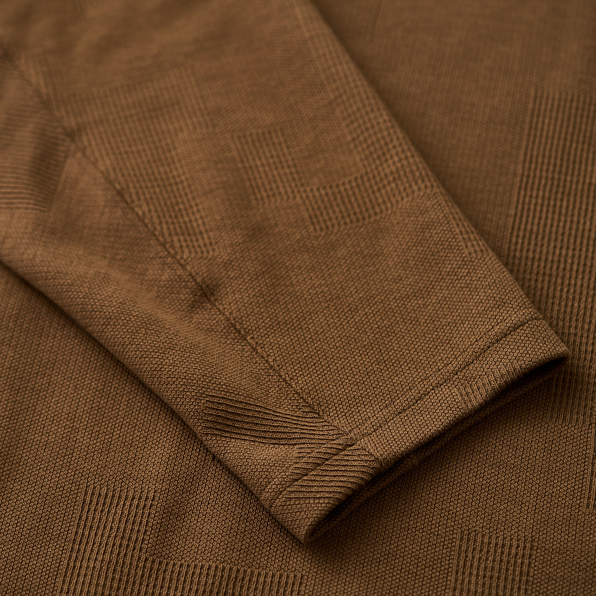 全体的にピクセルアートのような幾何学的な模様が織り込まれて、シンプルなデザインにアクセントを加えています。一部がリブ編みのような細かいテクスチャになって、立体感があります。