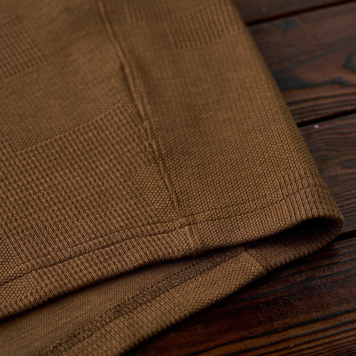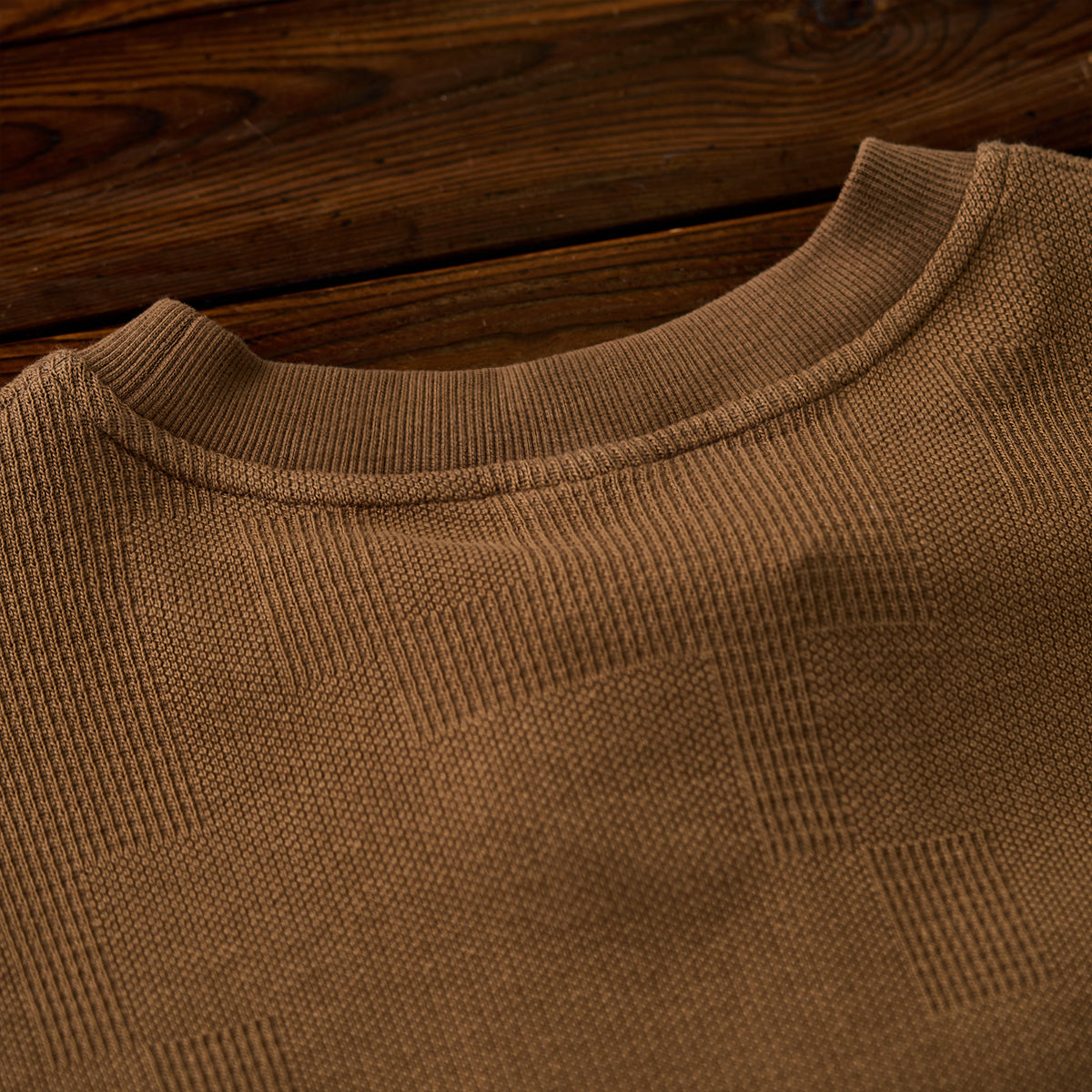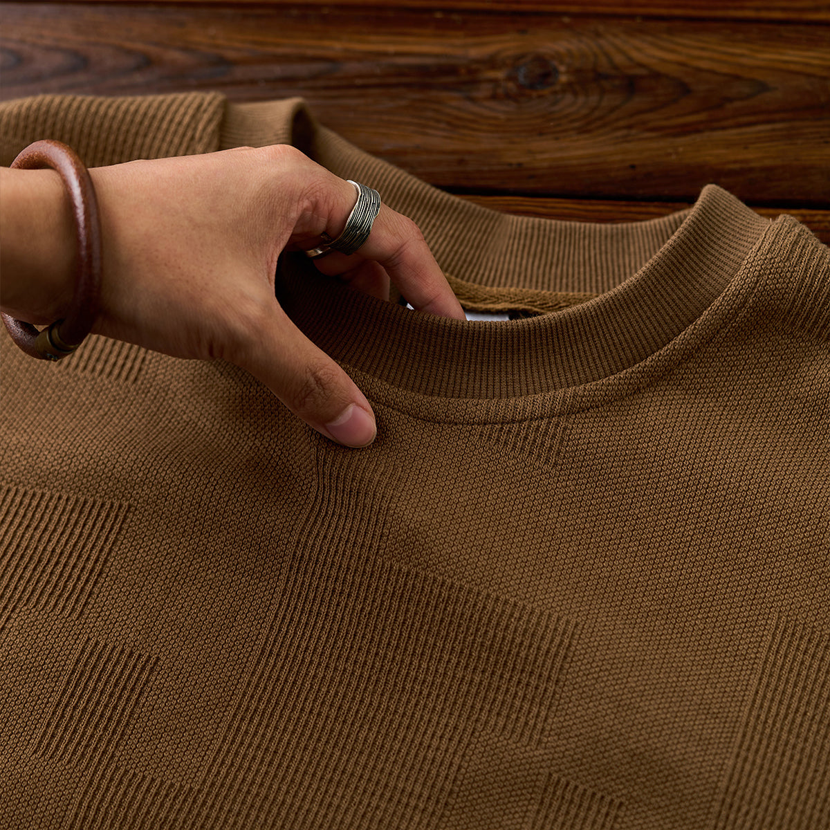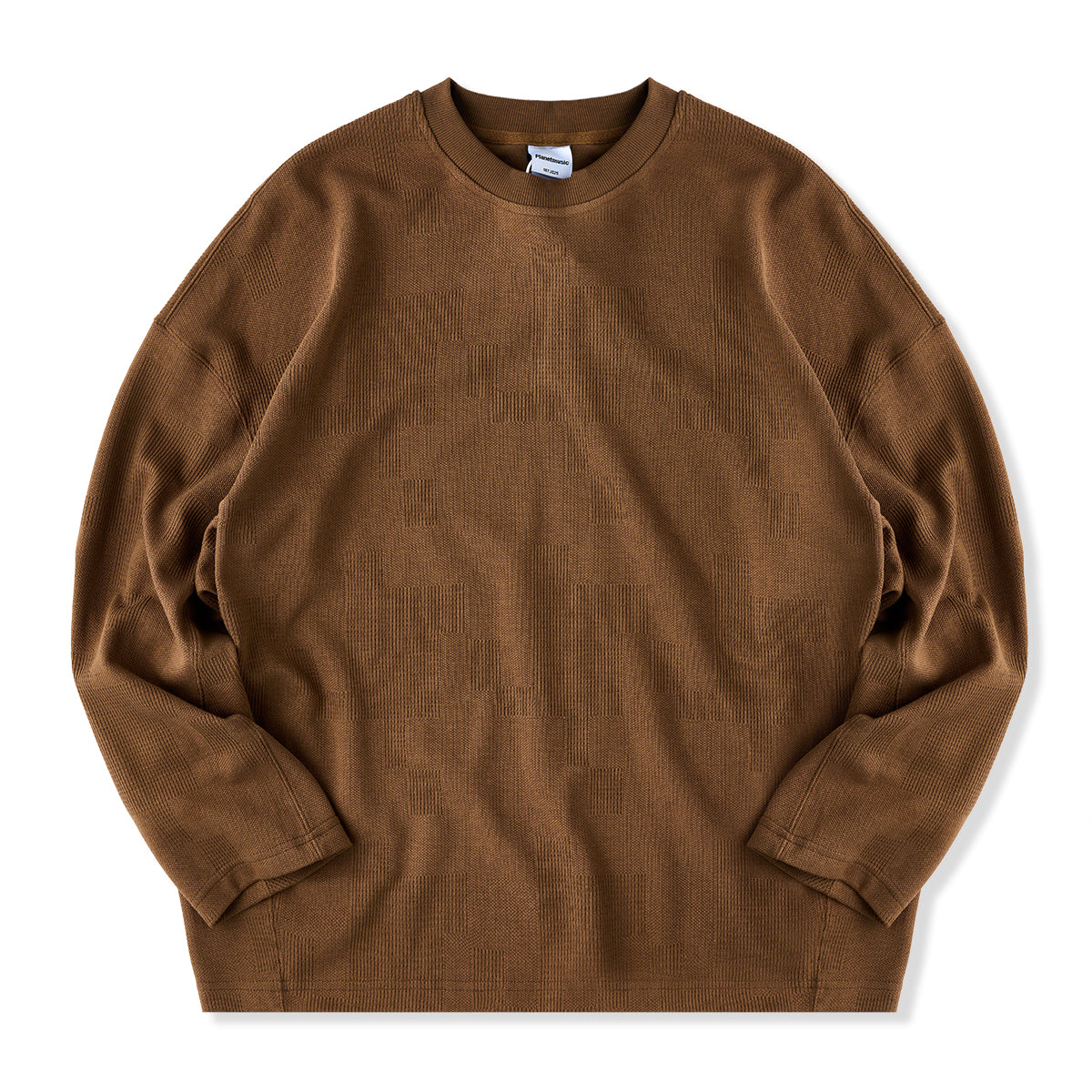 全体的にピクセルアートのような幾何学的な模様が織り込まれて、シンプルなデザインにアクセントを加えています。一部がリブ編みのような細かいテクスチャになって、立体感があります。
