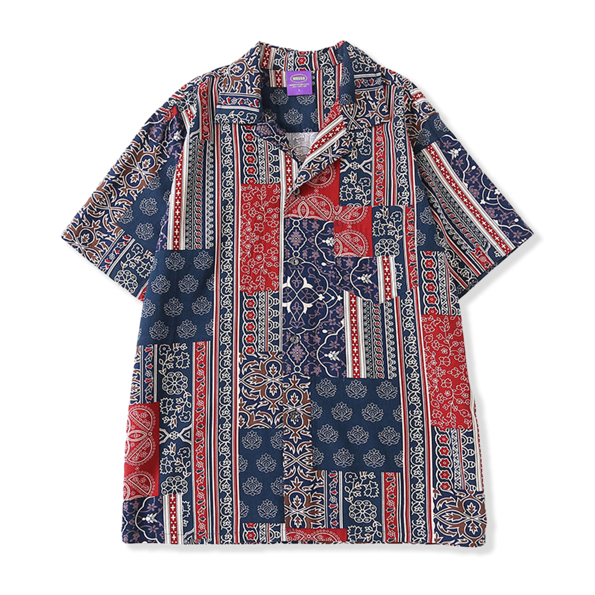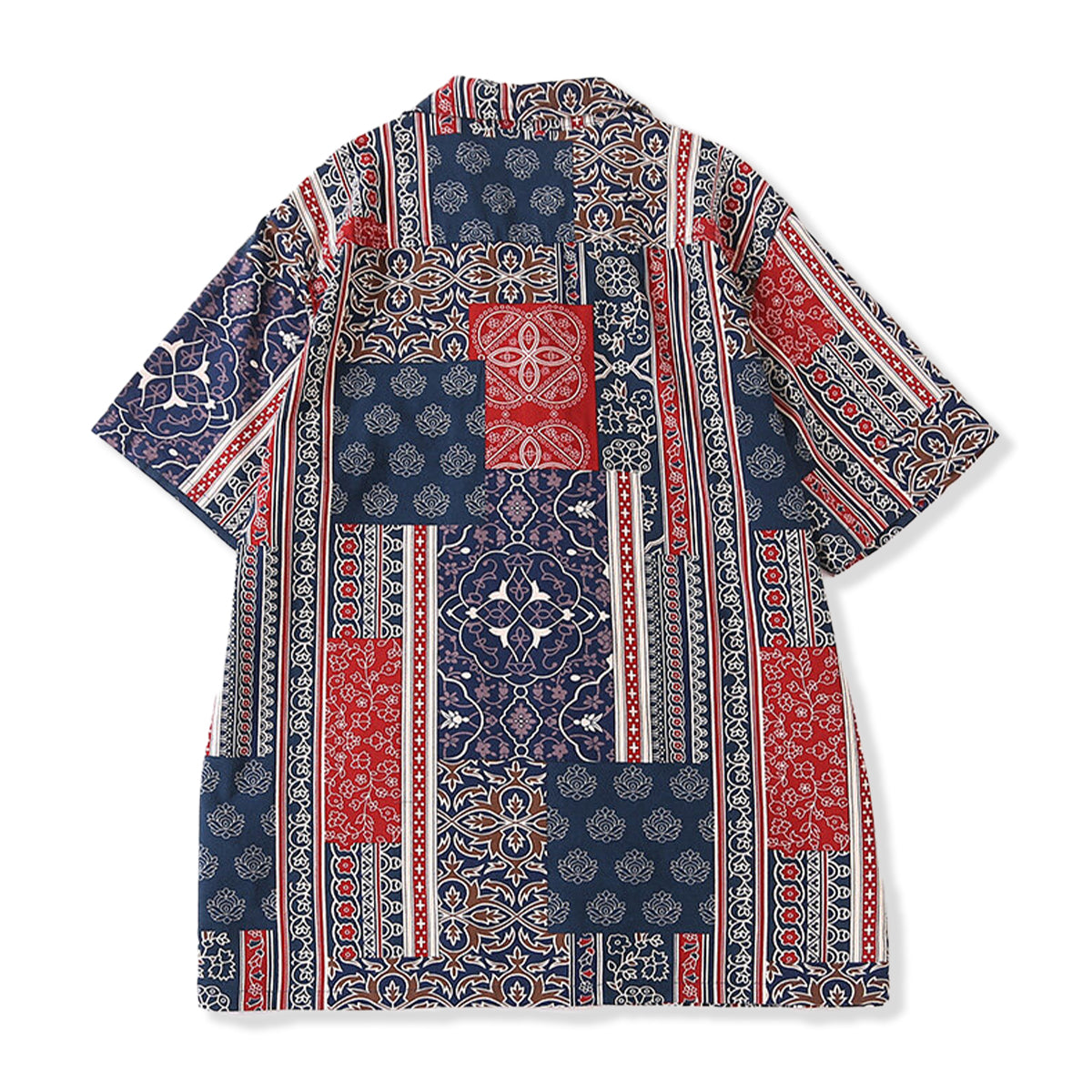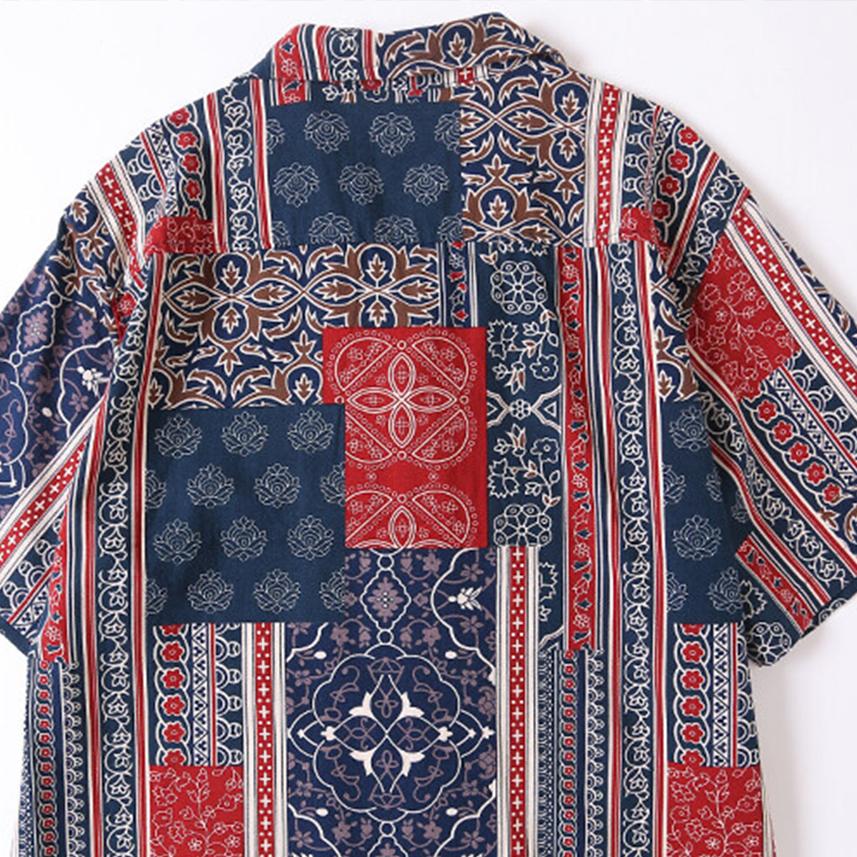 エスニック調 唐草風柄パッチワークオープンカラーシャツ