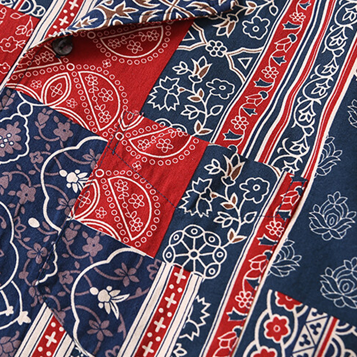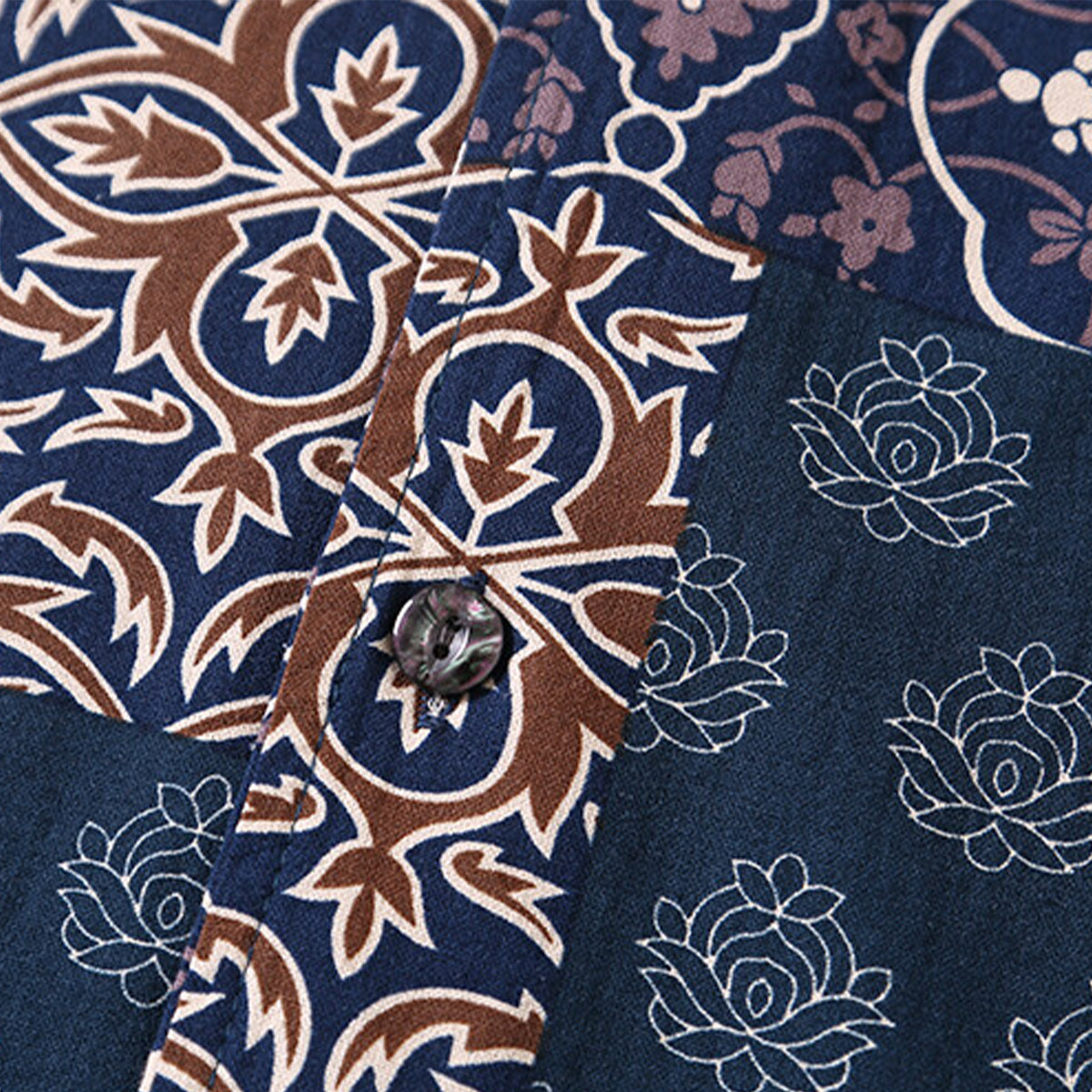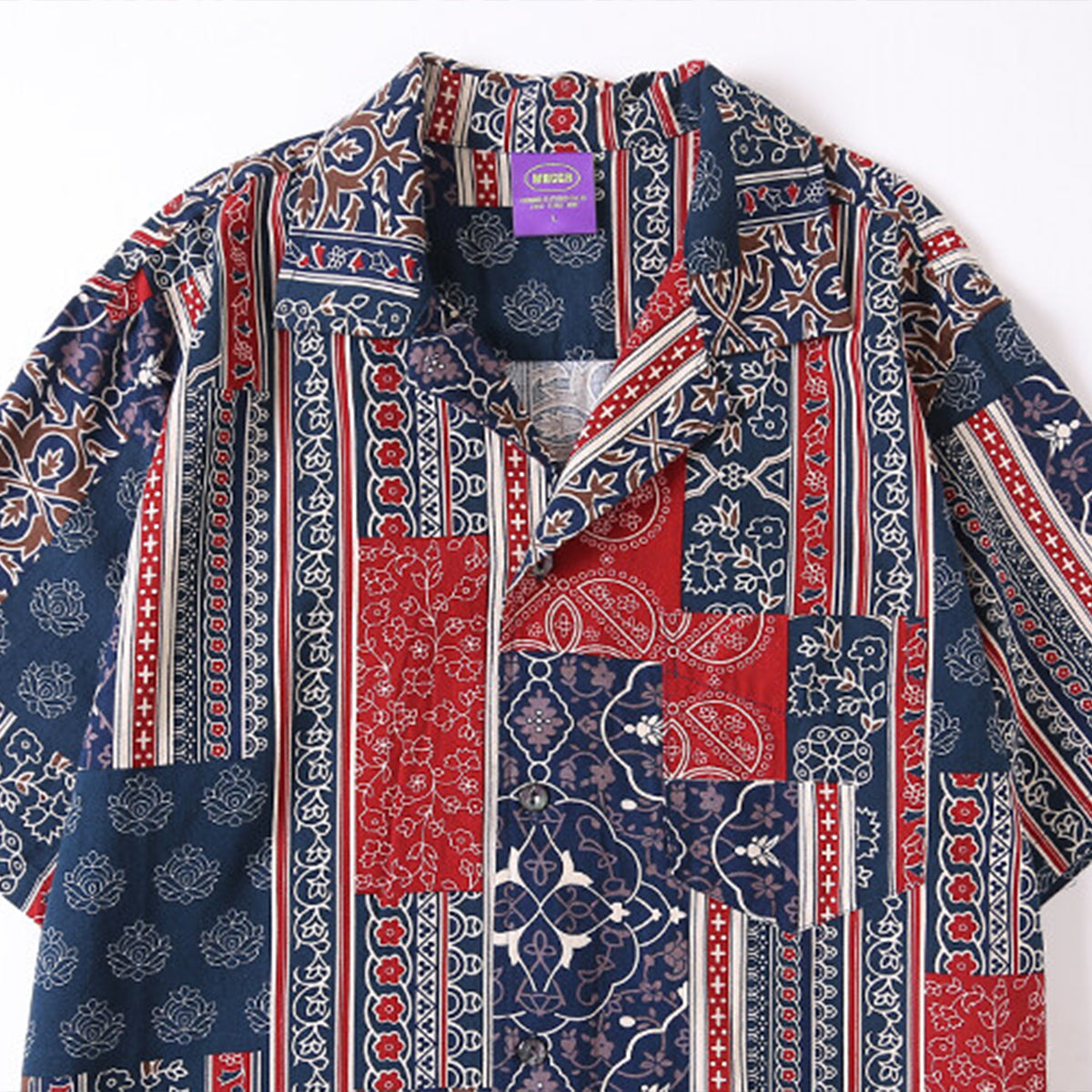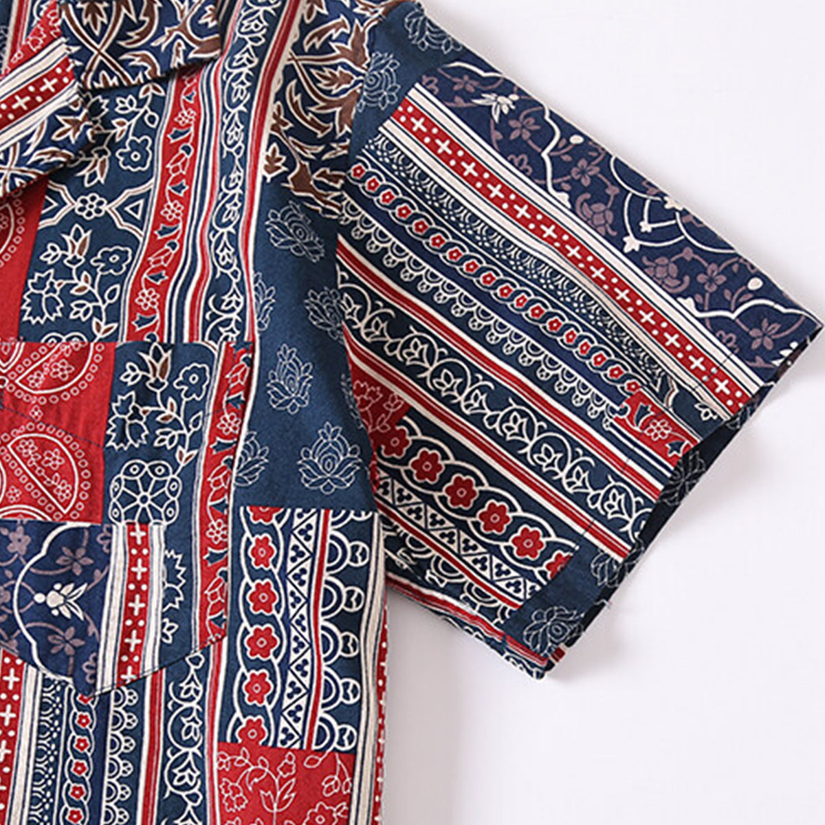 エスニック調 唐草風柄パッチワークオープンカラーシャツ