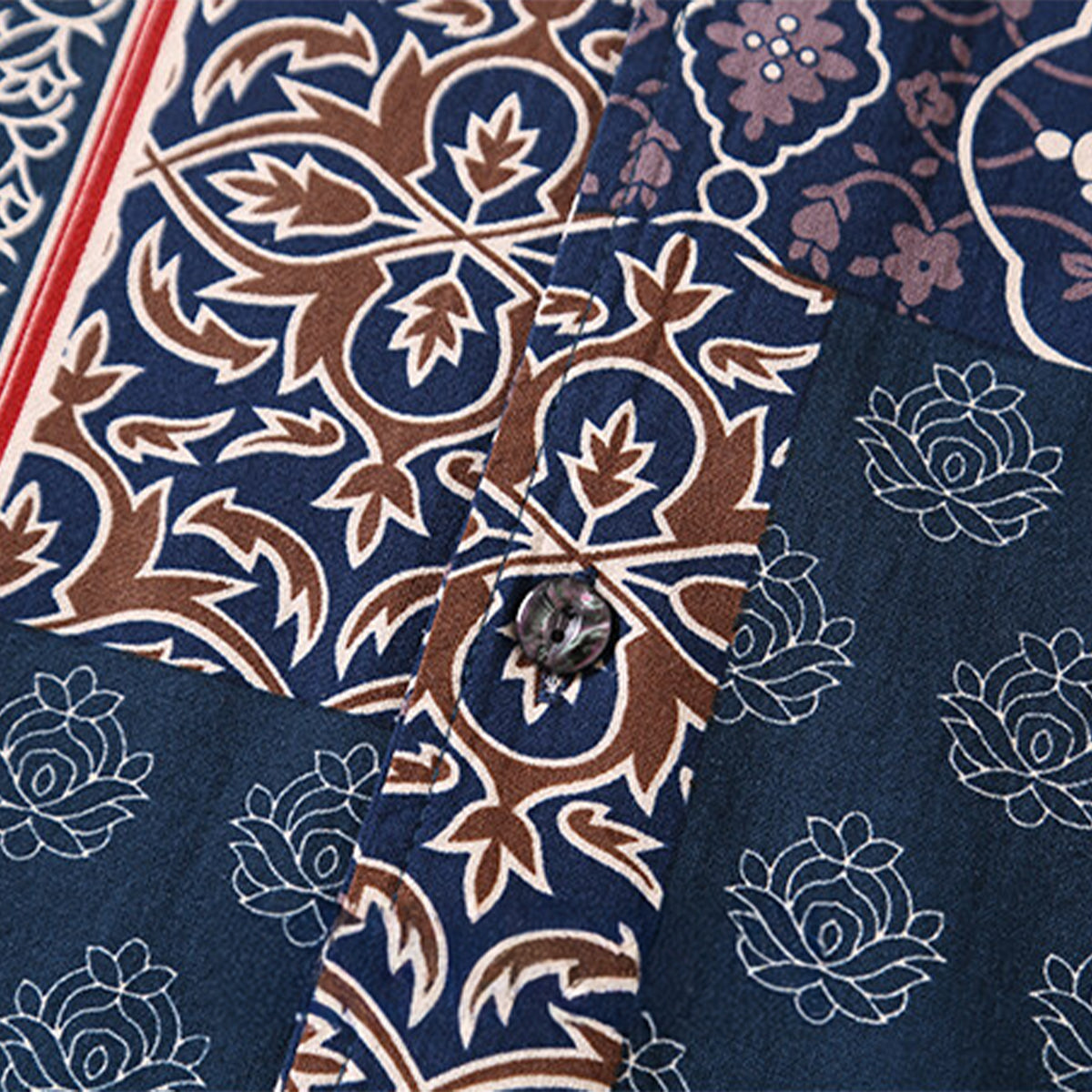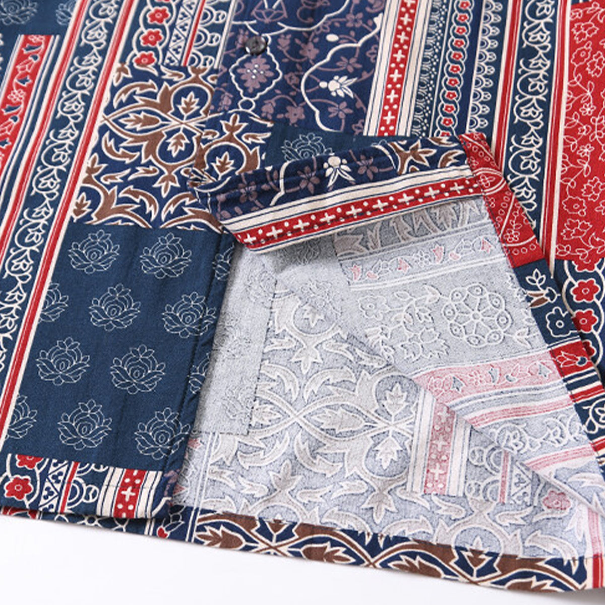 エスニックの風合いと和の趣が絶妙に融合した、唐草風柄のパッチワークオープンカラーシャツ。民族調のパターンをパッチワークしたデザインが印象的。異なる柄パッチの切り替えをランダムに配置することで、動きのある個性的な一枚に仕上げました。どこかヴィンテージ感も漂いながら、現代のスタイリングにもなじむ絶妙なバランス感覚が魅力です。ゆったりとしたシルエットとオープンカラーが、リラックス感のある着心地を実現。アート感覚で着こなせる、大人のための遊び心をプラスした一着。
