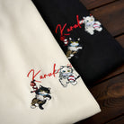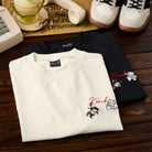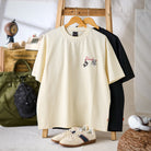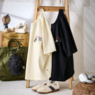 遊び心あふれる猫たちが主役のコットンTシャツが登場!胸元には、ブランド名「Karaku」にぶら下がる2匹の猫を刺繍で表現。黒猫はロープにぶら下がり、白猫は片手でしっかり掴まりながら、もう一方の手でちゃっかり野球ボールを抱える姿が愛らしいワンポイントに。猫たちの仕草の違いが個性を引き立て、見るたびにクスッと笑えるデザインです。裾には赤いタグのディテール付きで、細部にまでこだわった一枚。シンプルながらも個性を演出したい日にぴったりのTシャツです。