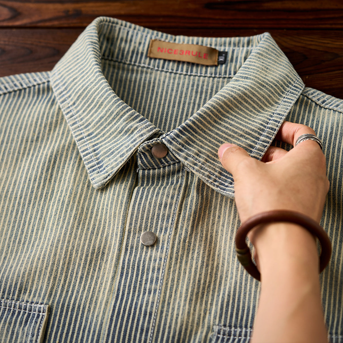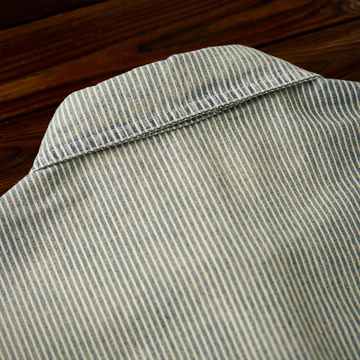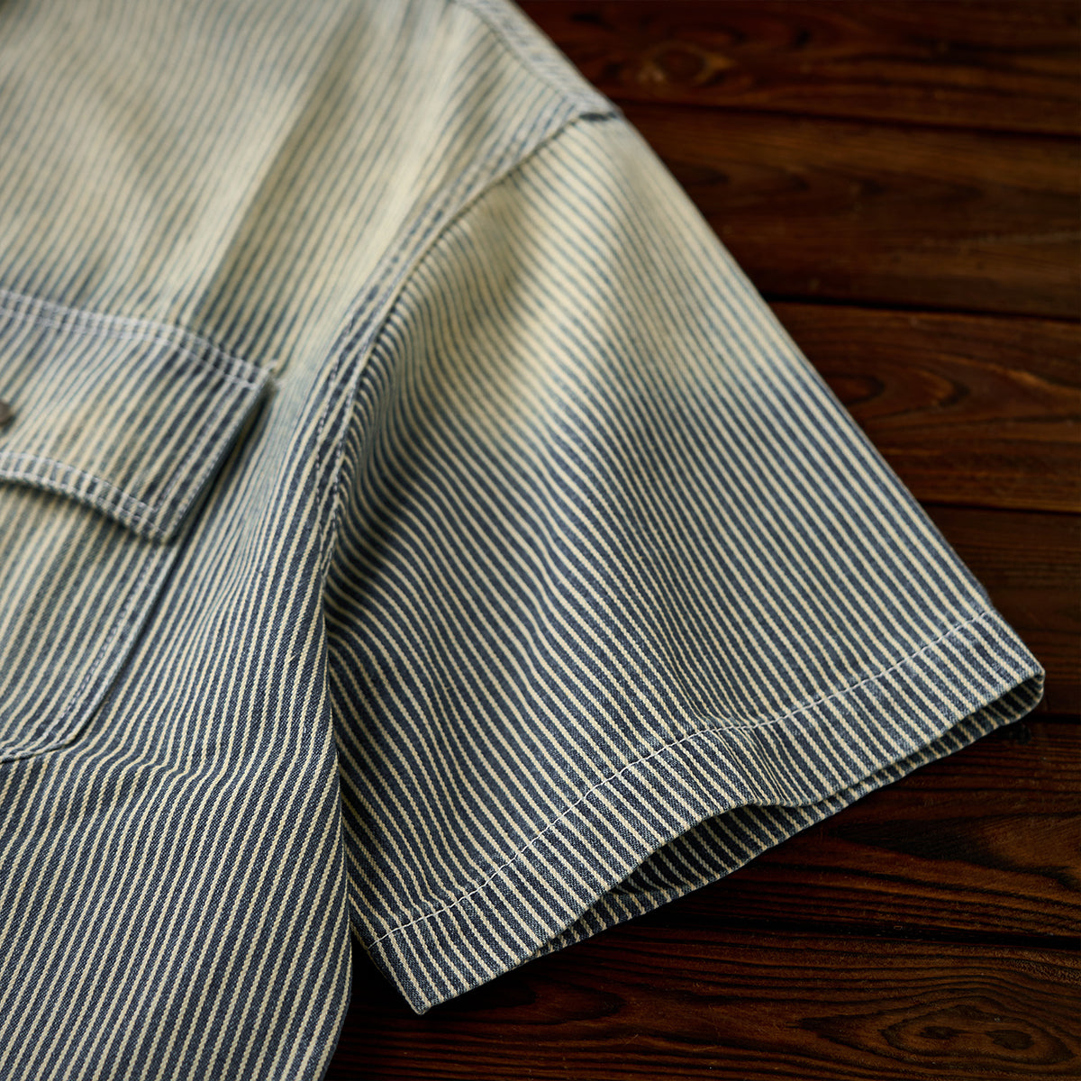 【予約】肘パッチ入り ハーフボタン付きストライプ柄デニムプルオーバーシャツ