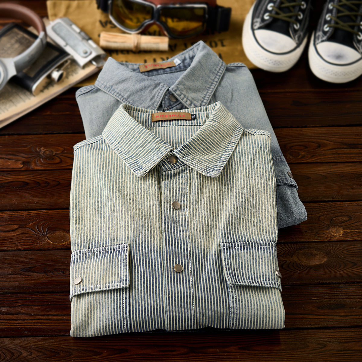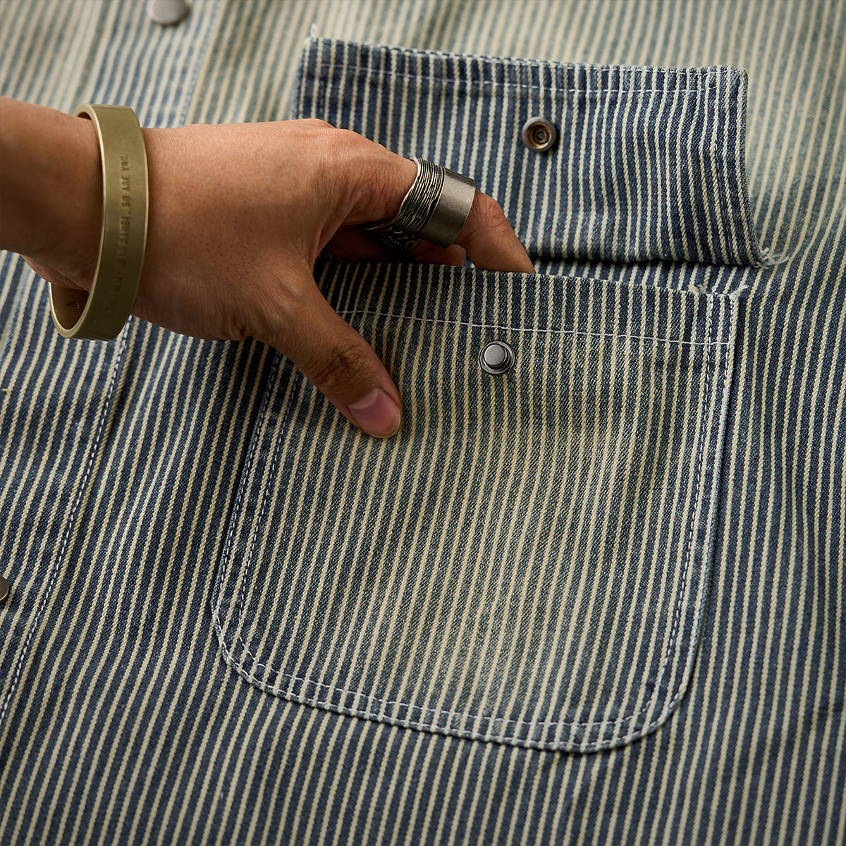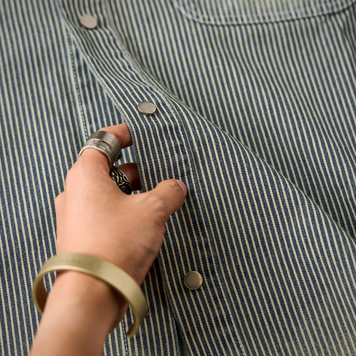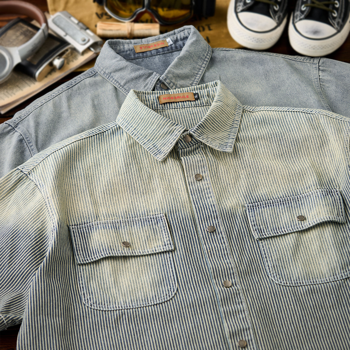 【予約】肘パッチ入り ハーフボタン付きストライプ柄デニムプルオーバーシャツ