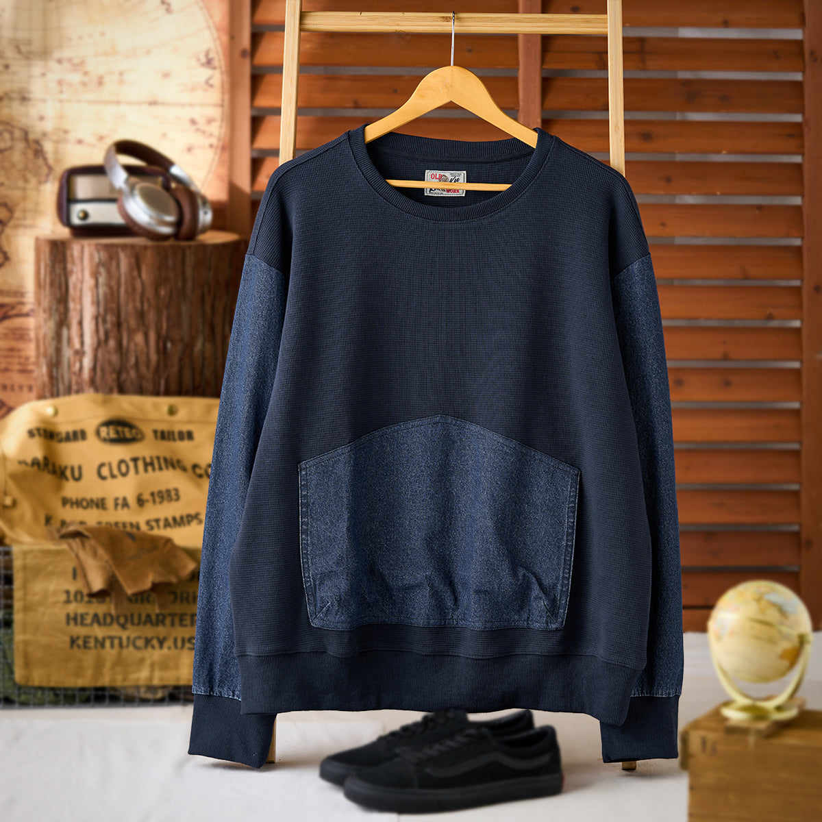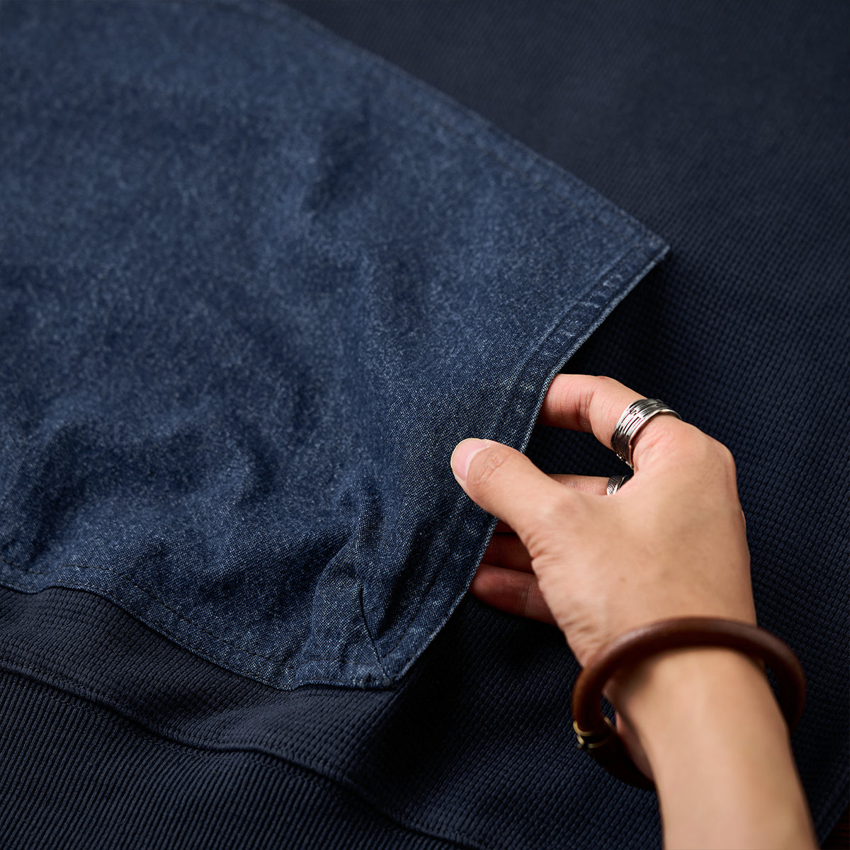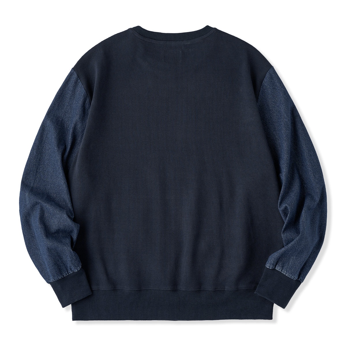 袖・ポケットウォッシュドデニム切替 ワッフルプルオーバースウェット