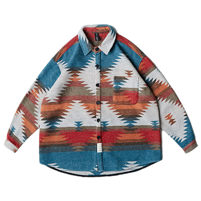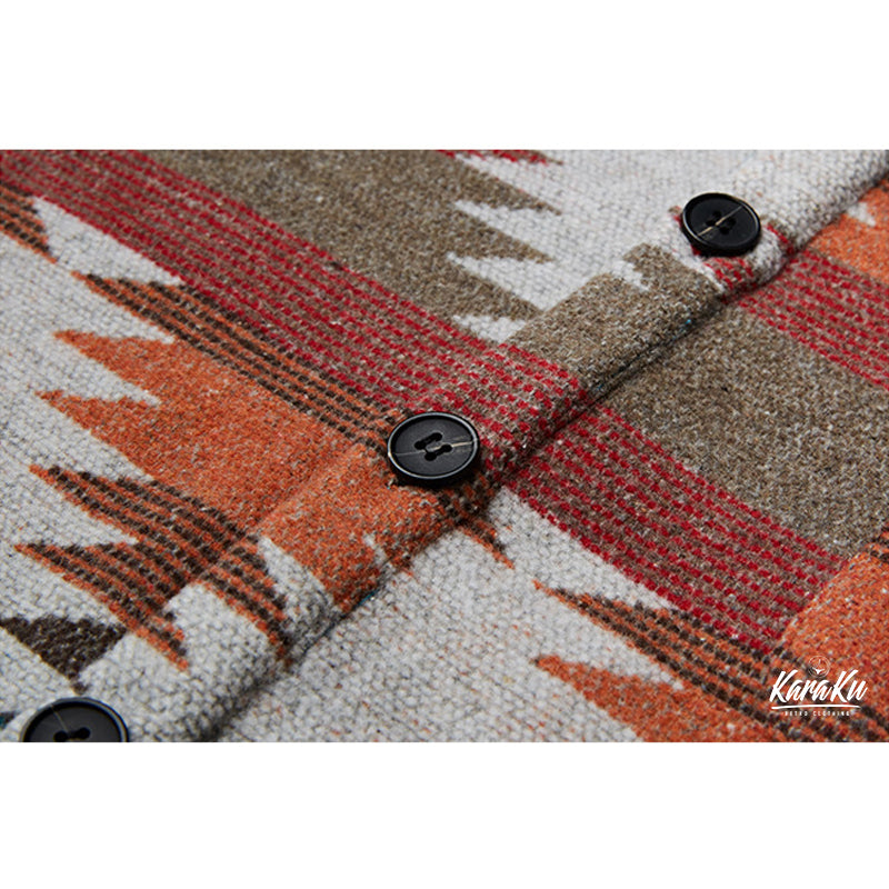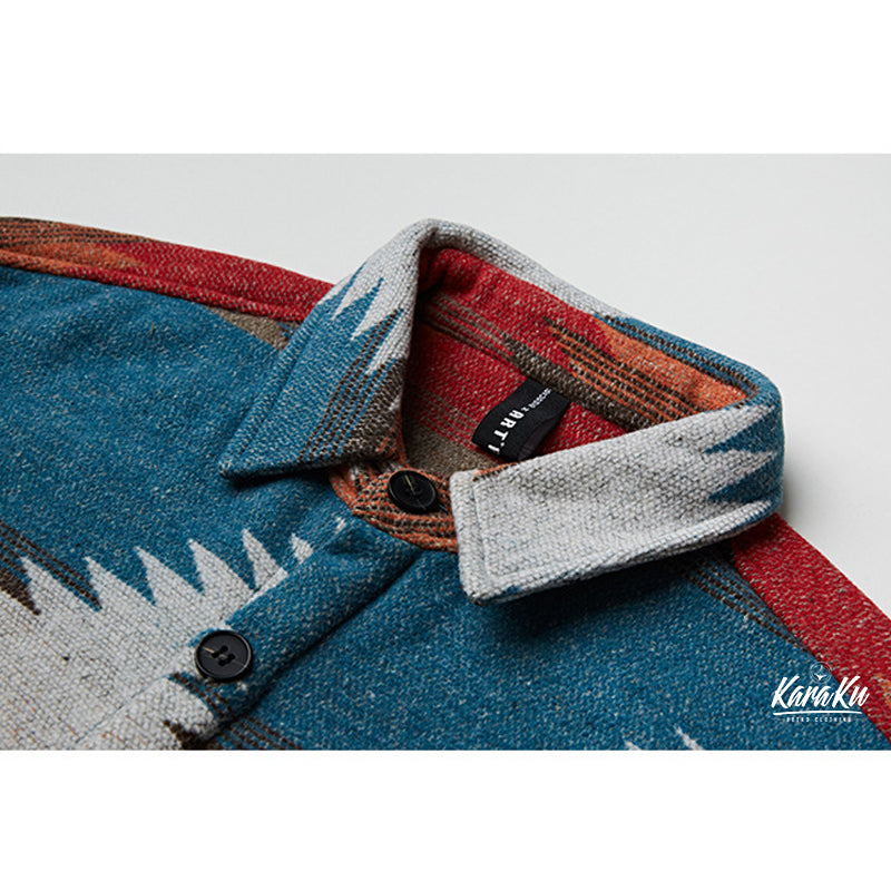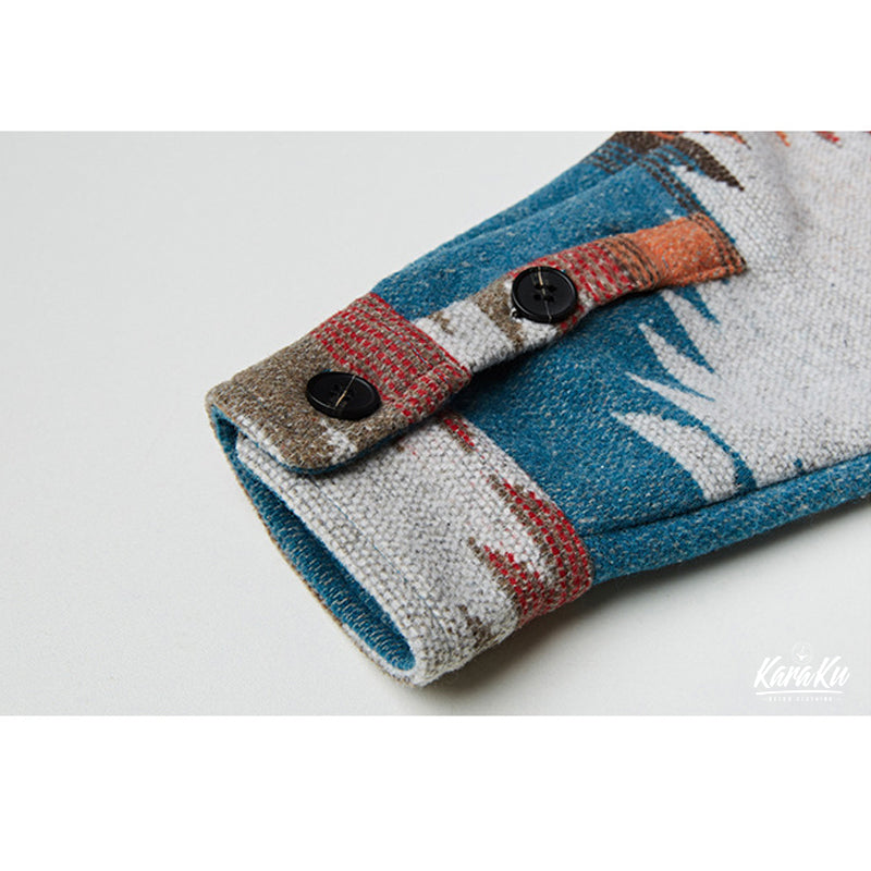本アイテムは民族的な模様を乗せた独創的なシャツ。まるで表と裏を反対にしているような、凹凸感のあるテクスチャーがこだわりのポイント。やや丸みを帯びた独特のバルーンシルエットが特徴的。胸元に1つポケットを配置。やわらかくほのかにドライタッチな風合いで着心地良く仕上げました。速乾性・耐久性に優れるポリエステルに保温性のあるウールを加える事で、暖かいのに軽くて強度と光沢感がある素材となります。程よくゆったりとしたシルエットが魅力で、民族模様の柄が特徴で、アイテムの色を拾ったボトムスをセレクトすると、スタイルにまとまりが生まれます。