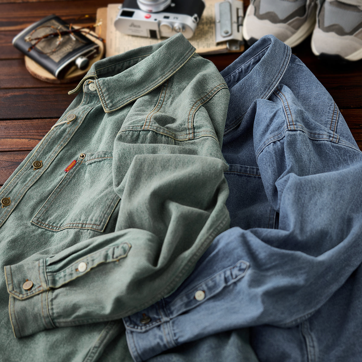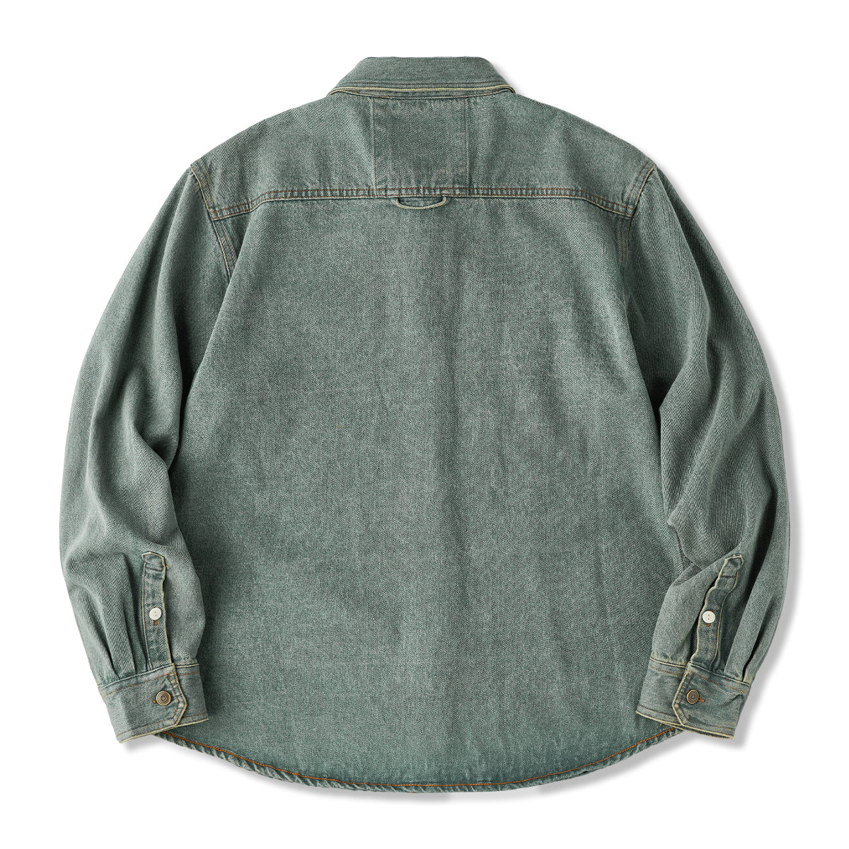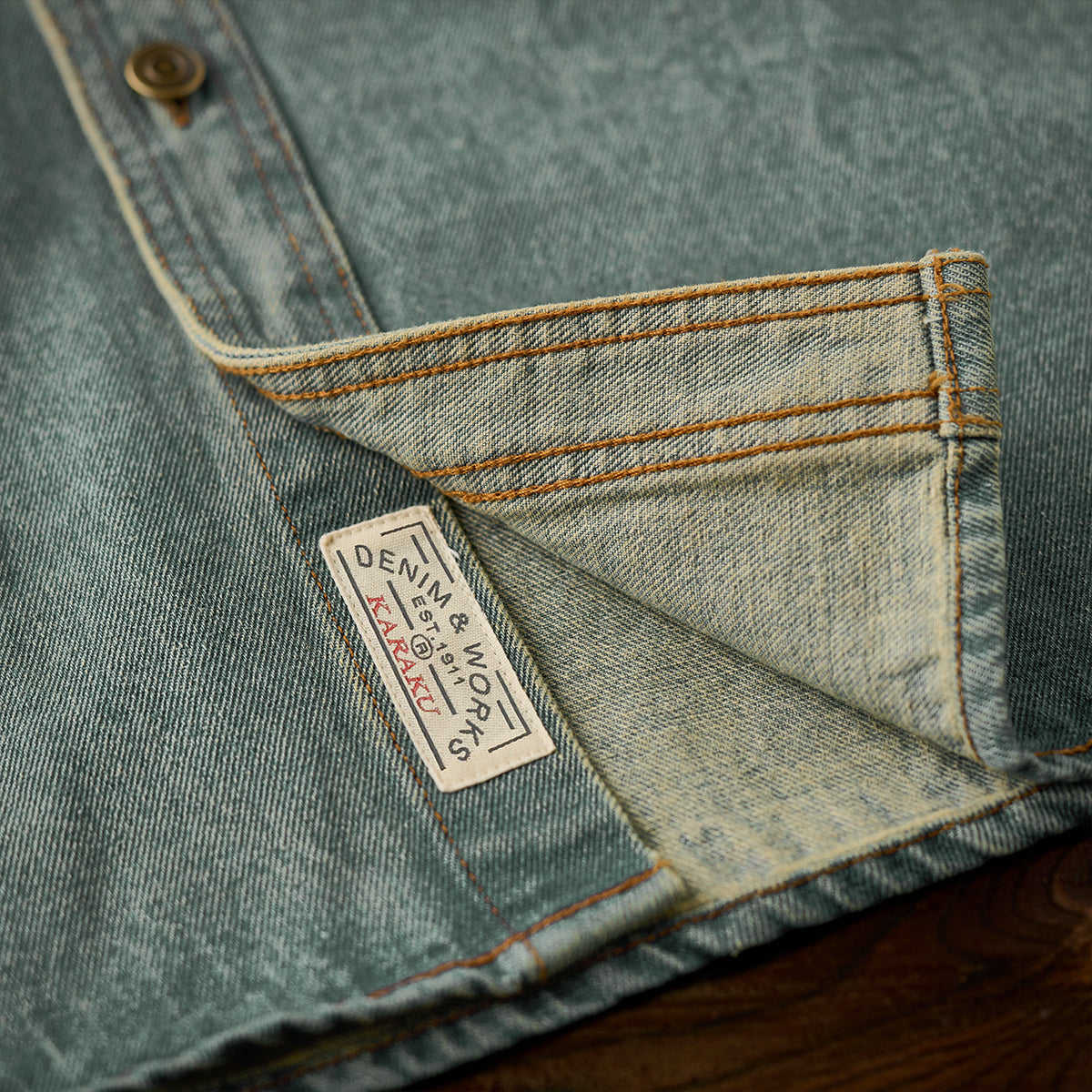 Karaku×川又聡「夢豹」豹柄プリント切替 ターコイズ調ボタン付きピーチスキンシャツ