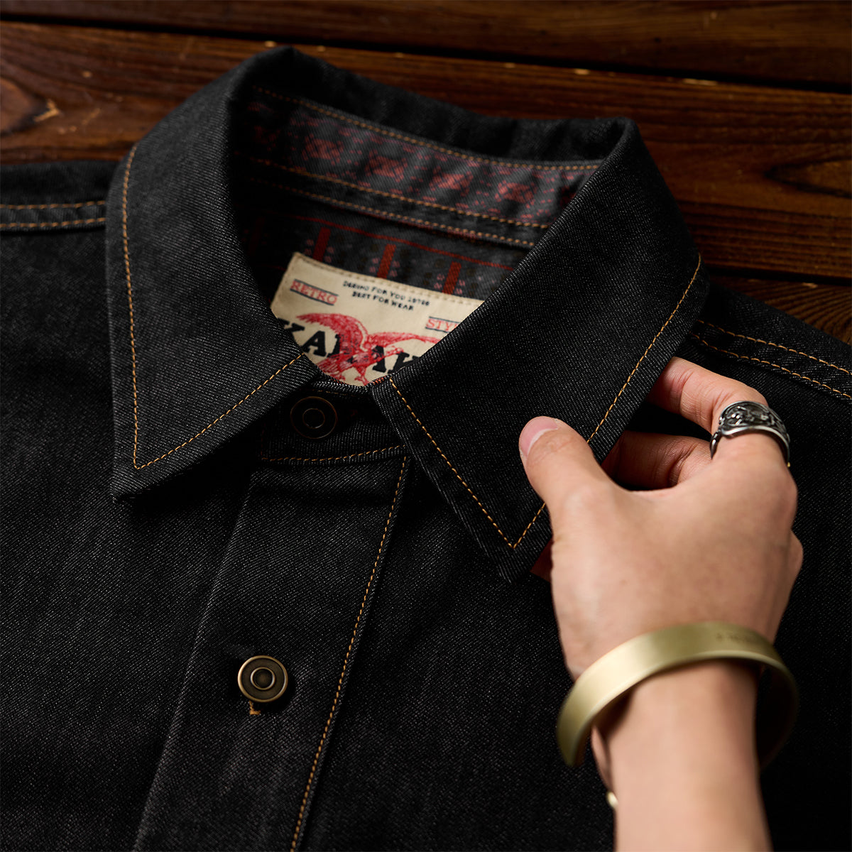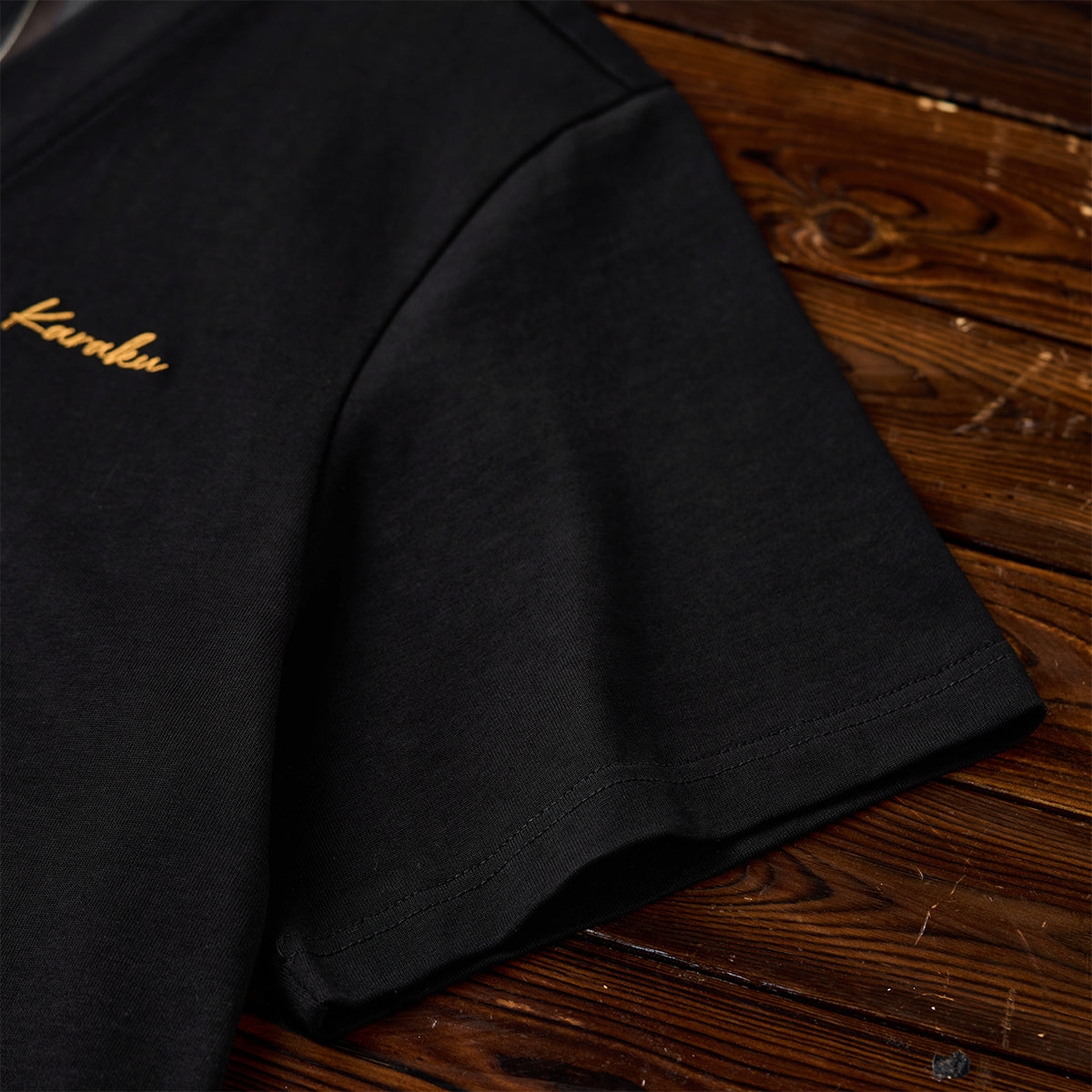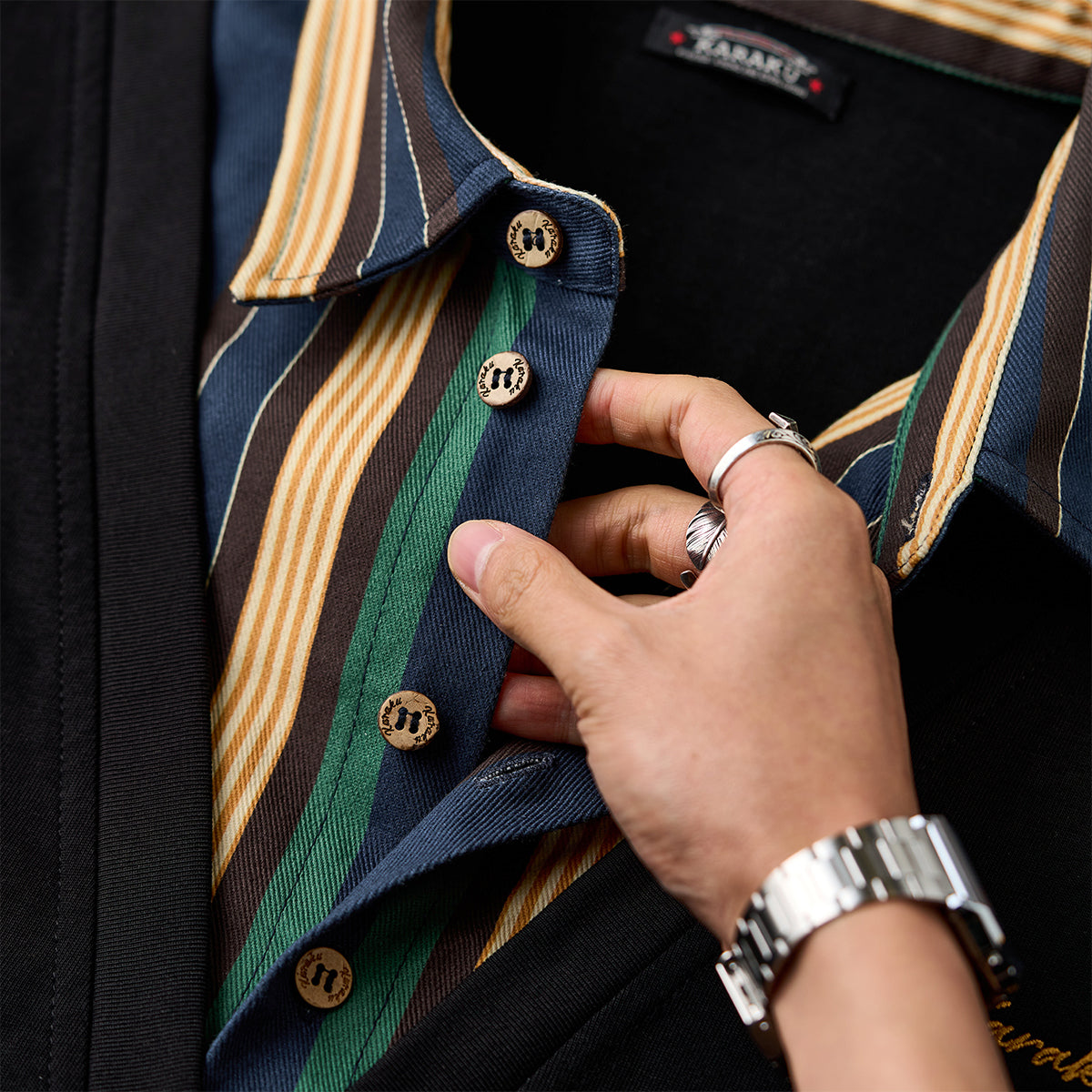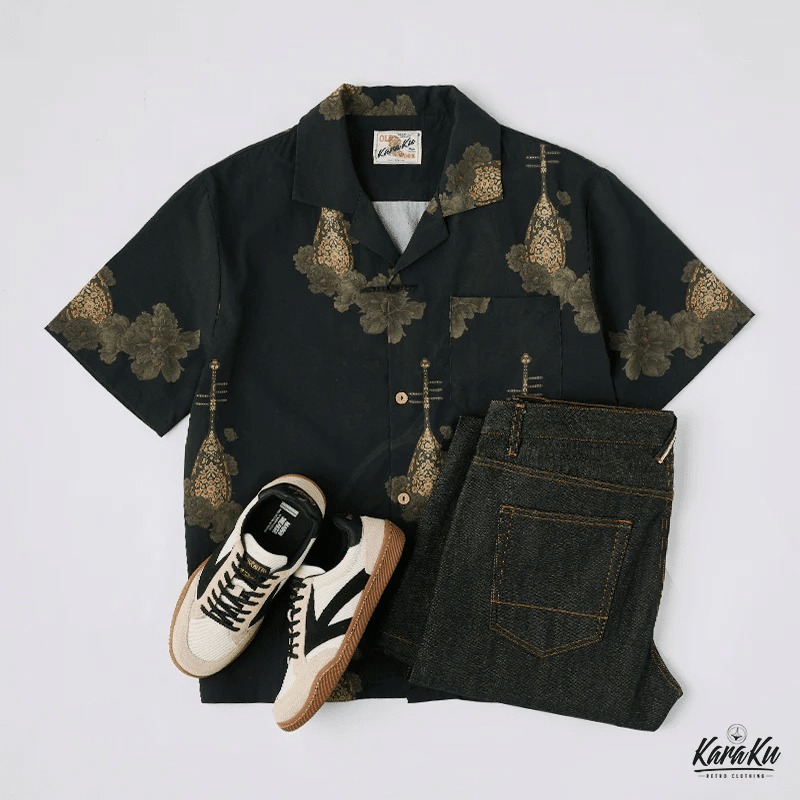 東洋の伝統美と現代のファッション感覚を融合させたデザインを目指しました。ブラックを基調とし、シャツ全体に施された水墨画風の琵琶と牡丹の図案が、静かな中に力強さを秘めた雰囲気を醸し出しています。