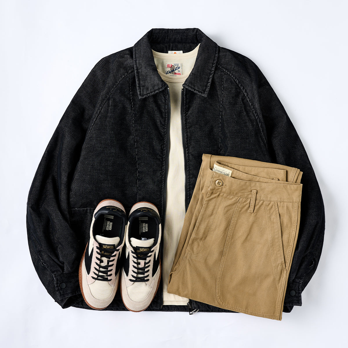 表地はコーデュロイ素材で、細かい畝が特徴的です。コーデュロイはカジュアルでありながら、高級感もある独特な質感を持っています。