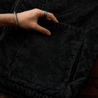 両サイドに大きめのパッチポケットが配置されており、実用性とデザイン性を兼ね備えています。袖口にはスナップボタンが付いており、フィット感を調整可能です。