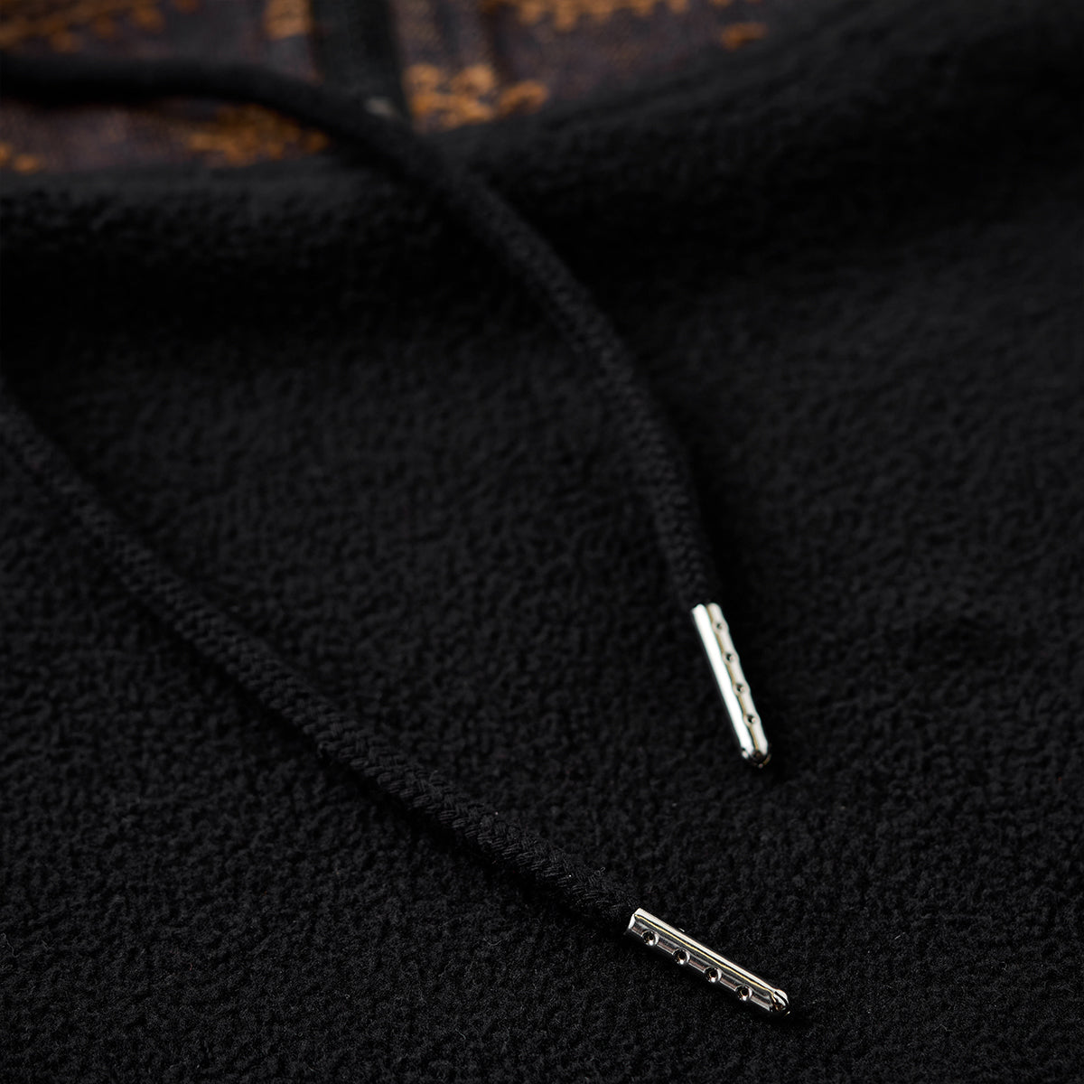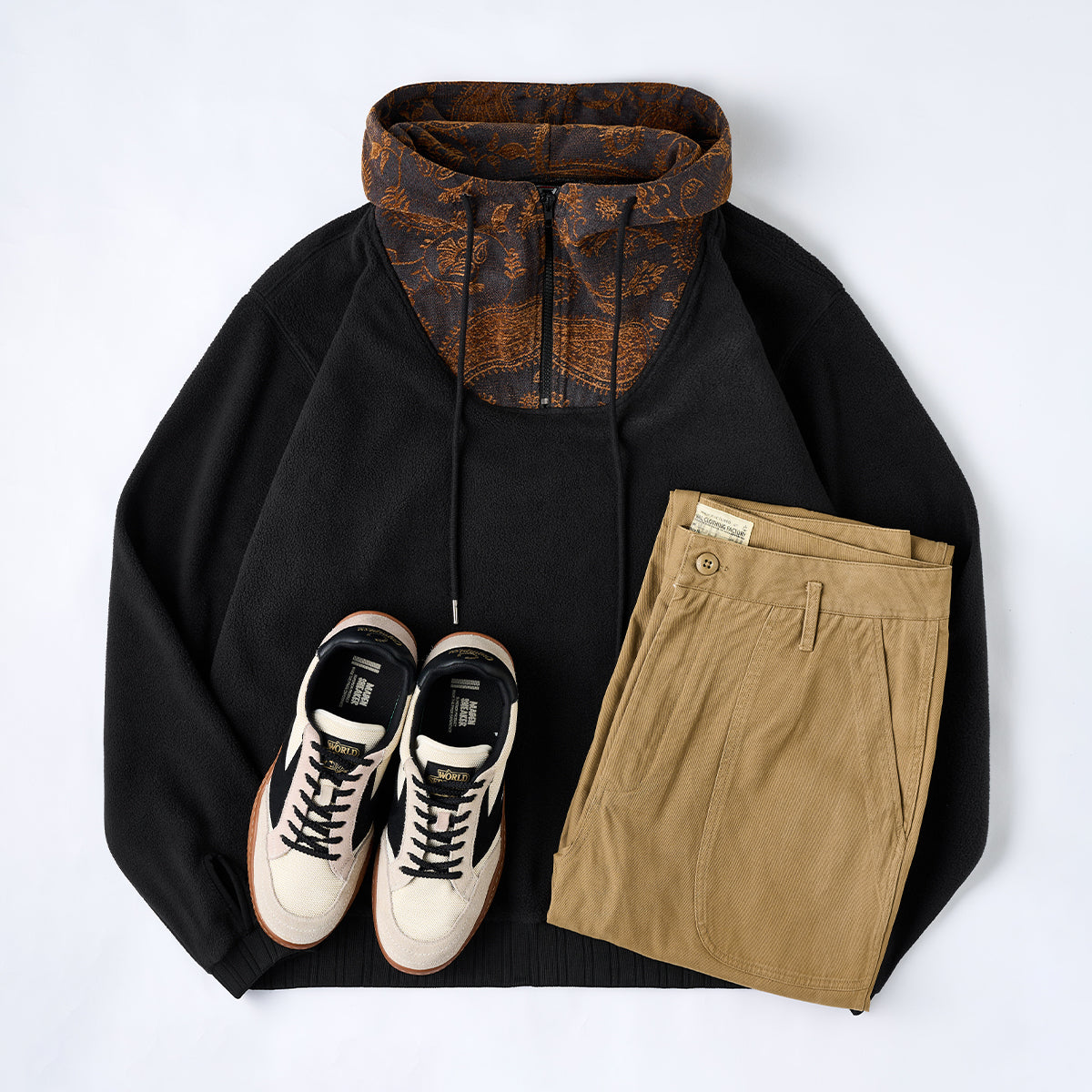 柔らかなフリース素材をベースに、ペイズリー柄のシェニル生地で切り替えたハーフジップパーカー。フードにはドローコードを備え、気温やスタイルに合わせてシルエットの調整が可能です。異素材の組み合わせが生み出す立体感と、ヴィンテージライクなペイズリー柄が印象的な一着です。軽くて暖かく、デイリーからアウトドアシーンまで幅広く活躍。ゆったりとしたシルエットで、インナーとのレイヤードも楽しめます。