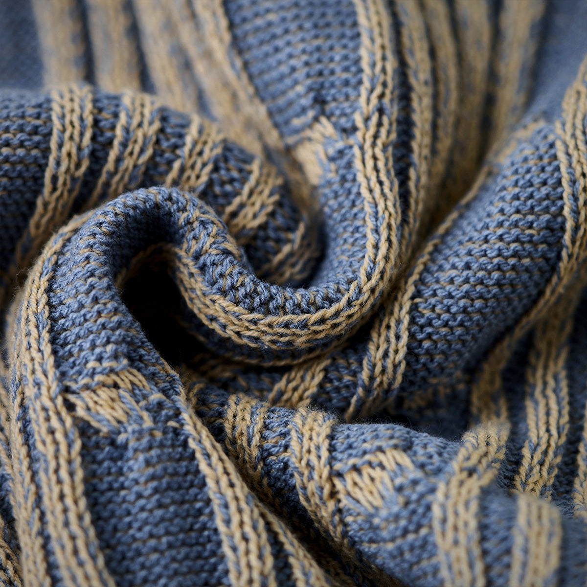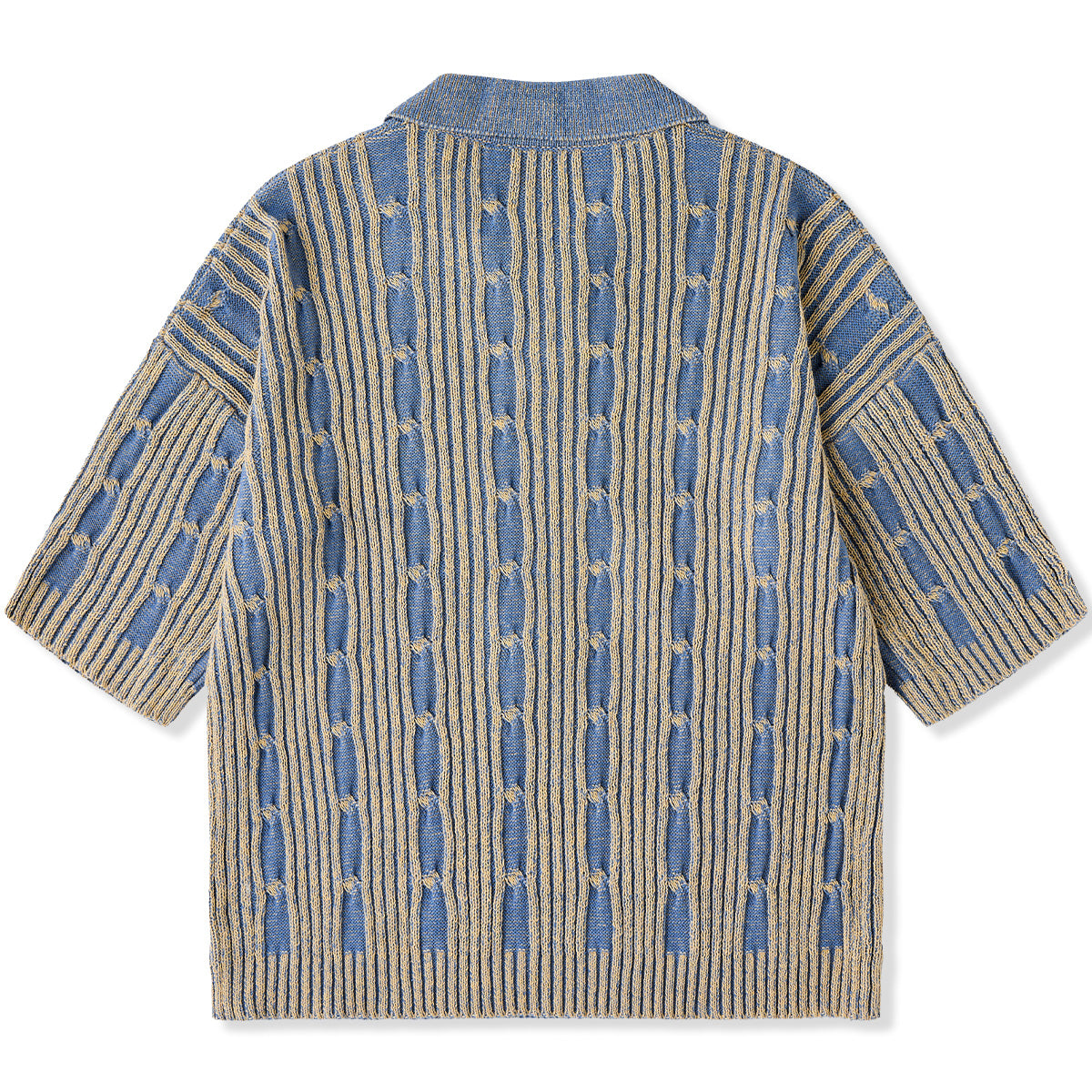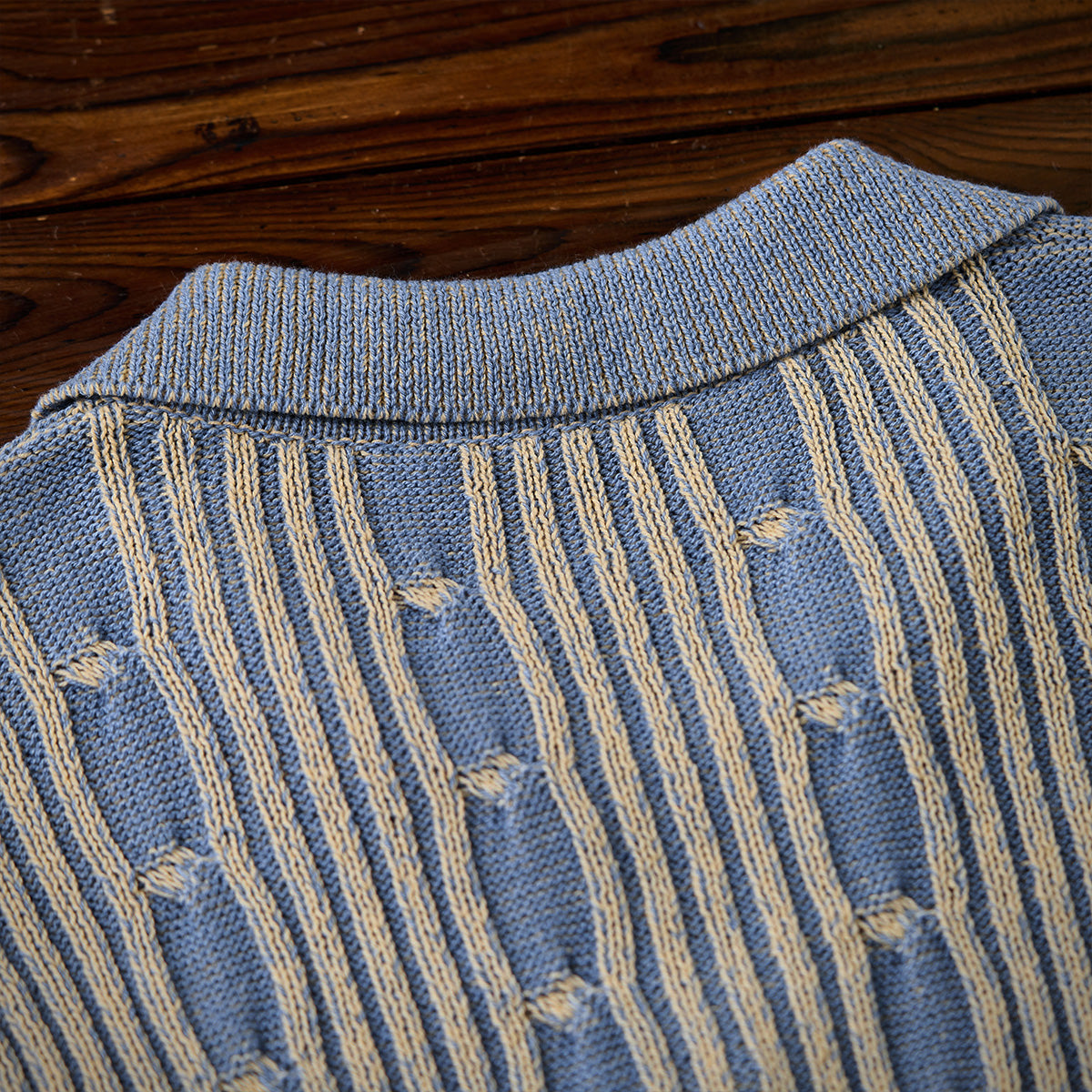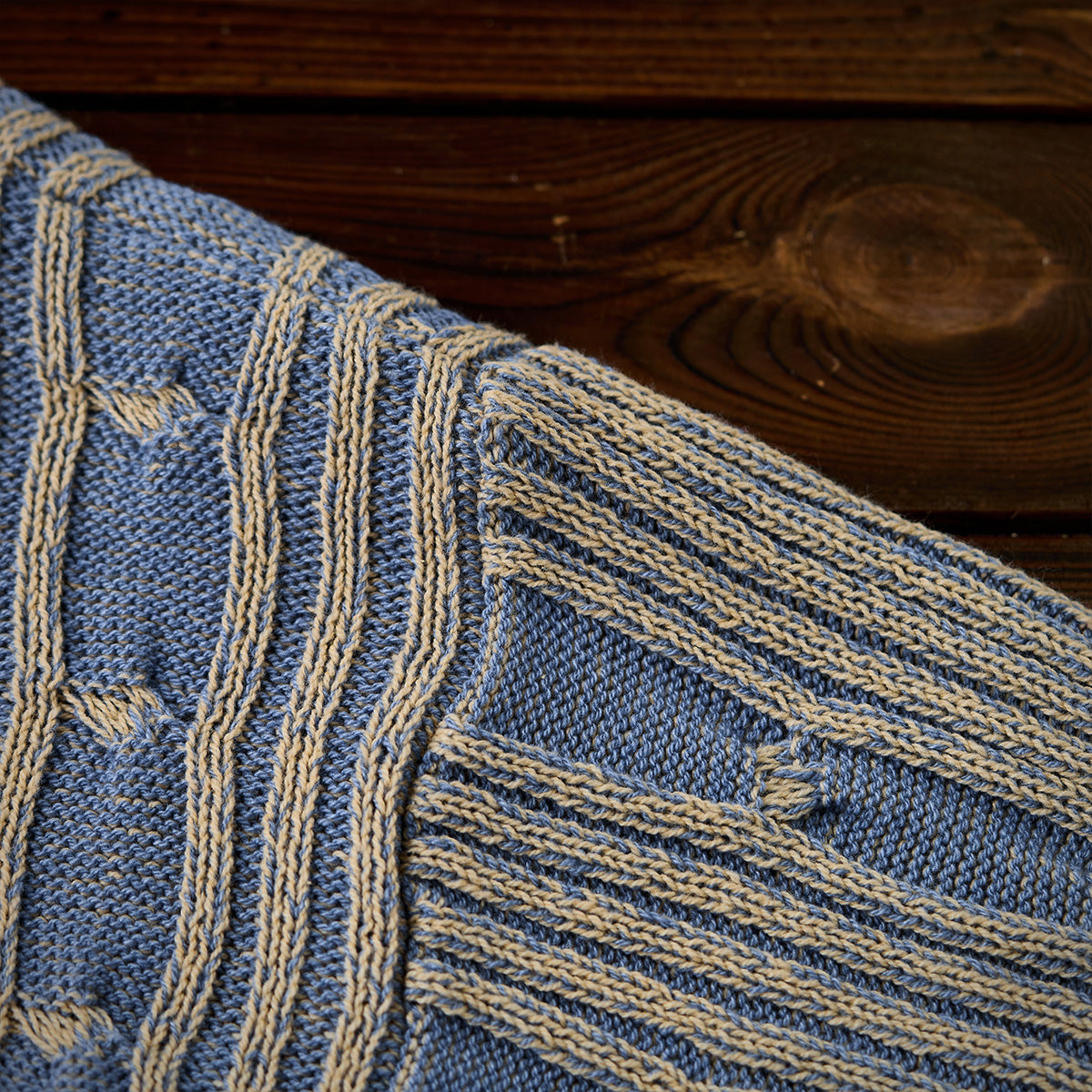 表面はリブ編みの立体感があり、適度な伸縮性とフィット感を備えています。縦方向のラインと、編み目の「結び目」パターンが特徴的で、視覚的に奥行きを感じさせます。ブルーとベージュの2色使いが落ち着いたトーンを醸し出し、上品でクラシックな印象を与えています。