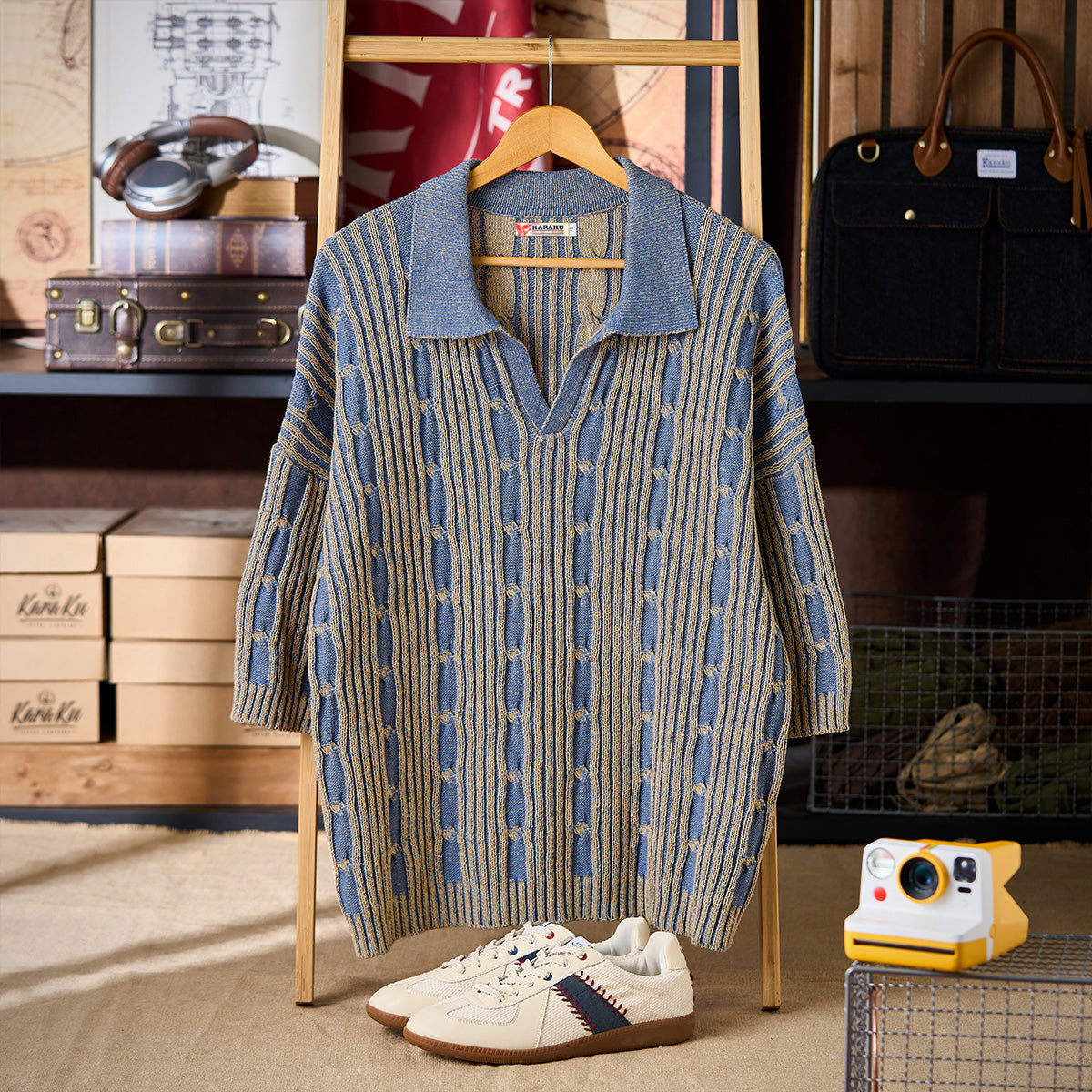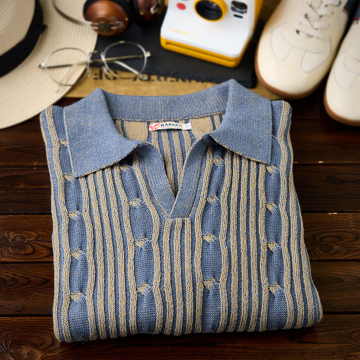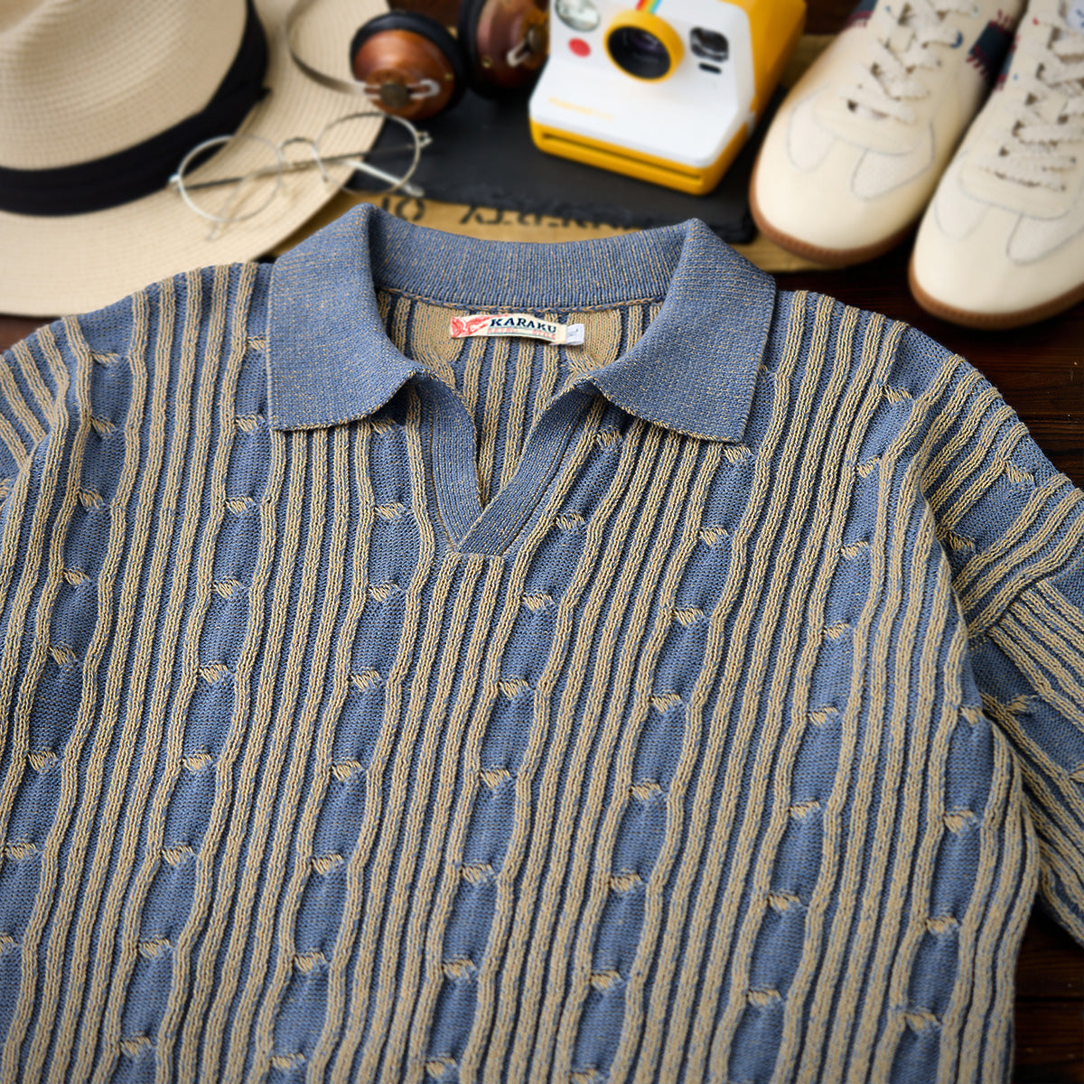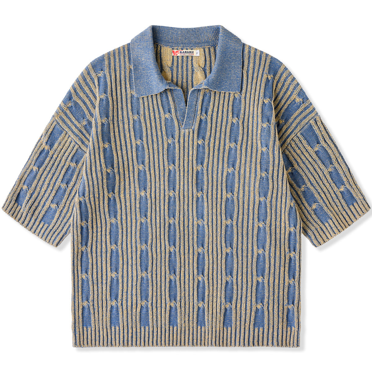 表面はリブ編みの立体感があり、適度な伸縮性とフィット感を備えています。縦方向のラインと、編み目の「結び目」パターンが特徴的で、視覚的に奥行きを感じさせます。ブルーとベージュの2色使いが落ち着いたトーンを醸し出し、上品でクラシックな印象を与えています。