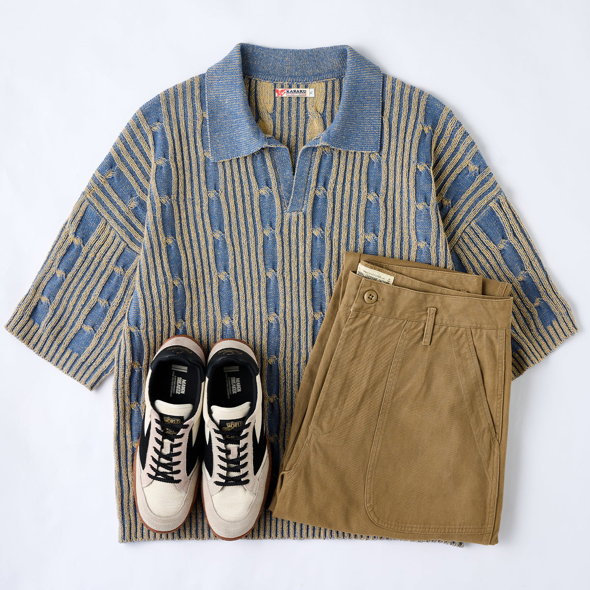 ベージュやホワイトのパンツと合わせることで、爽やかで統一感のあるコーディネートが完成します。デニムやチノパンと組み合わせることで、カジュアルな印象をプラスします。