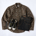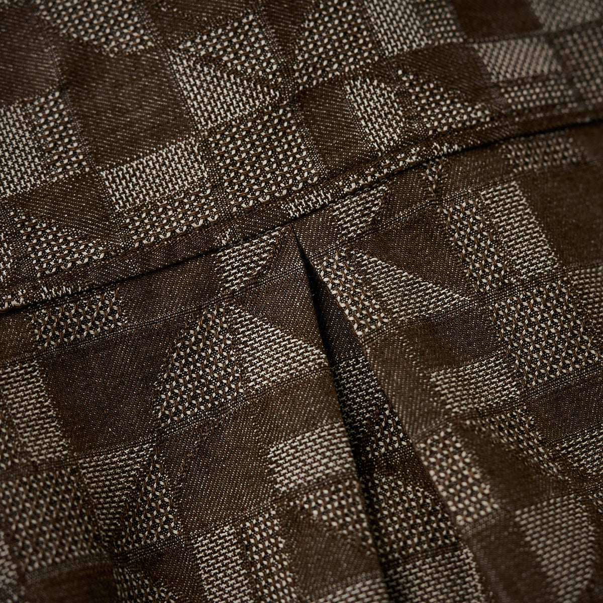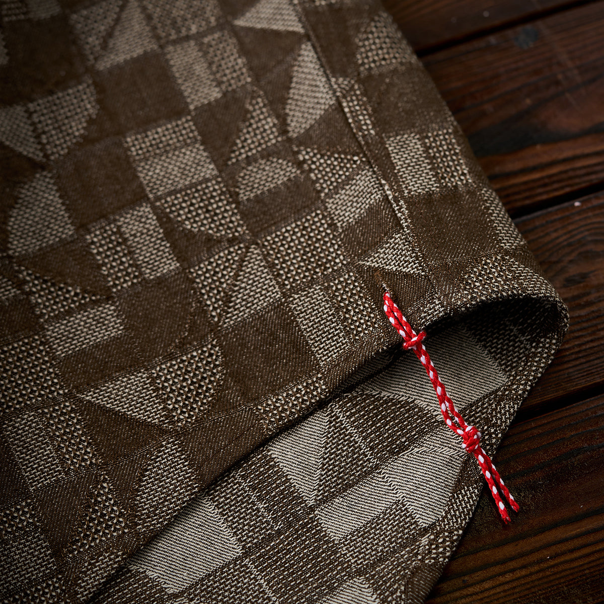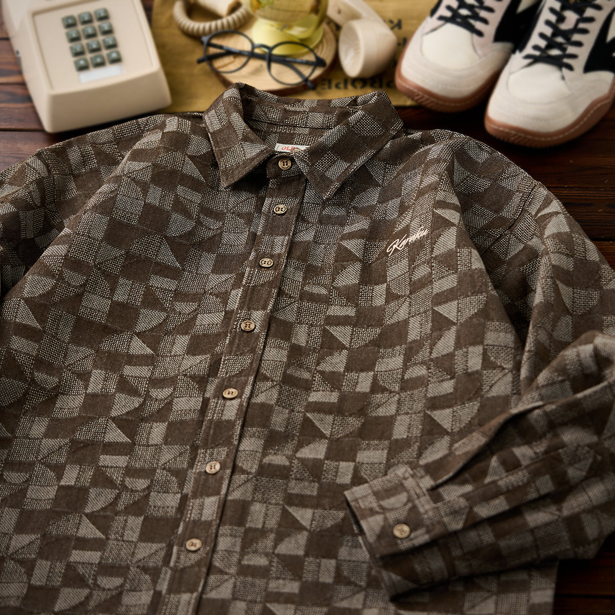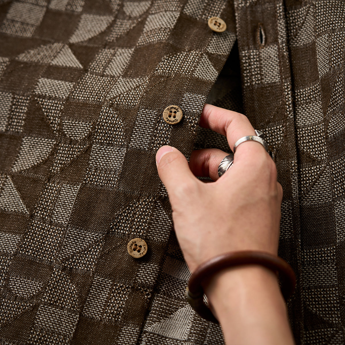 立体感のある幾何学模様をジャカード織りで表現したデニム生地に、KARAKUオリジナル刺繍をさりげなく添え、クラフト感とアート性を融合させました。裾には視線を引きつける赤ヒモを配し、和とエスニックのニュアンスを感じさせるアクセントに。一枚で主役になるデザイン性と、日常に取り入れやすい実用性を兼ね備えた、長く付き合いたくなるデニムシャツです。