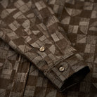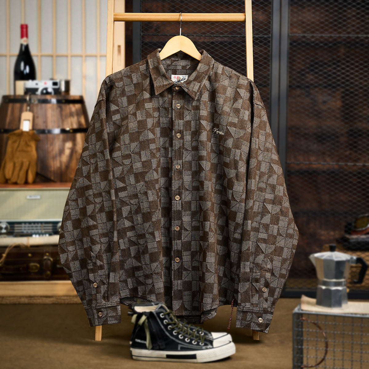 【予約】Karaku刺繍入り 赤ヒモ付き幾何学模様ジャカード織りデニムシャツ