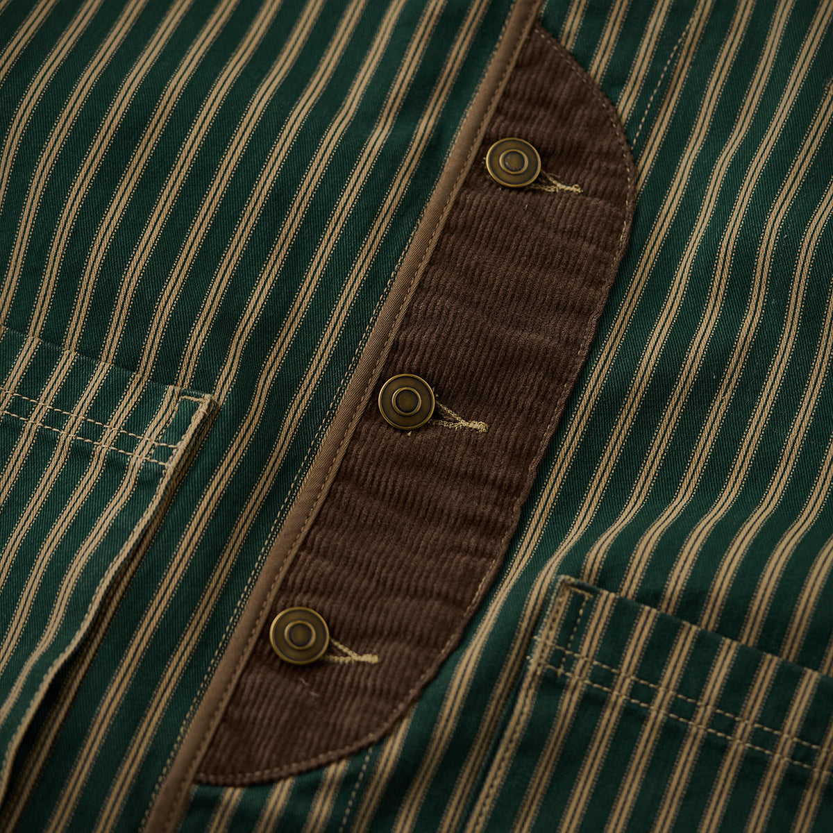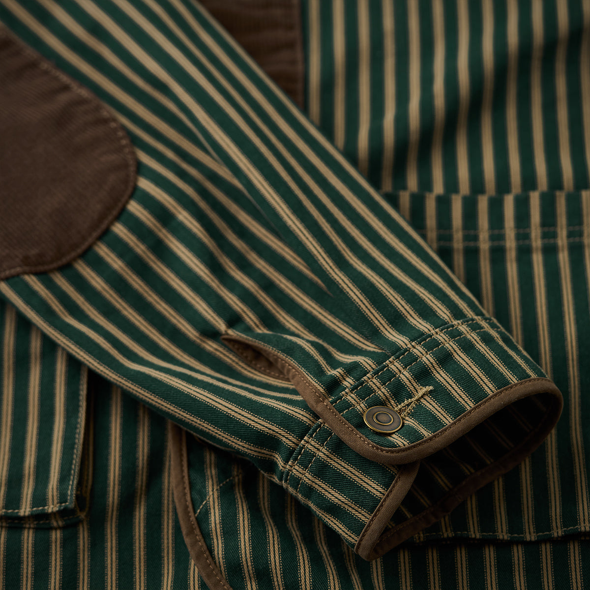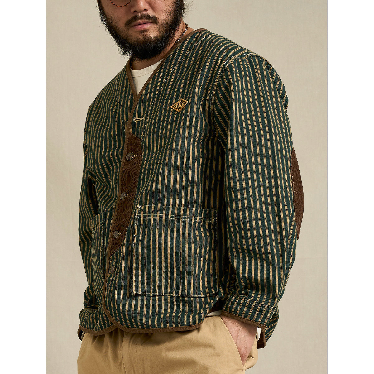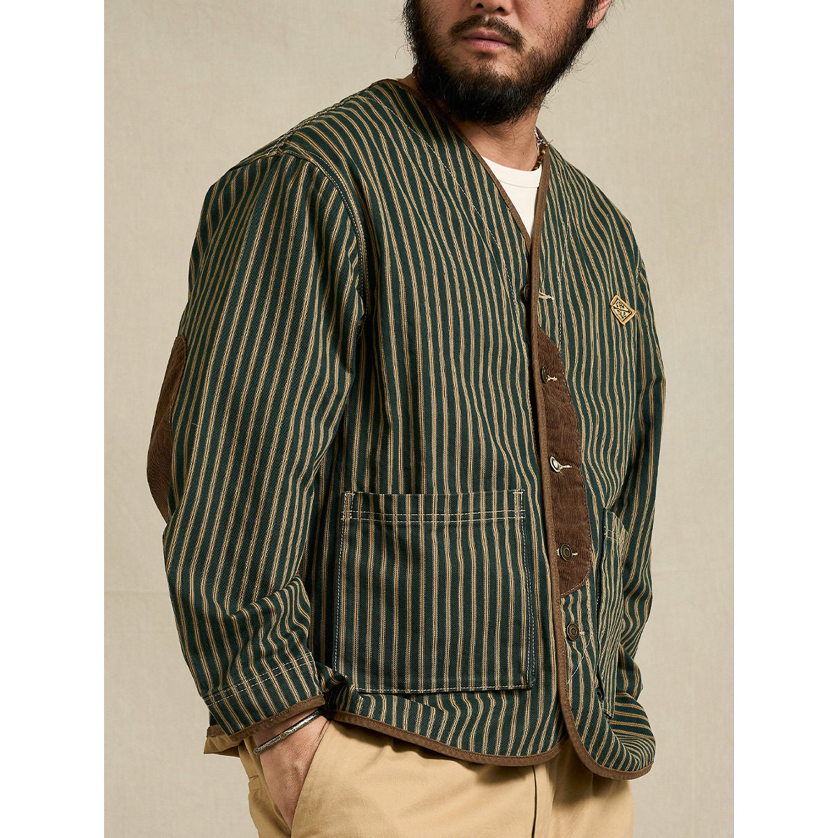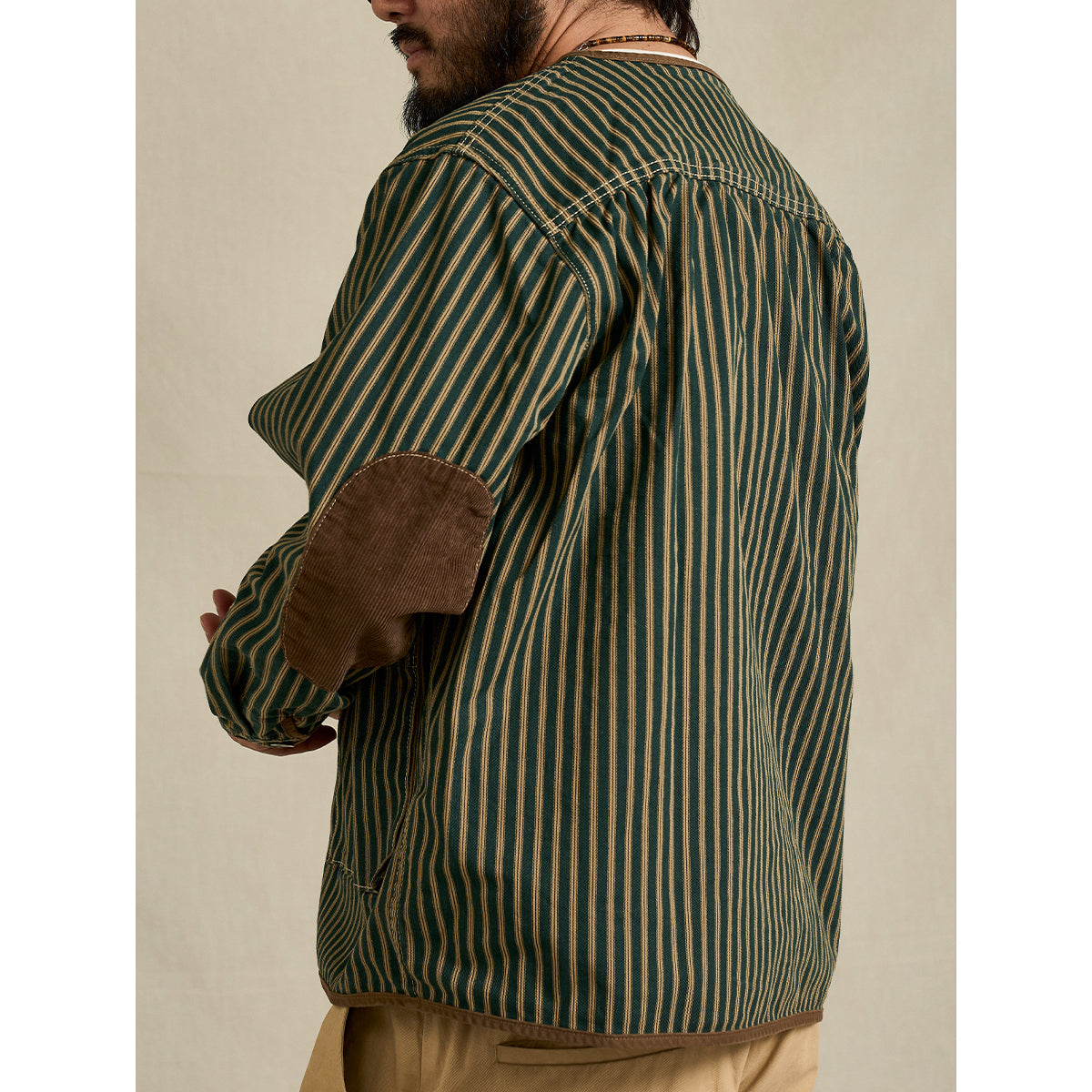 コーデュロイ切替・肘パッチ ストライプ柄ノーカラージャケット