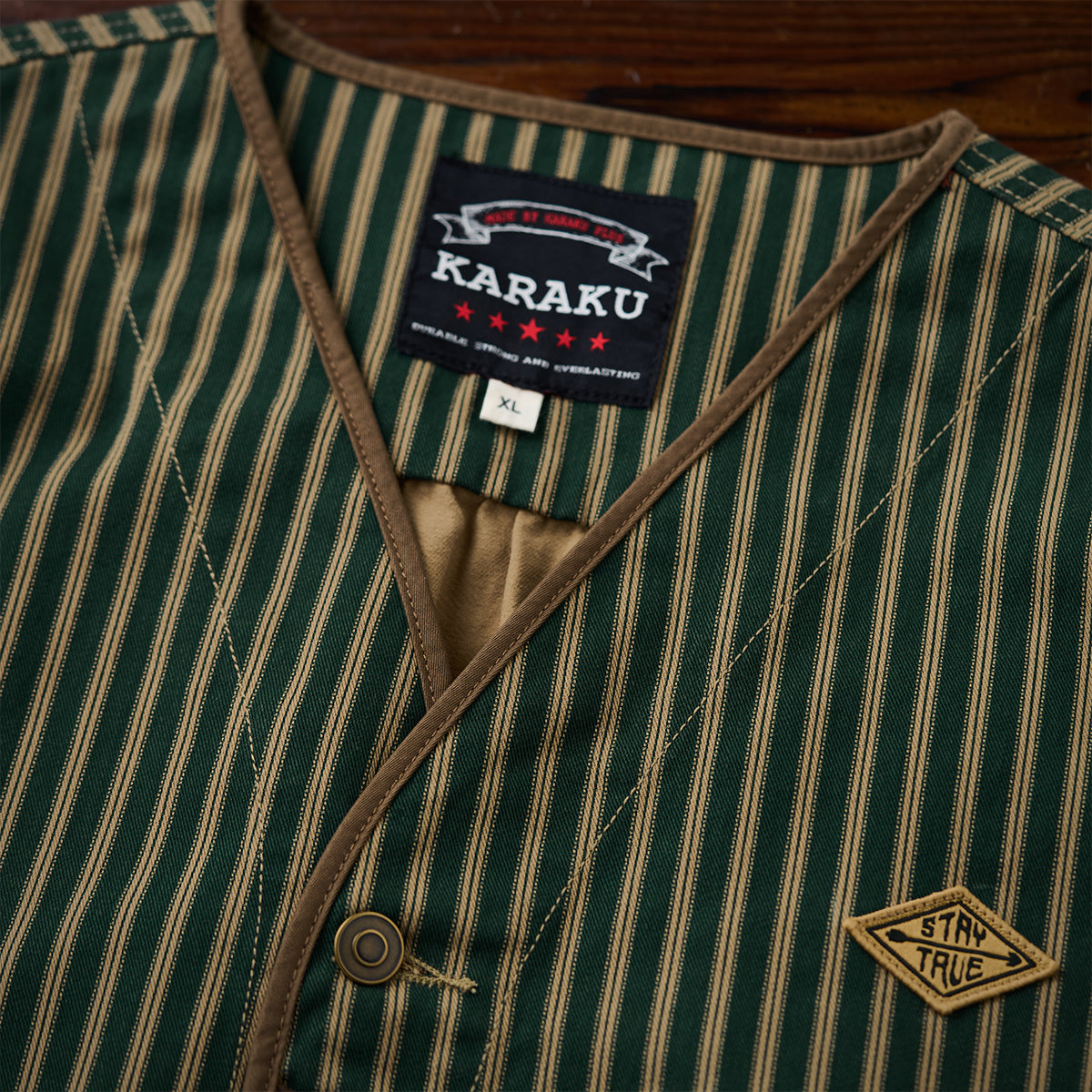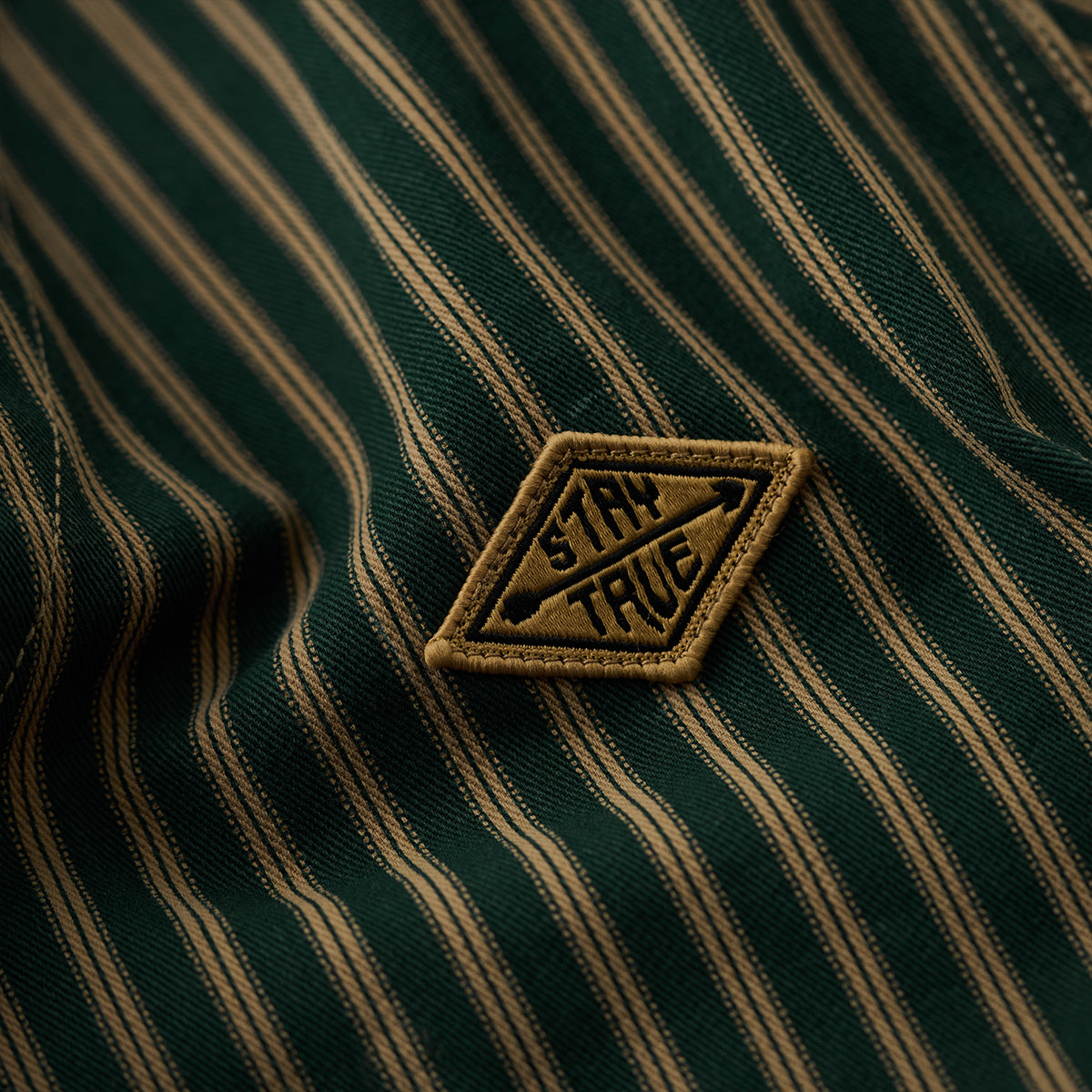 左胸に「STAY TRUE」刺繍ワッペンが付いており、シンプルながらもユニークなポイントになっています。ワッペンの黄色が全体の暗いカラーに対してアクセントとなり、目を引きます。