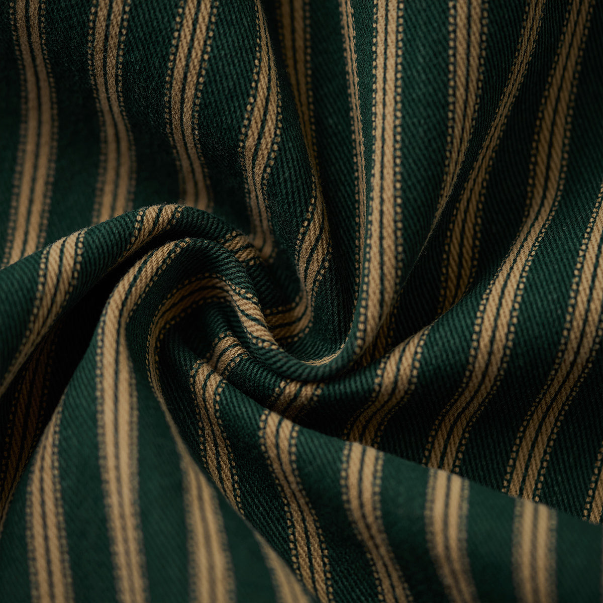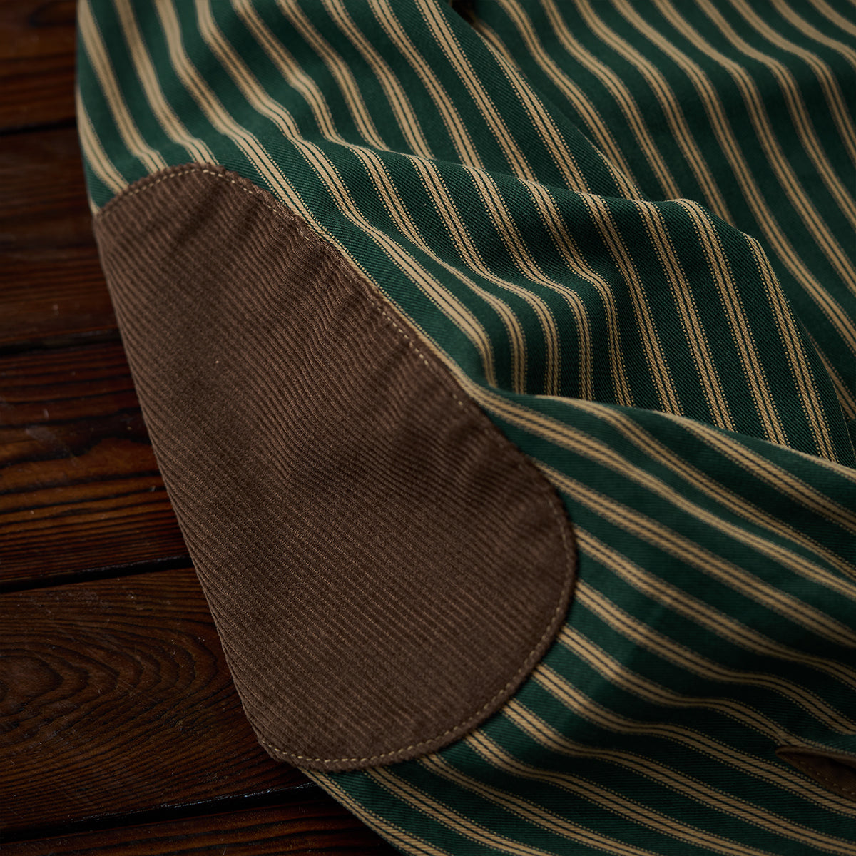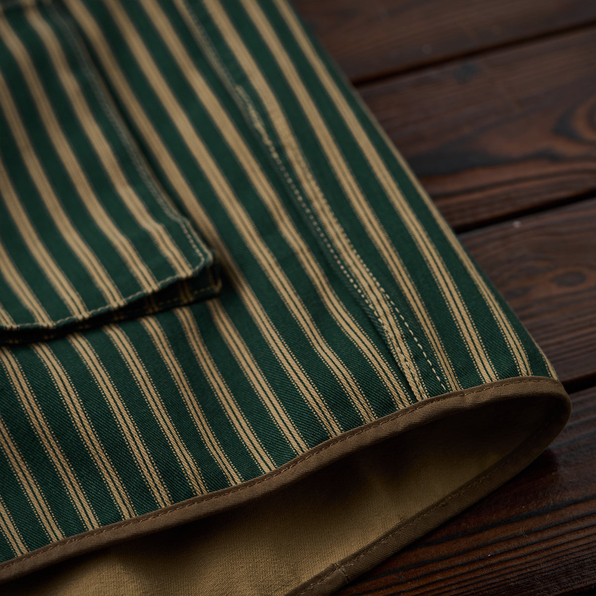 全体に細いストライプ模様を使用し、クラシックで洗練された印象を与えています。グリーン、イエローとブラウンの配色がレトロさを強調しつつ、高級感も感じさせます。