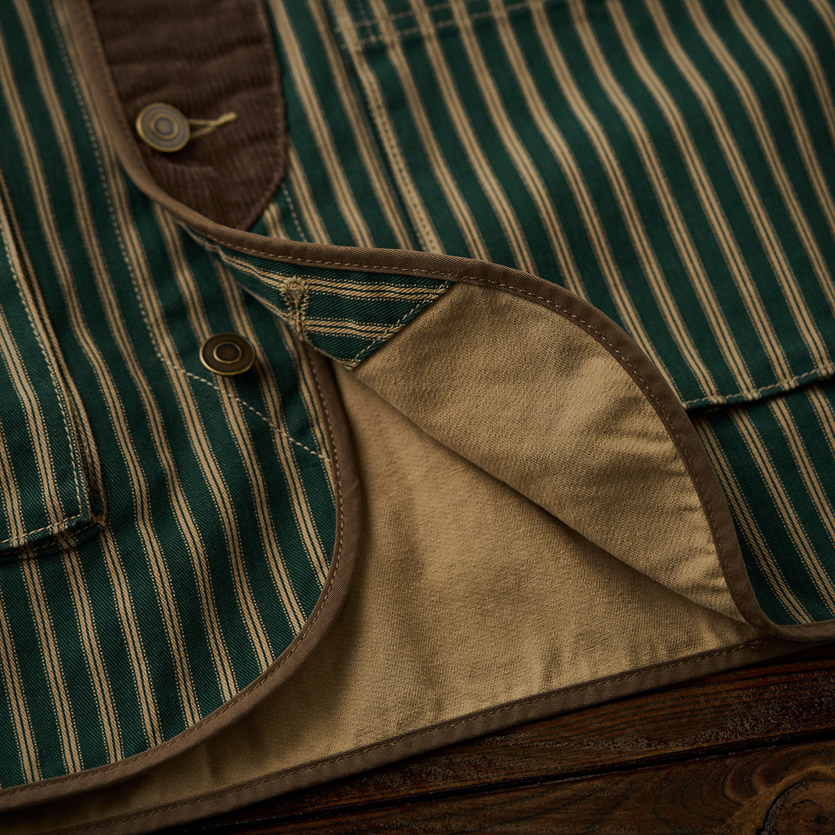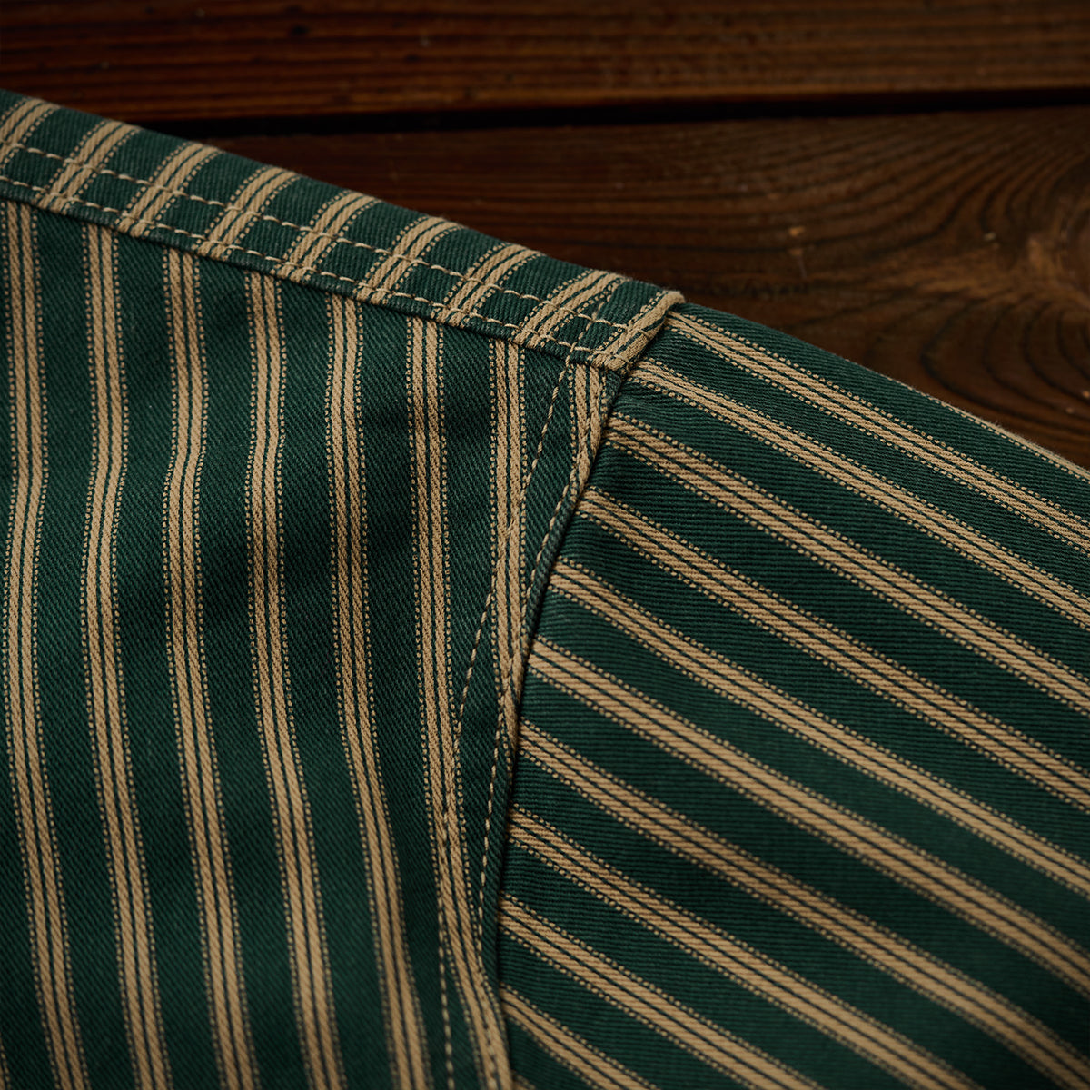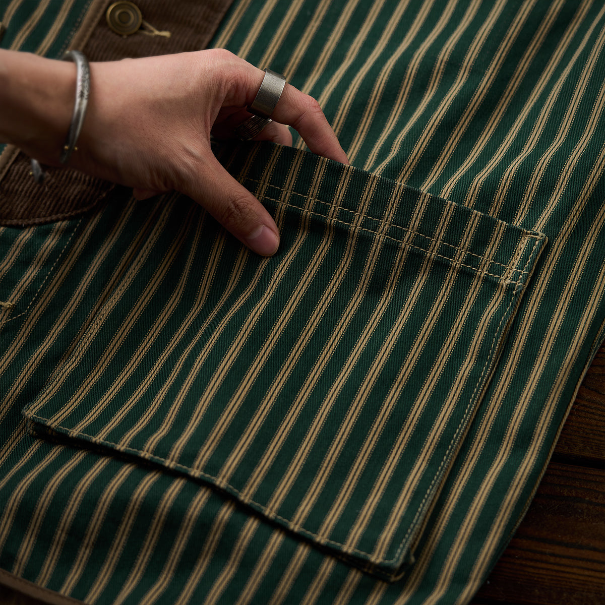 全体に細いストライプ模様を使用し、クラシックで洗練された印象を与えています。グリーン、イエローとブラウンの配色がレトロさを強調しつつ、高級感も感じさせます。