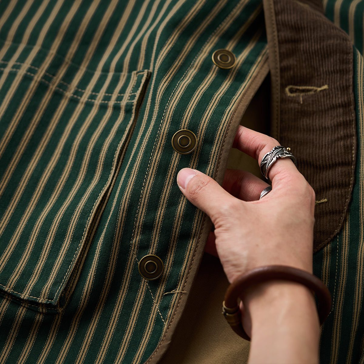 ノーカラーデザインで、カジュアルにもフォーマルにも対応可能な汎用性の高さが特徴です。肘パッチや前立て部分にコーデュロイ素材を使用しています。異素材の組み合わせがデザインの奥行きを生み出し、全体のアクセントになっています。