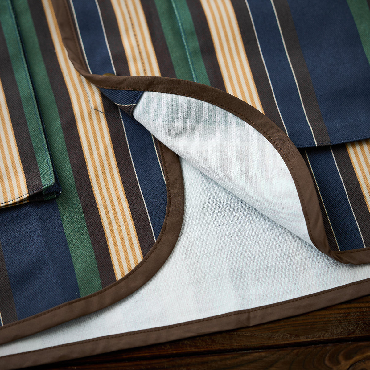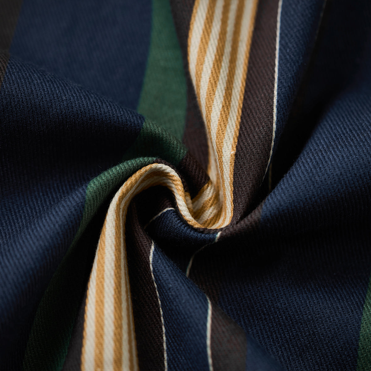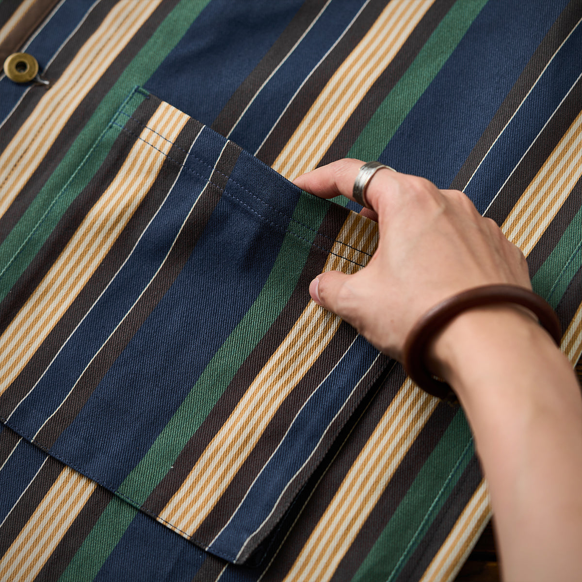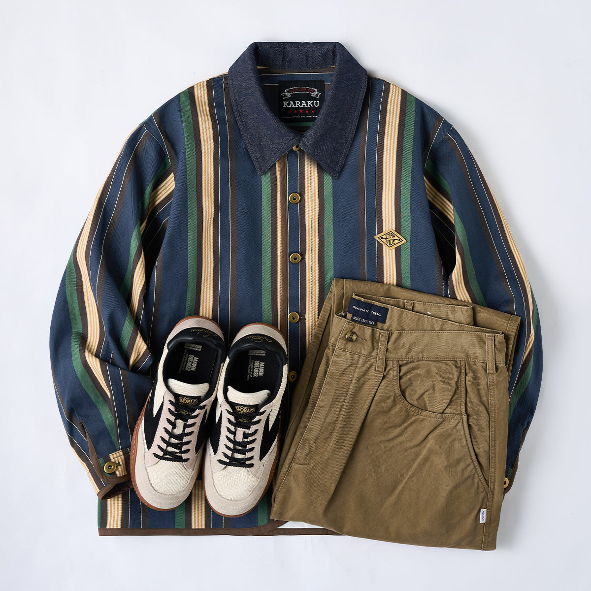 異なる表情を組み合わせたデザインが目を引く、デニム襟切替マルチストライプジャケット。身頃にはリズム感のあるマルチストライプ柄を採用し、襟元にはデニム素材を切り替えることで、程よい無骨さと遊び心をプラスしました。胸元には「STAY TRUE」の刺繍ワッペンを配置。“自分らしさを貫く”というメッセージを、主張しすぎないアクセントとして落とし込み、スタイリングにさりげないストーリー性を添えています。シルエットは程よくゆとりを持たせ、インナーを選ばず羽織りやすい設計。シャツやスウェットの上にさらっと重ねるだけで、コーディネートの主役になる一着です。デイリーから休日スタイルまで、幅広く活躍する存在感あるジャケットに仕上げました。