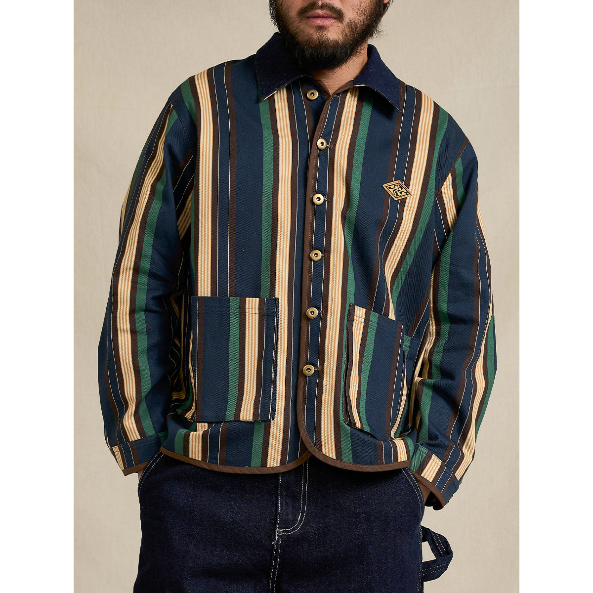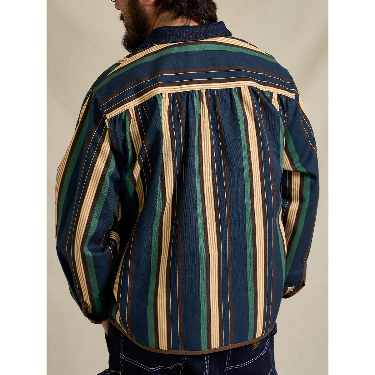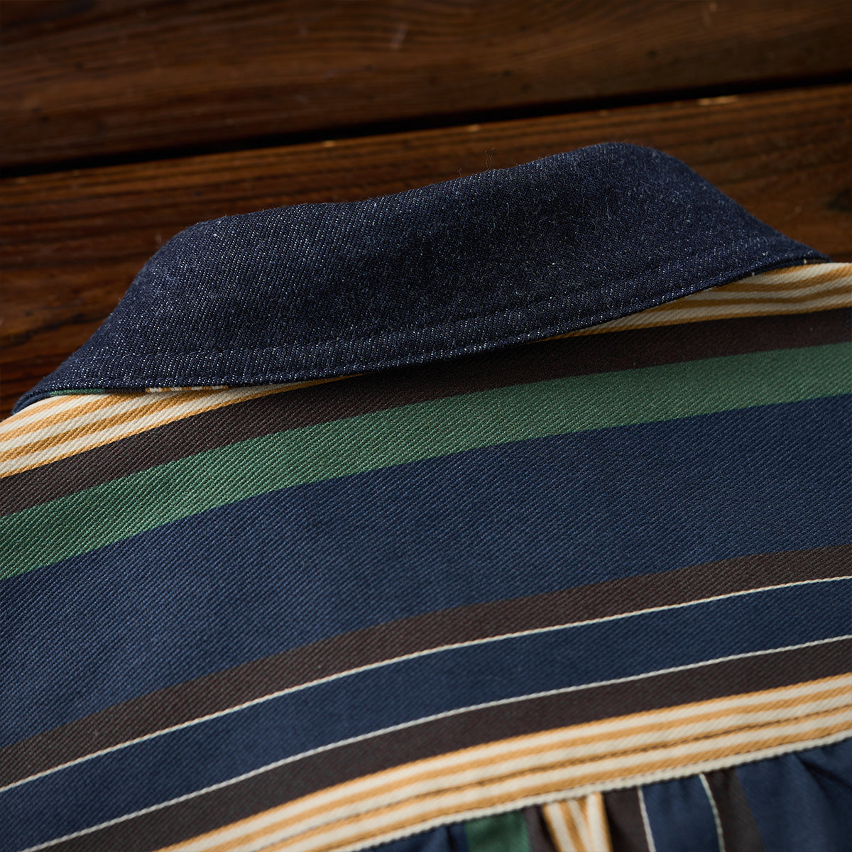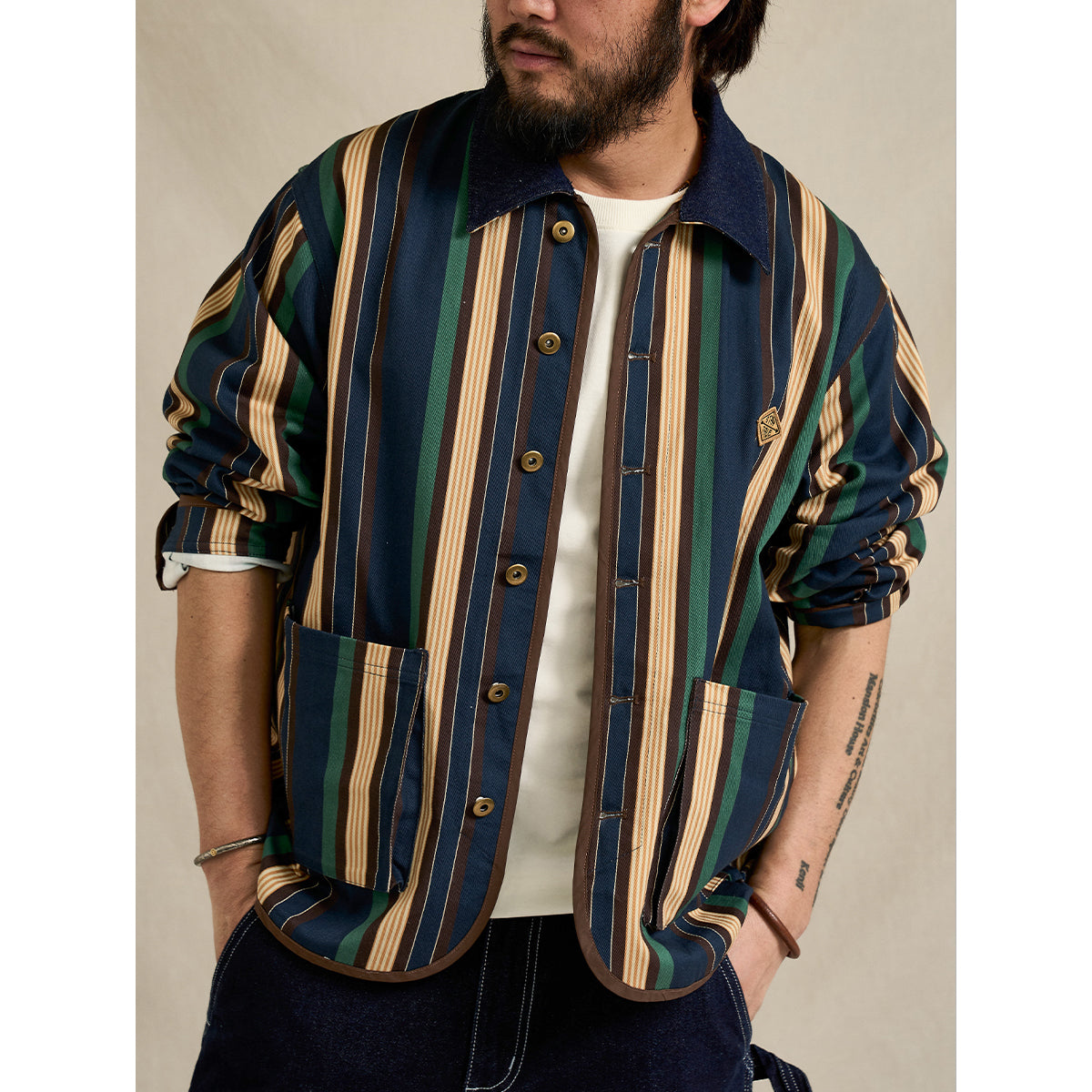 「STAY TRUE」刺繍ワッペン デニム襟切替マルチストライプジャケット
