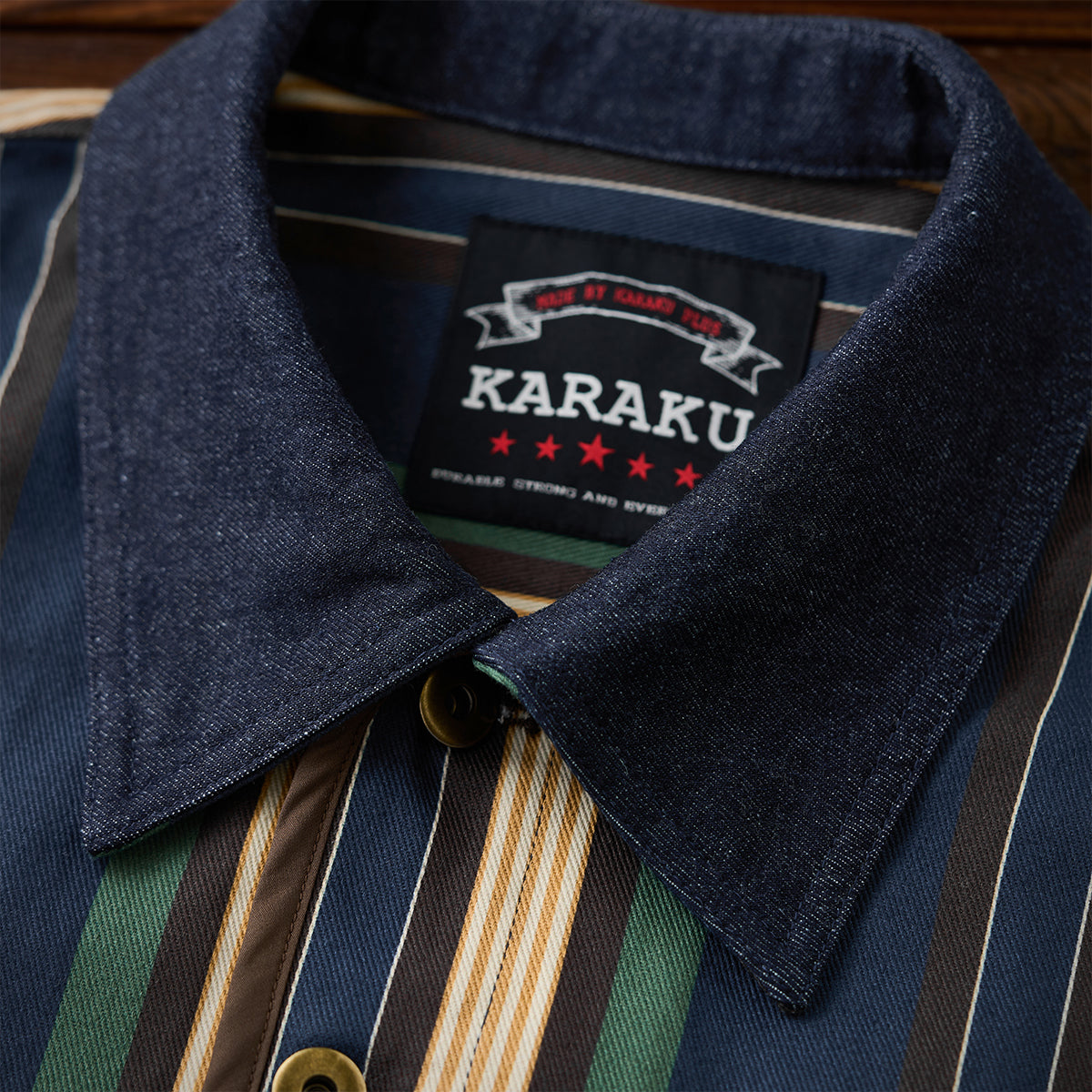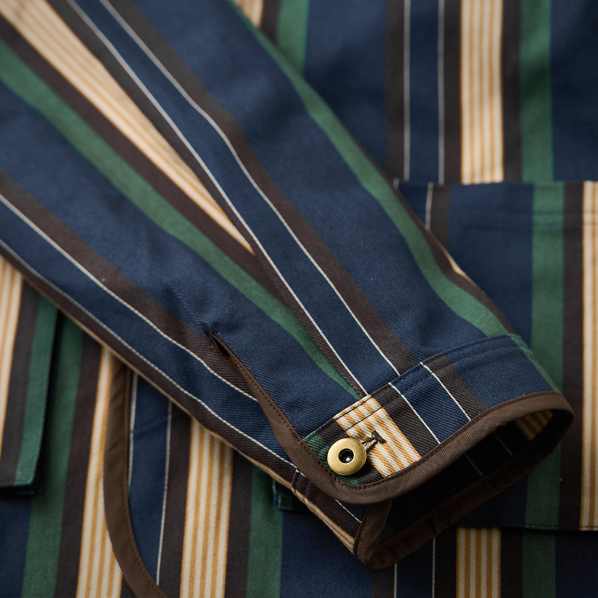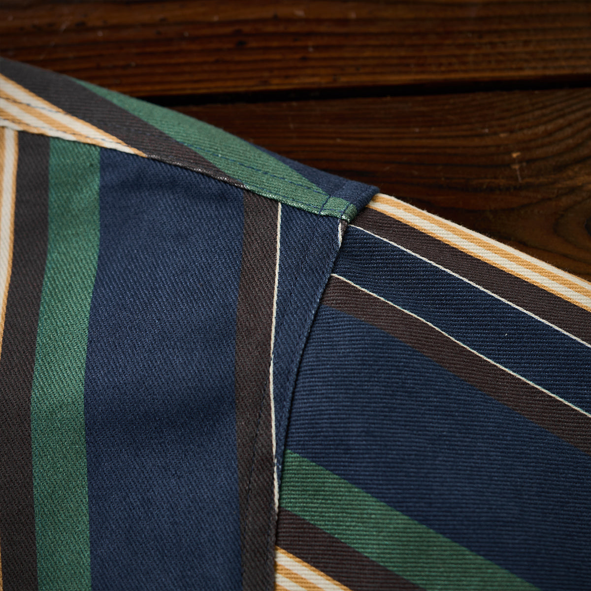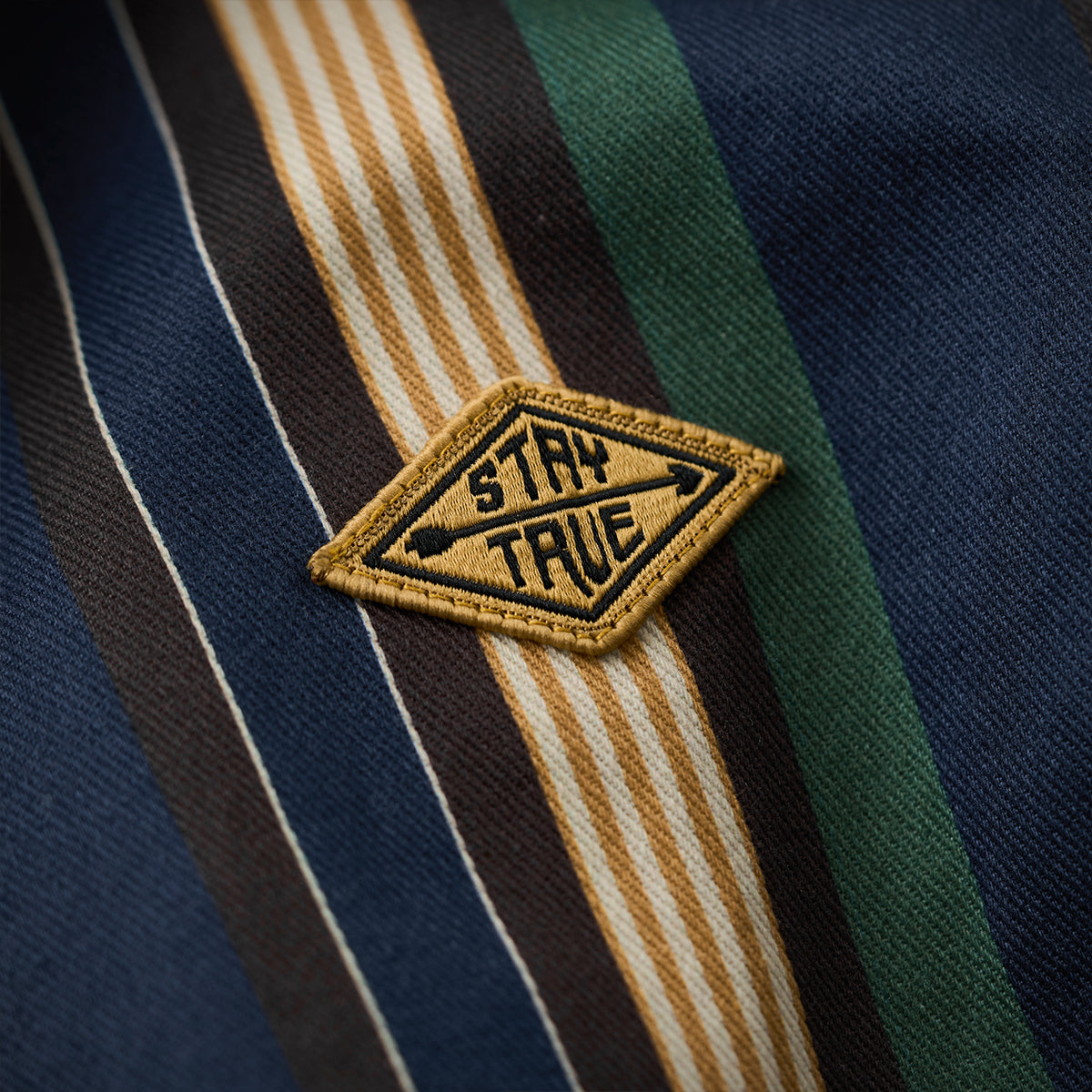 「STAY TRUE」刺繍ワッペン デニム襟切替マルチストライプジャケット