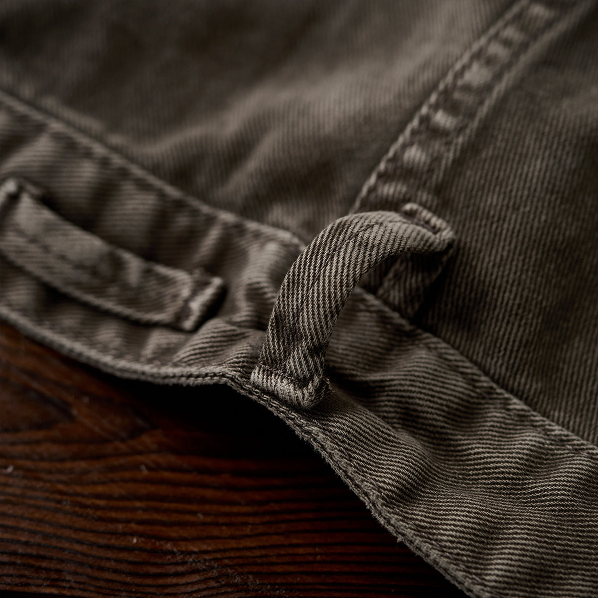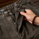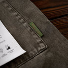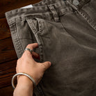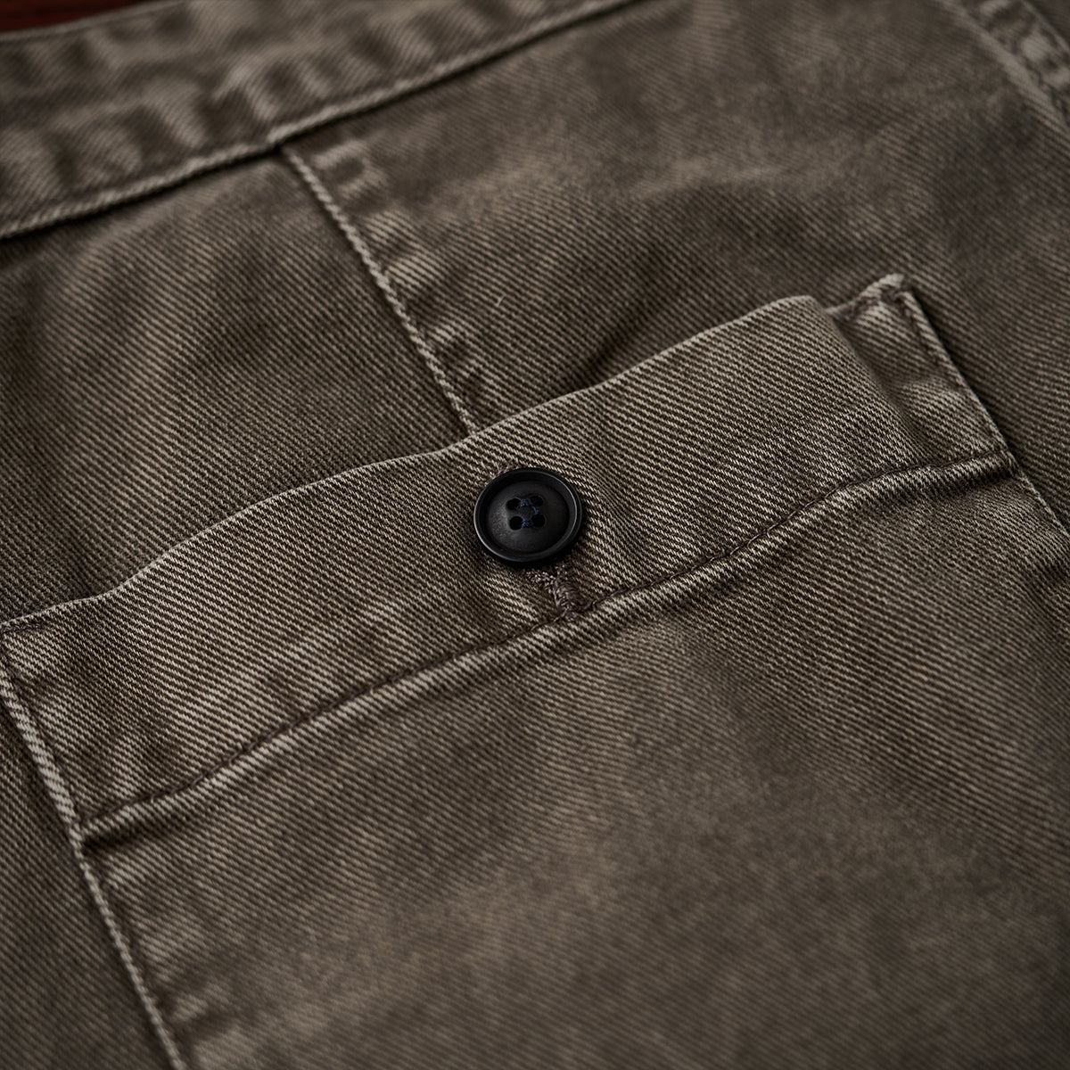 ジッパーフライを採用しています。実用性を重視しており、日常使いに適しています。ベルトループがしっかりと配置されており、ベルトとの組み合わせが可能です。フロント側には斜めに入ったスラッシュポケットがあります。バックポケットは大きめで、ボタンが付属し、収納物をしっかり固定できます。