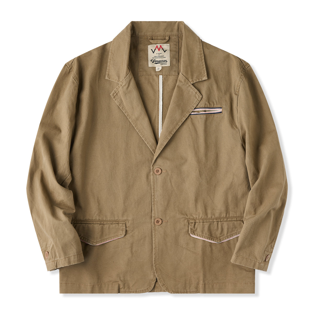 フロント部分には複数のボタンがあり、実用性とデザイン性が両立されています。胸ポケットとフラップ付きの腰ポケットがあり、実用性が高いデザインです。ポケットの縁に施された赤と白のステッチがデザインの特徴として際立っています。