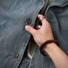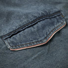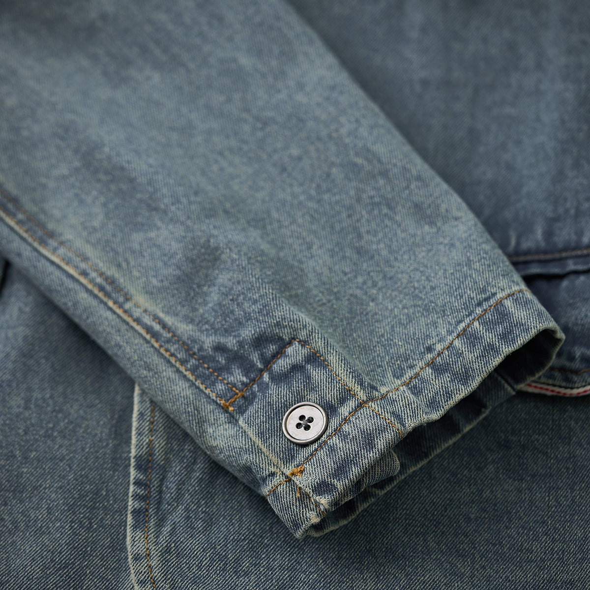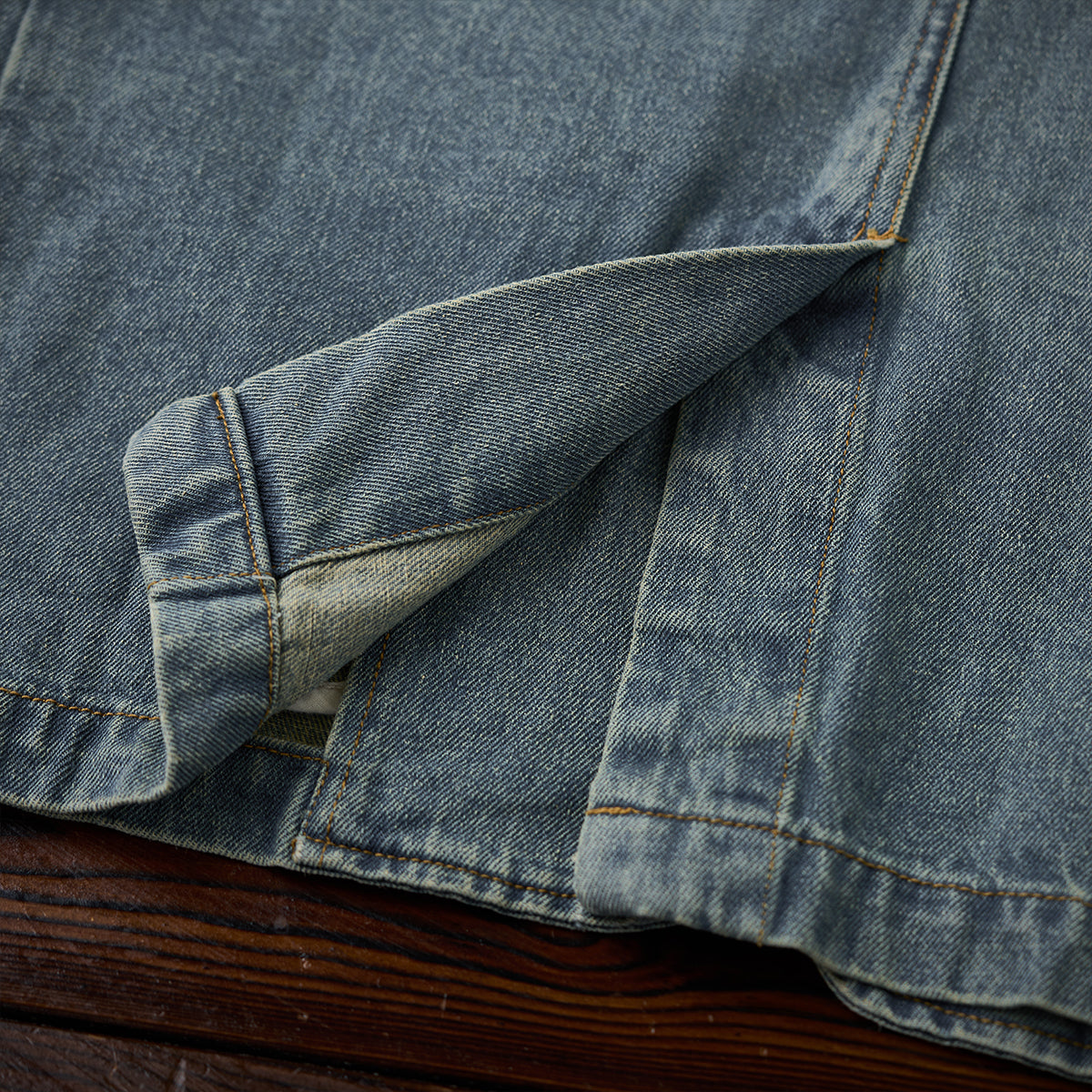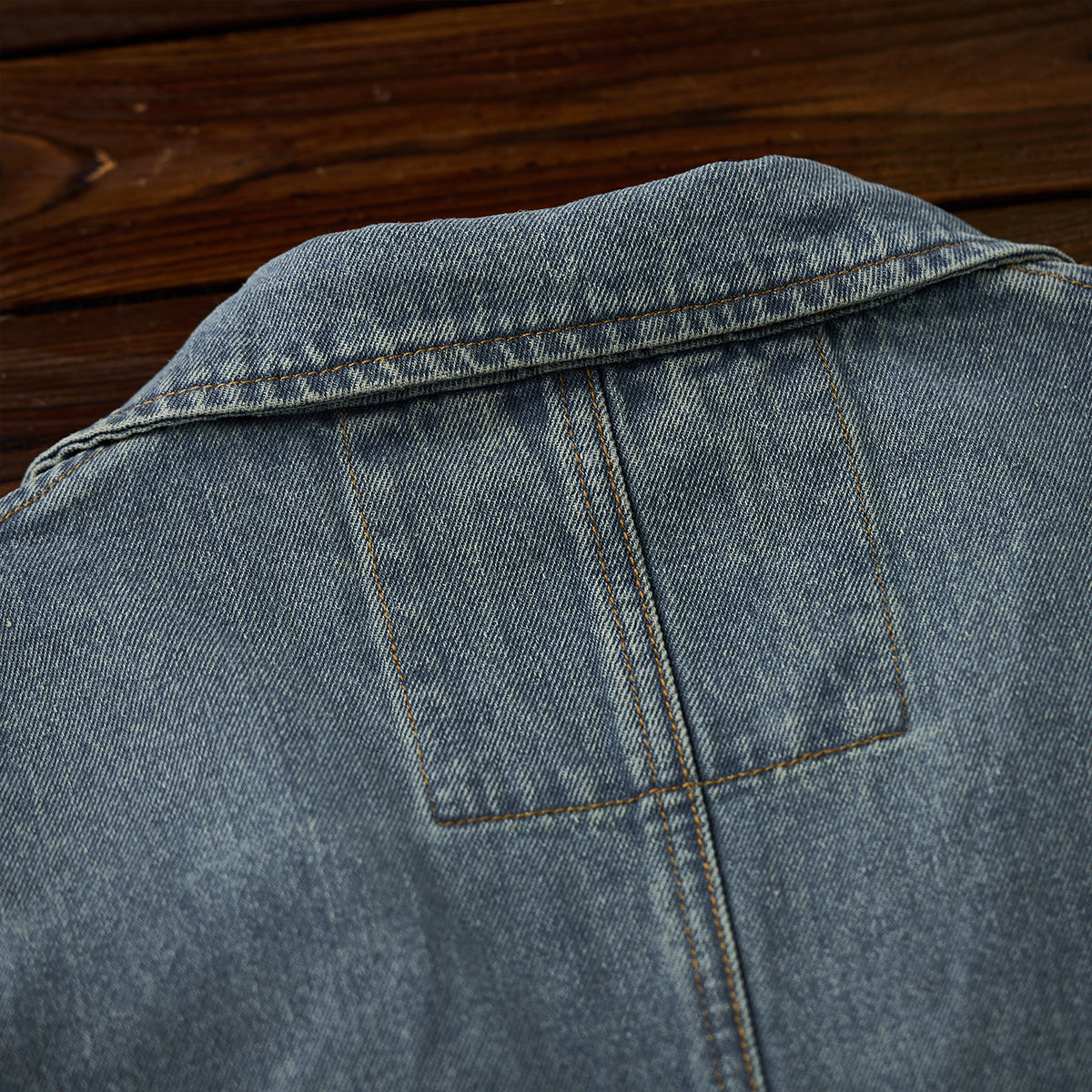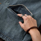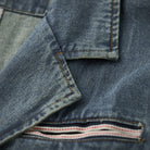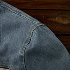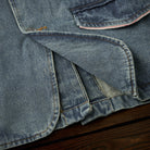 デニム生地で、カジュアルさと耐久性が強調されています。ヴィンテージな風合いを持ち、ウォッシュ加工が施されていることで柔らかい印象を与えます。