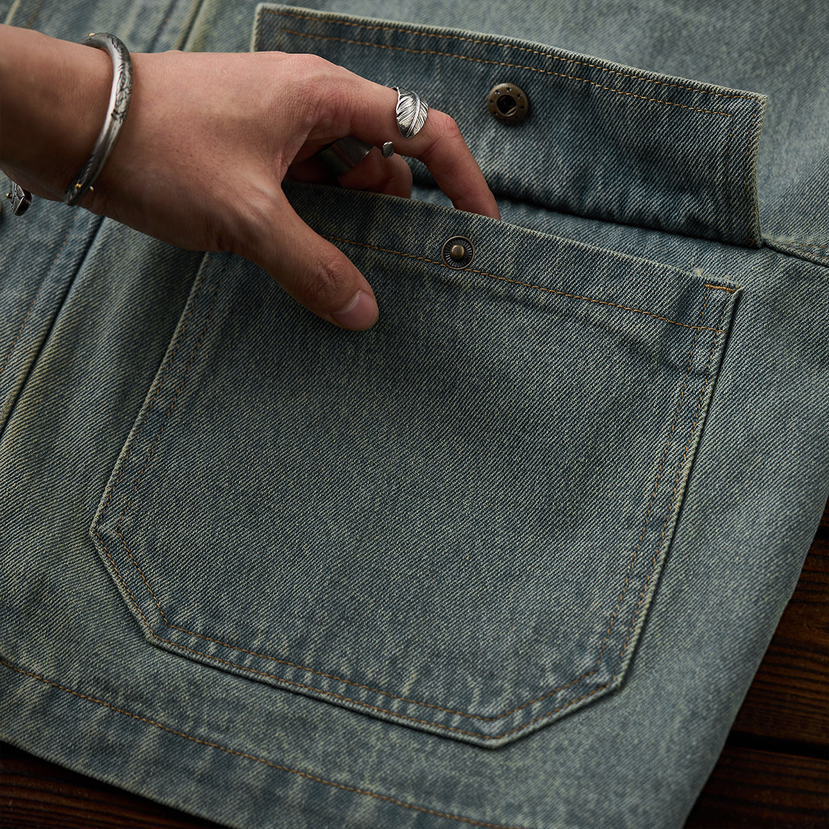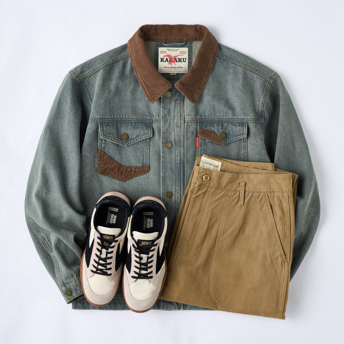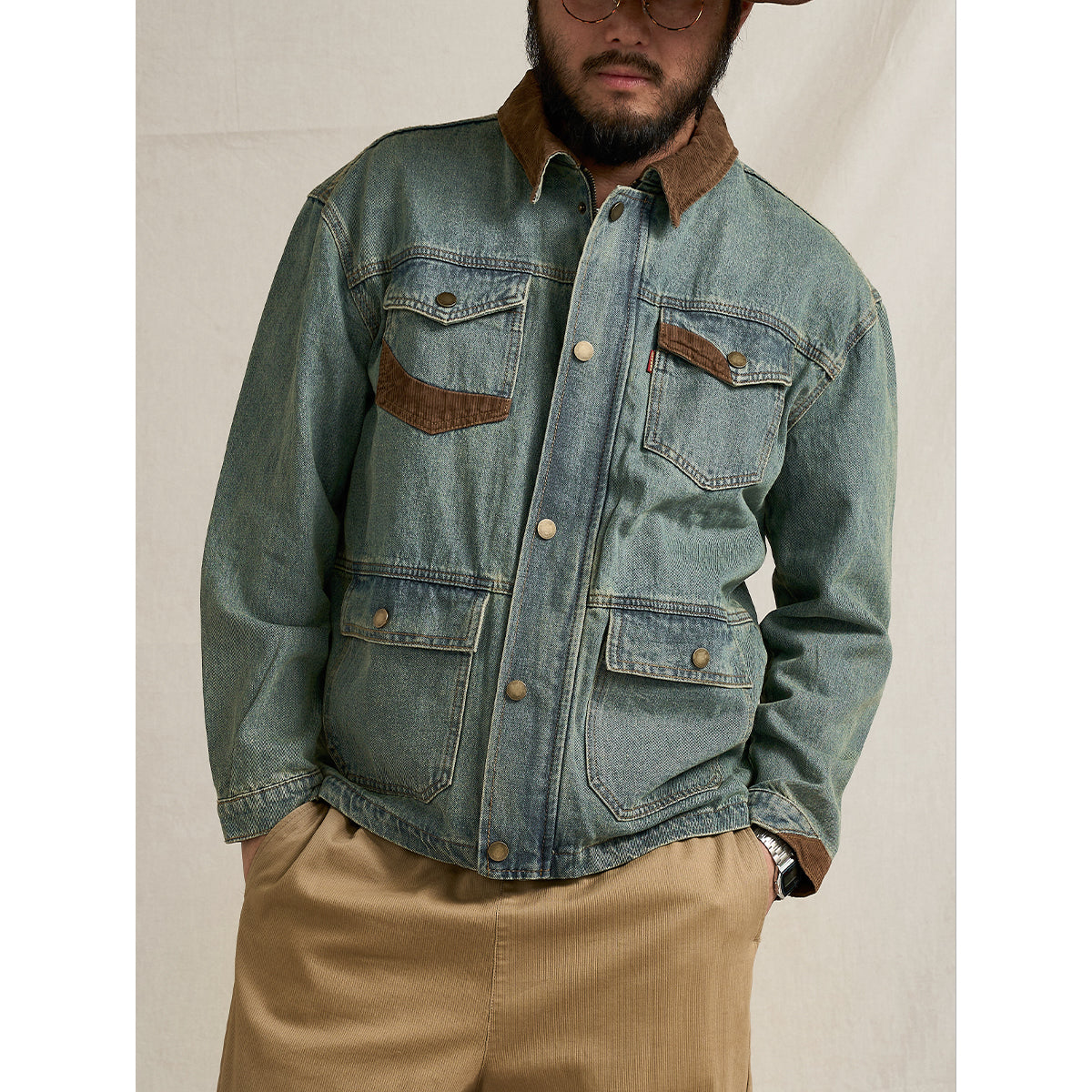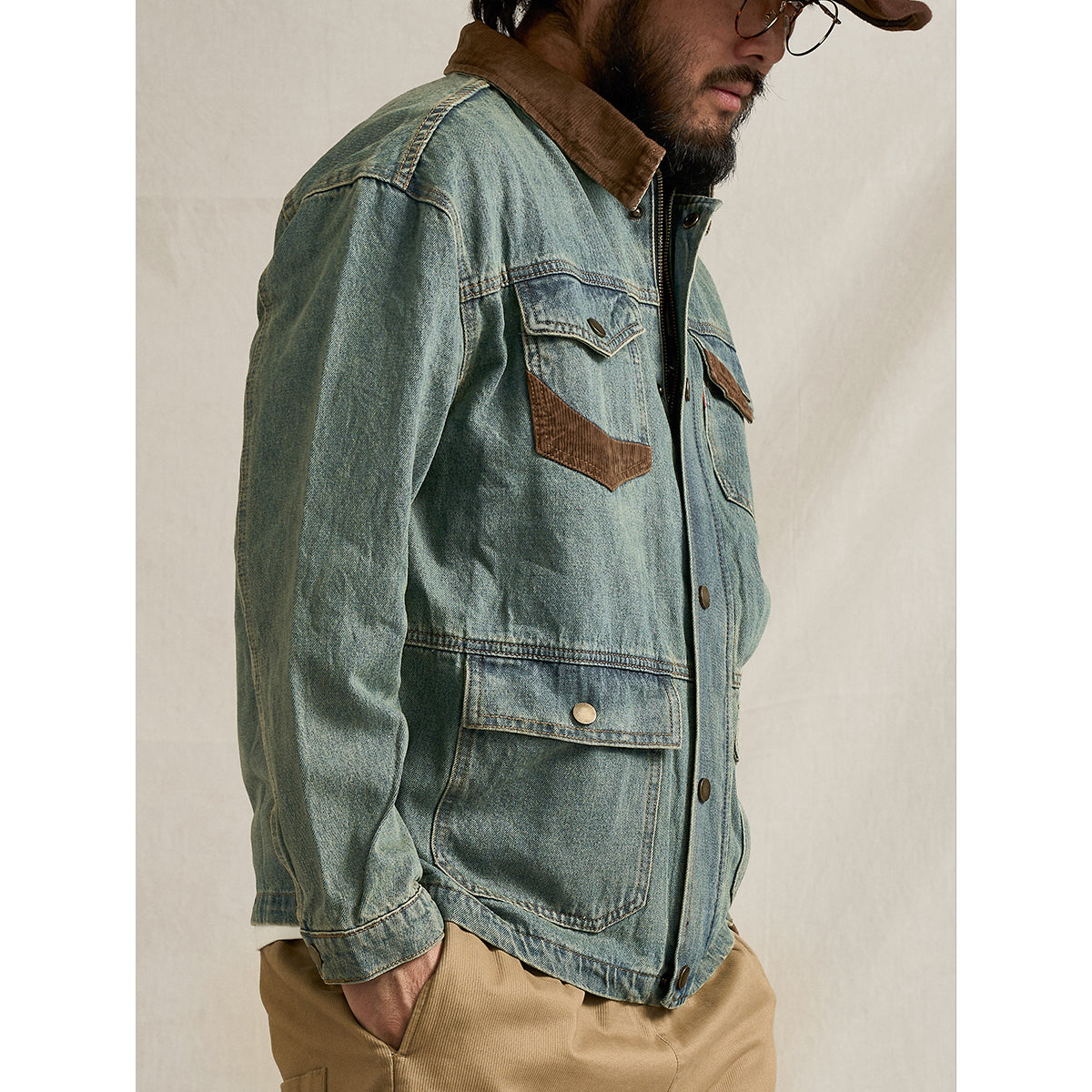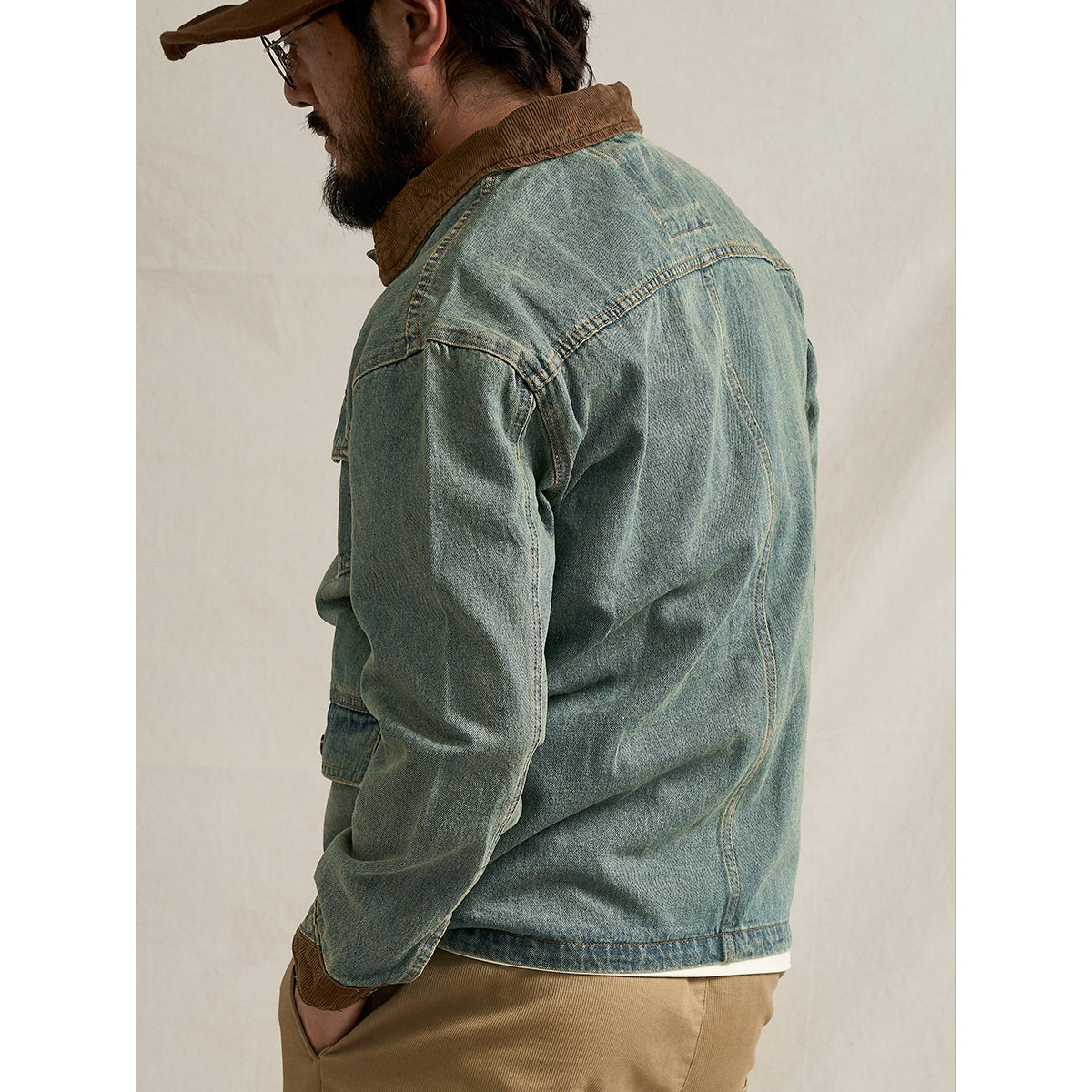 タフなデニム素材をベースに、襟、袖口、ポケットにはコーデュロイを切り替えた、表情豊かなワークジャケット。異素材のコントラストが奥行きを生み、無骨さの中にどこか温もりを感じさせる一着に仕上げています。フロントには実用性に優れた4ポケット仕様を採用。ワークウェア由来のディテールを踏襲しつつ、現代的なバランスで再構築することで、日常使いしやすいデザインに。しっかりとした生地感ながら、着込むほどに風合いが増し、経年変化も楽しめるのが魅力。ワークとカジュアルを自然に行き来できる、頼れるデニムジャケットです。