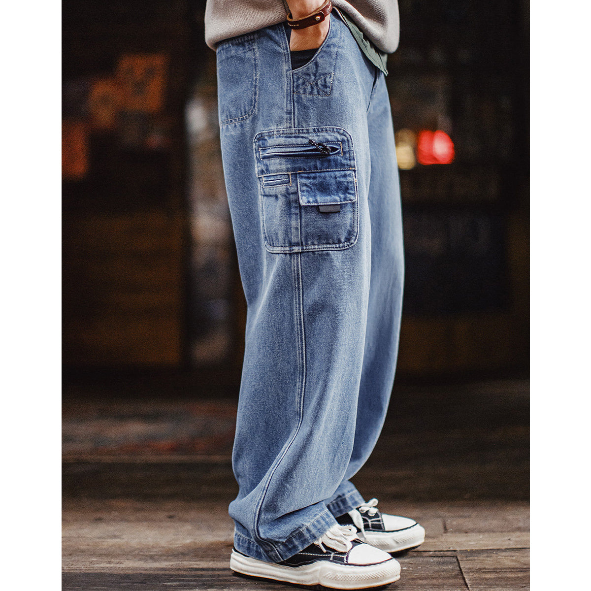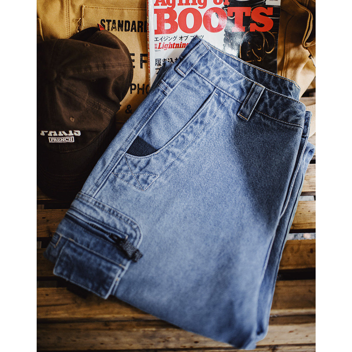 カーゴポケット付き 10.5ozツイルウォッシュデニムパンツ