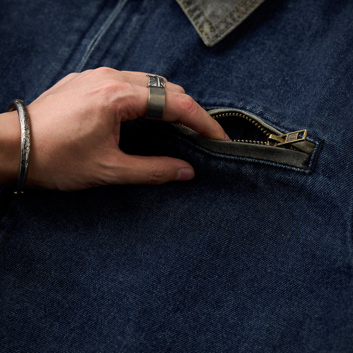 【予約】袖異素材切替 マルチポケット付きデニムスタジャン