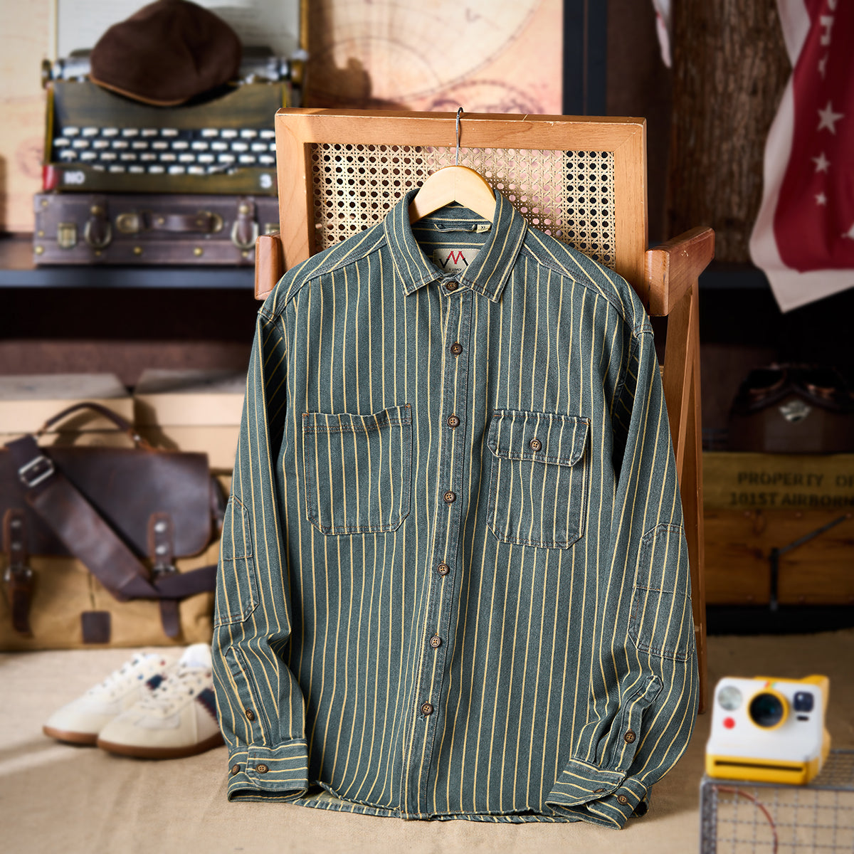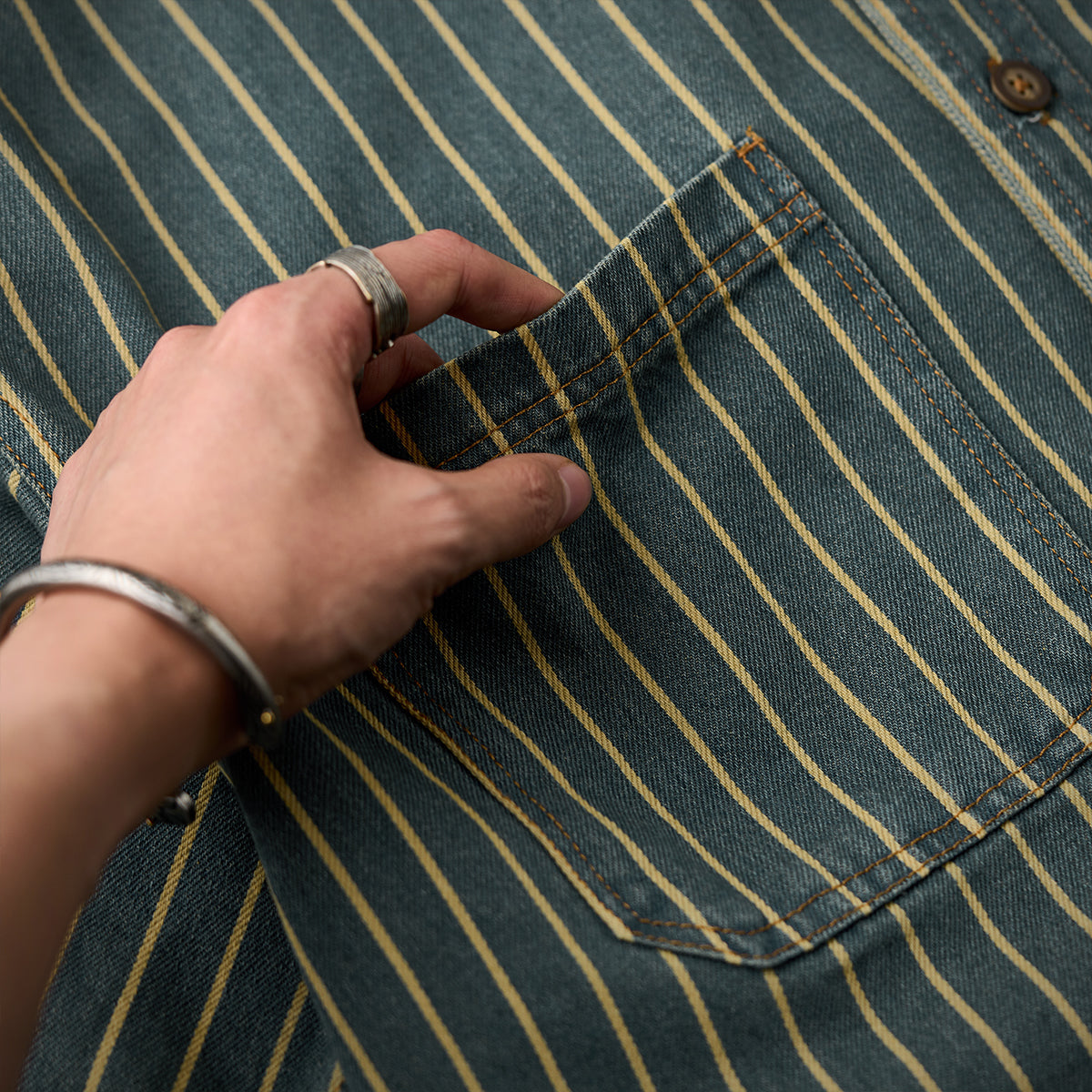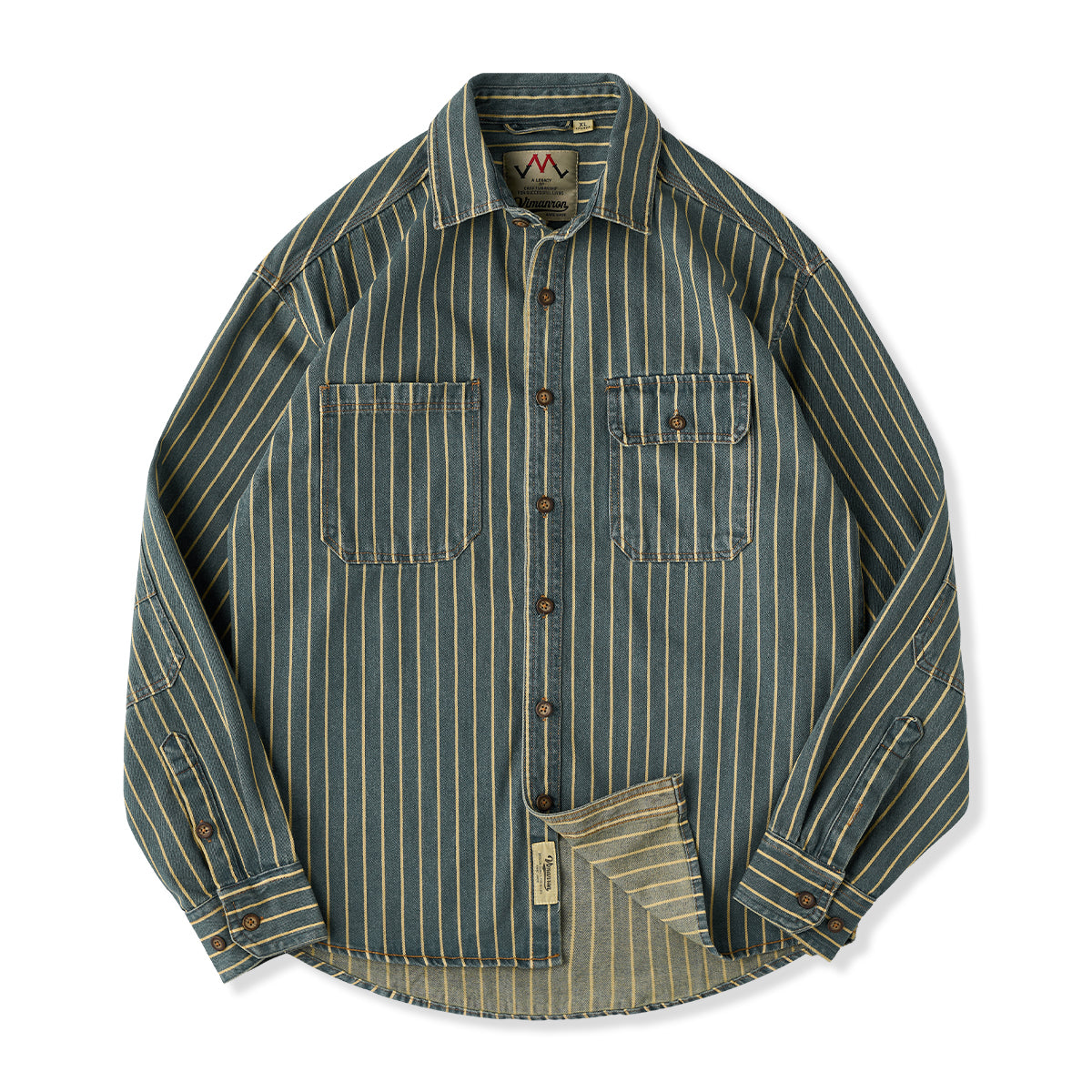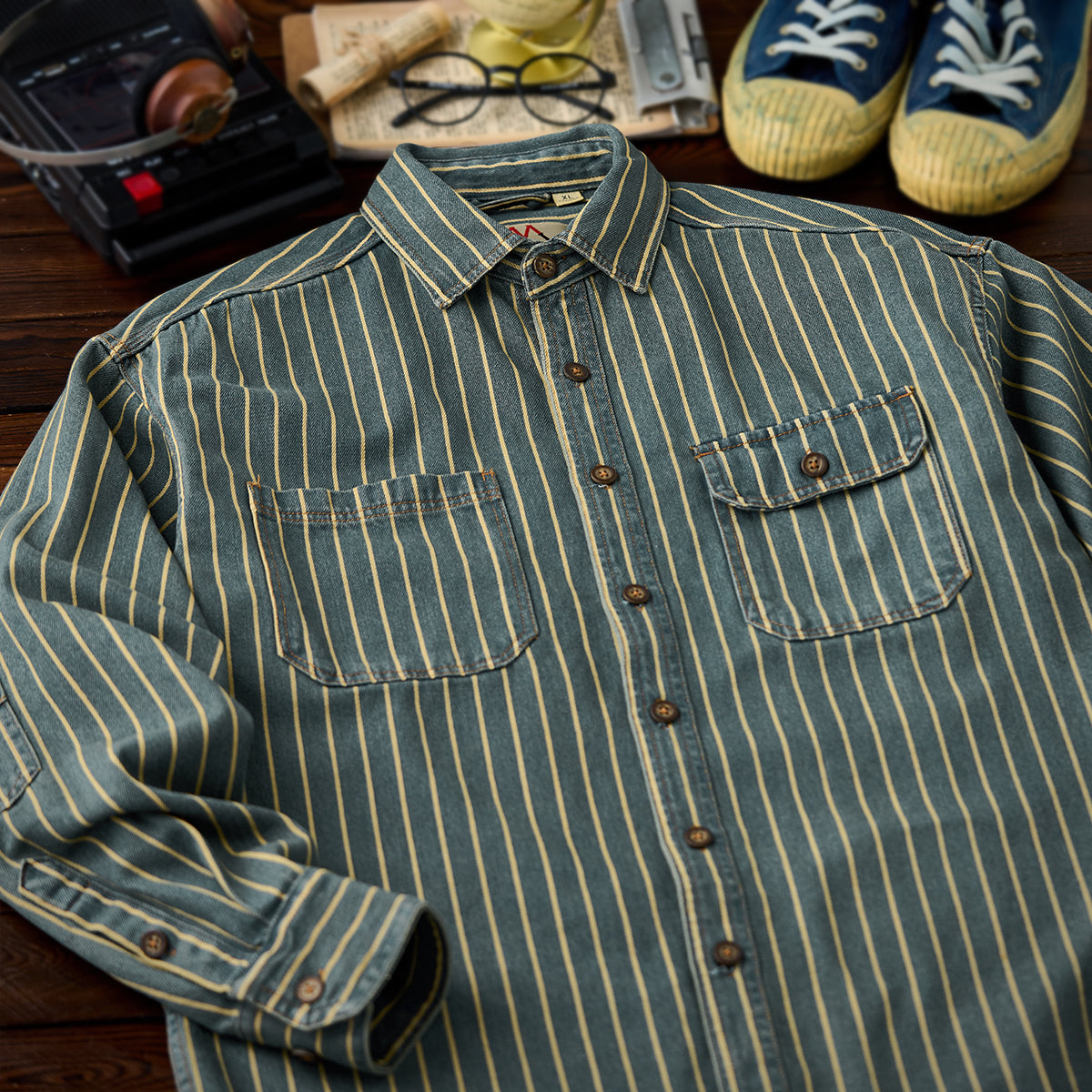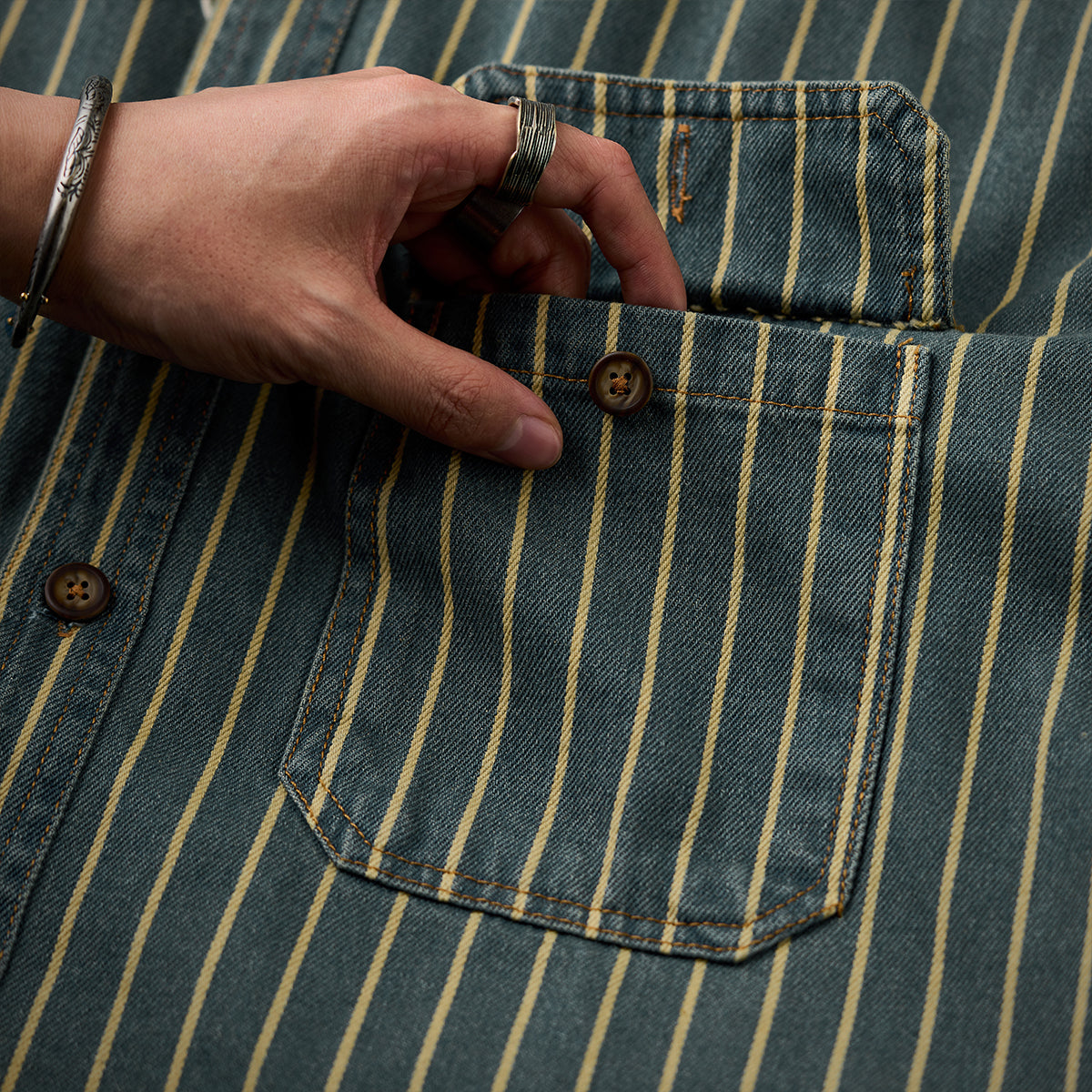 ガチャポケ付き ストライプ柄ウォッシュド加工デニムワークシャツ